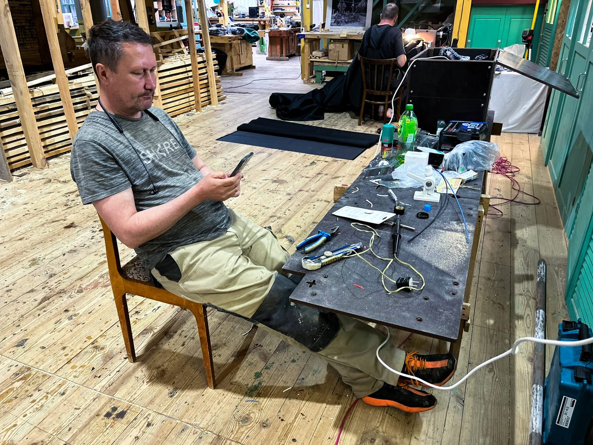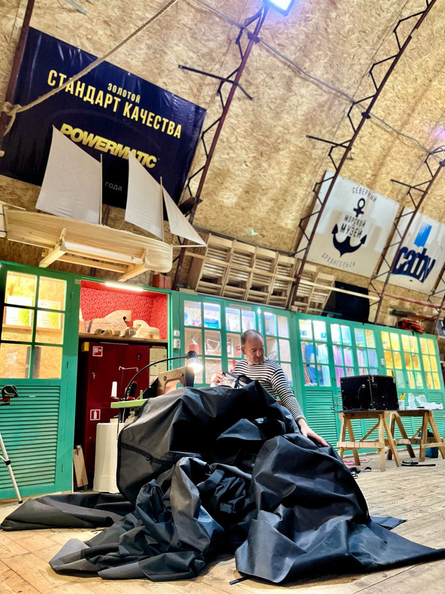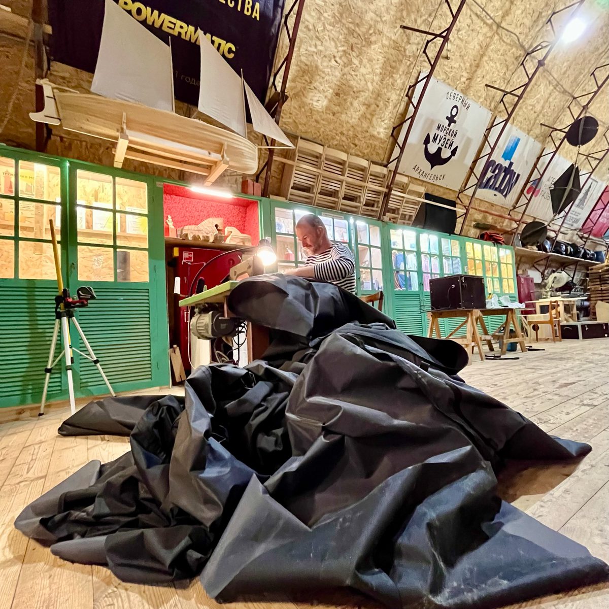 Костя Ярочкин шьёт тент для «Матеры». Со стороны похоже на платье для Бастинды.