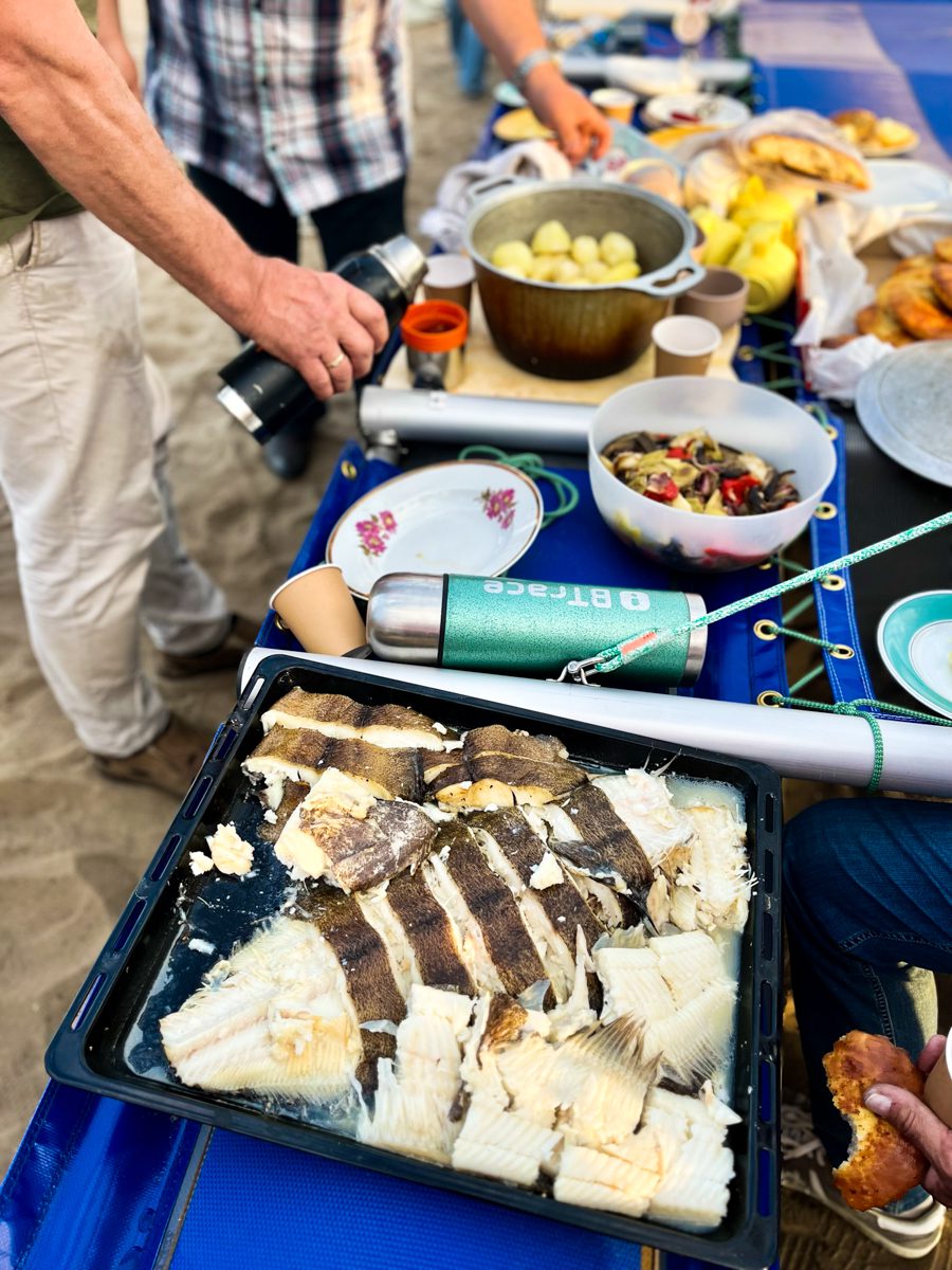 Потом собираем катамаран на пляже у ж/д моста и ужинаем на берегу.