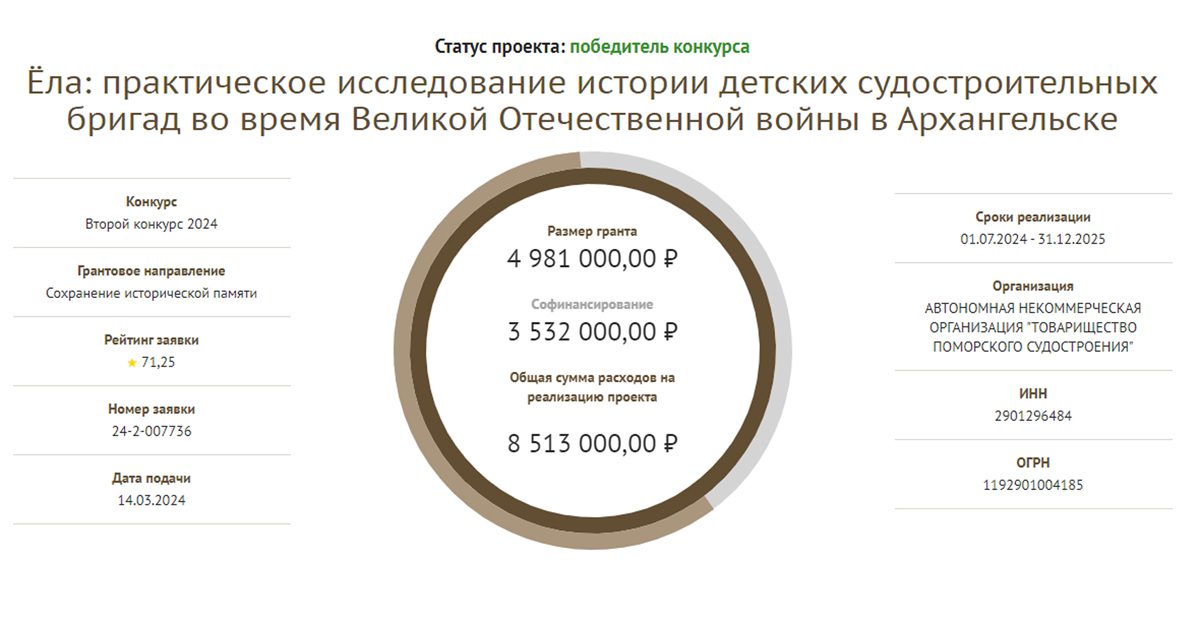 Мы благодарим Фонд Президентских грантов за оказанную поддержку и надеемся на отклик всех архангелогородцев и жителей Севера, которым небезразлична судостроительная история и морская культура нашего города!