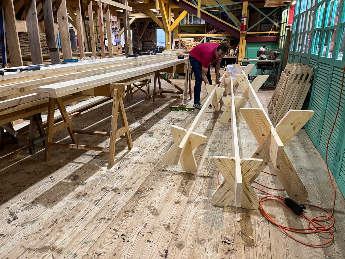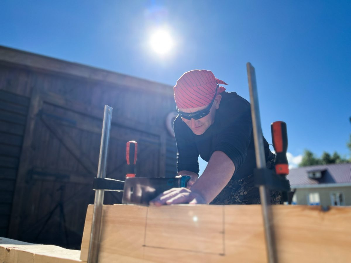 Временами между кенозерскими и мезенскими походами по верфи вихрем проносятся Миша Крупенин с Олей Кузнецовой. За время своих приездов Миша успевает встретить туристов, провести экскурсий, собрать снаряжение в новы поход, немного построить шхуну и соянку, сколотить столы со скамейками и дать несколько интервью. Ай да Миша!