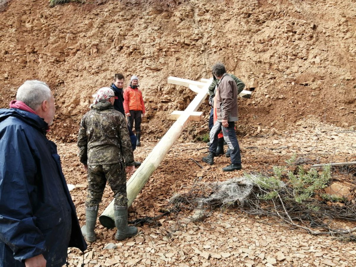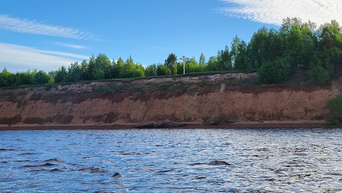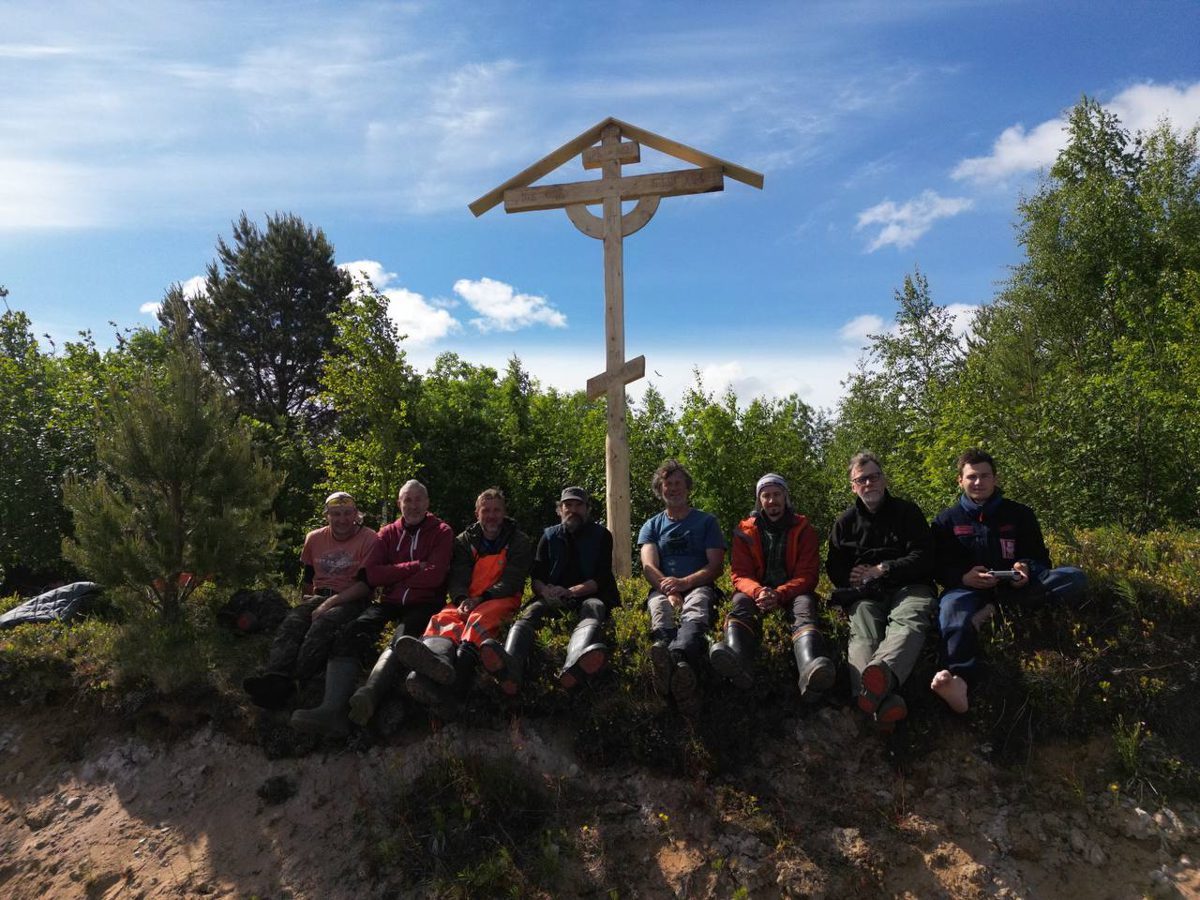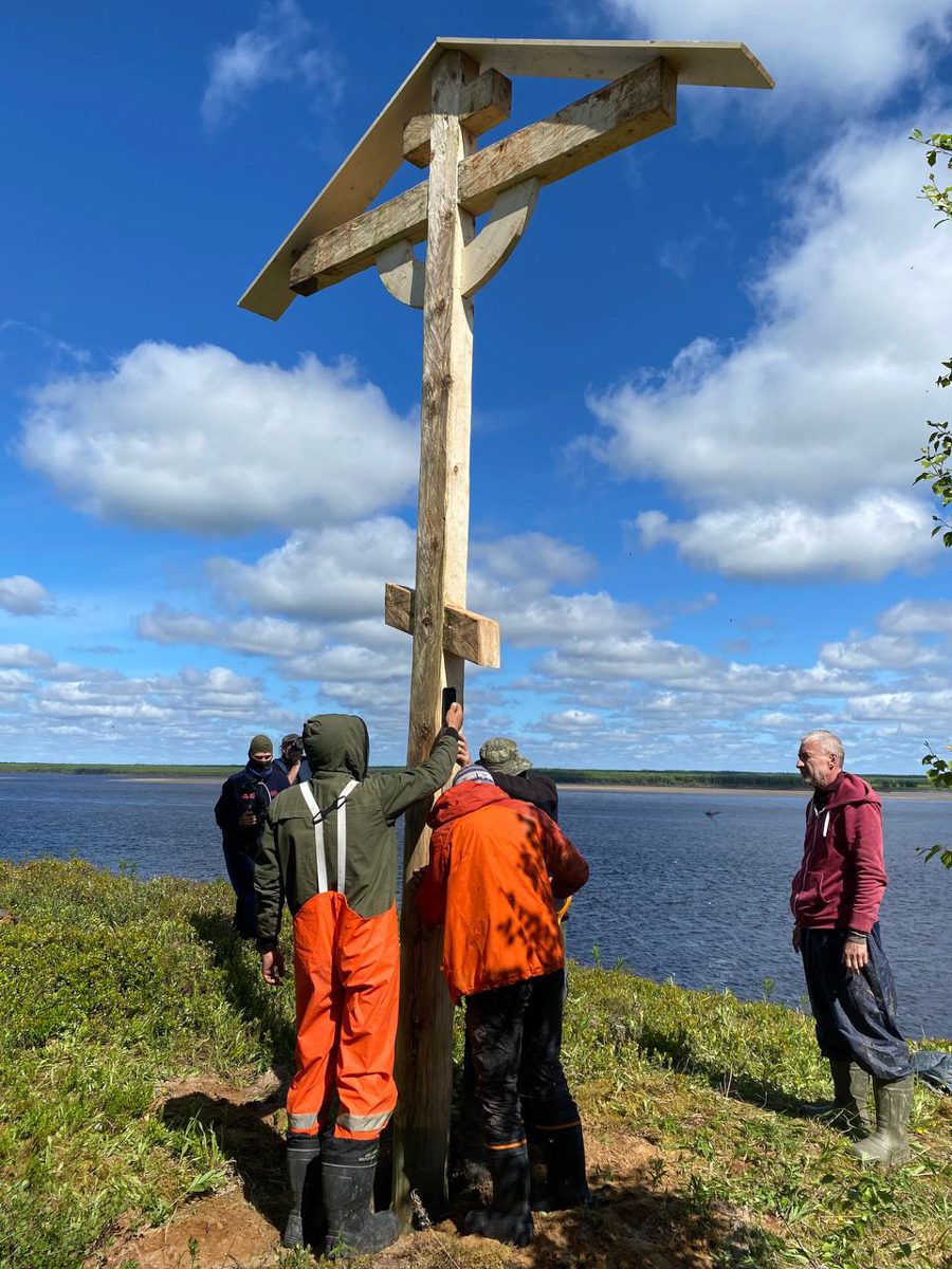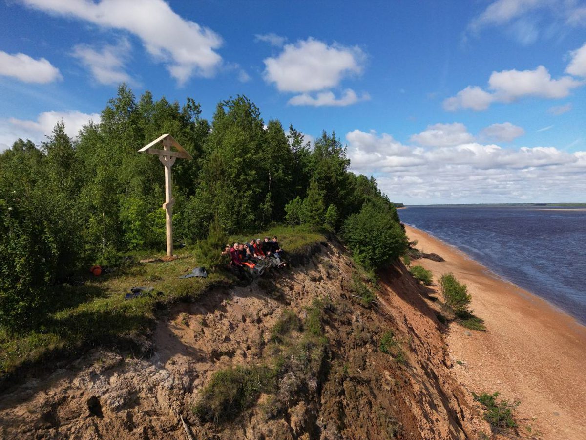 1500, поставили крест на высоком берегу поселка Каменка. Пришлось тащить его на высокий угор. Наконец-то сбылись наши планы поставить хоть один крест на Мезени.