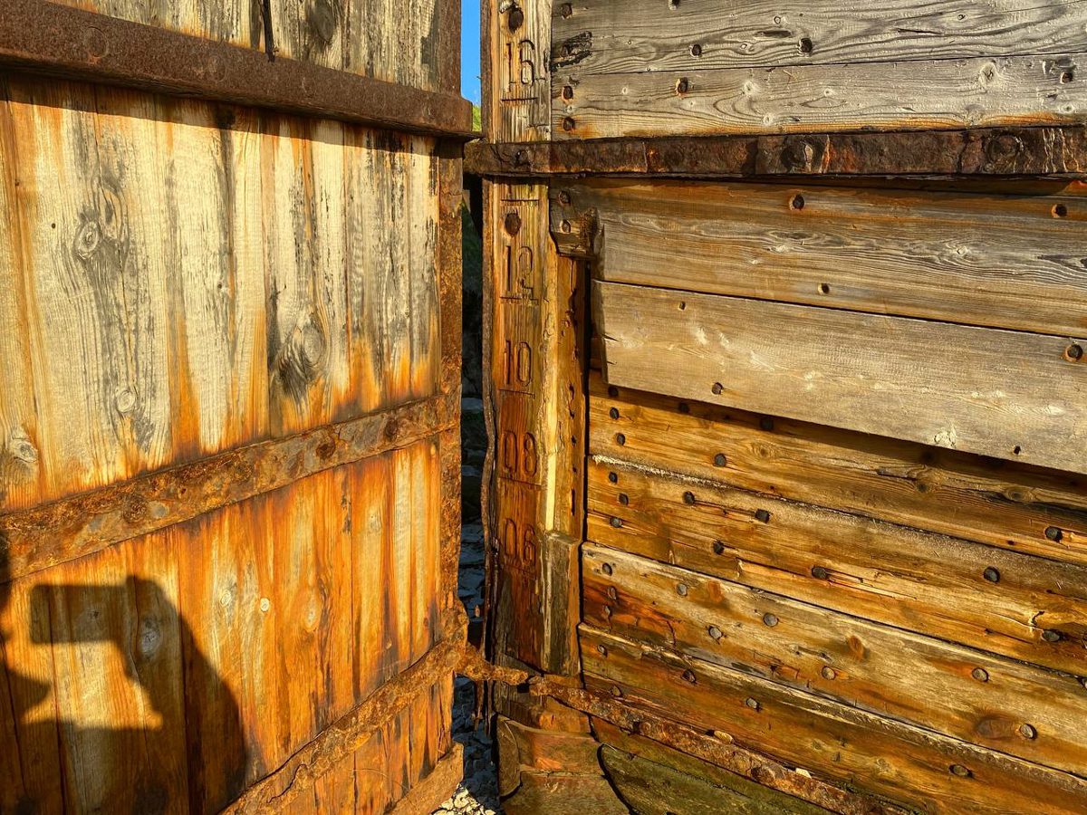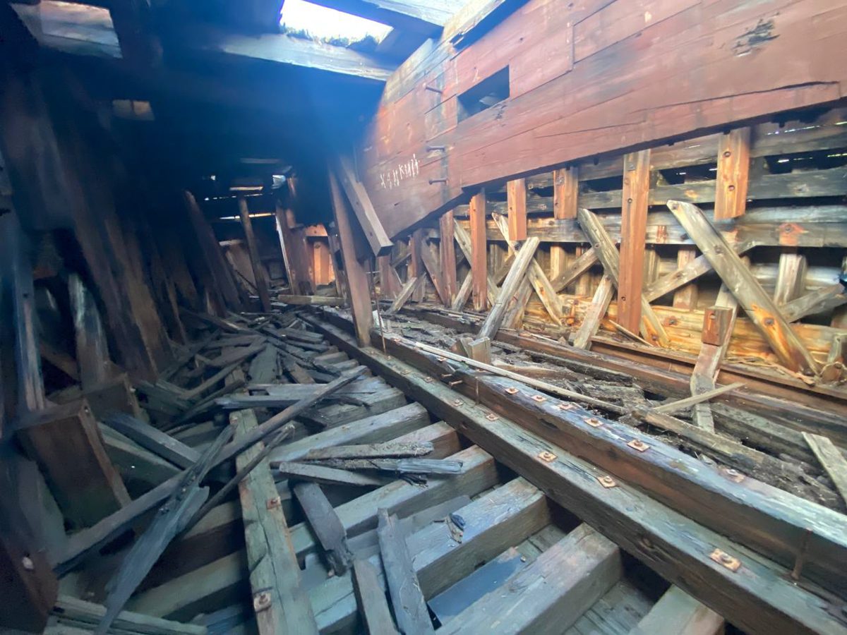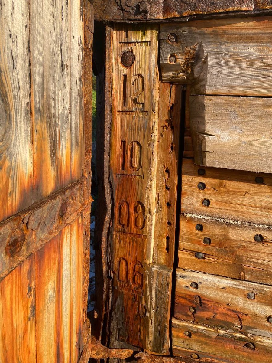 Обнаружили течь в месте крепления первого набоя правого борта к форштевню. Будем пытаться поставить конопатку из бинта.
