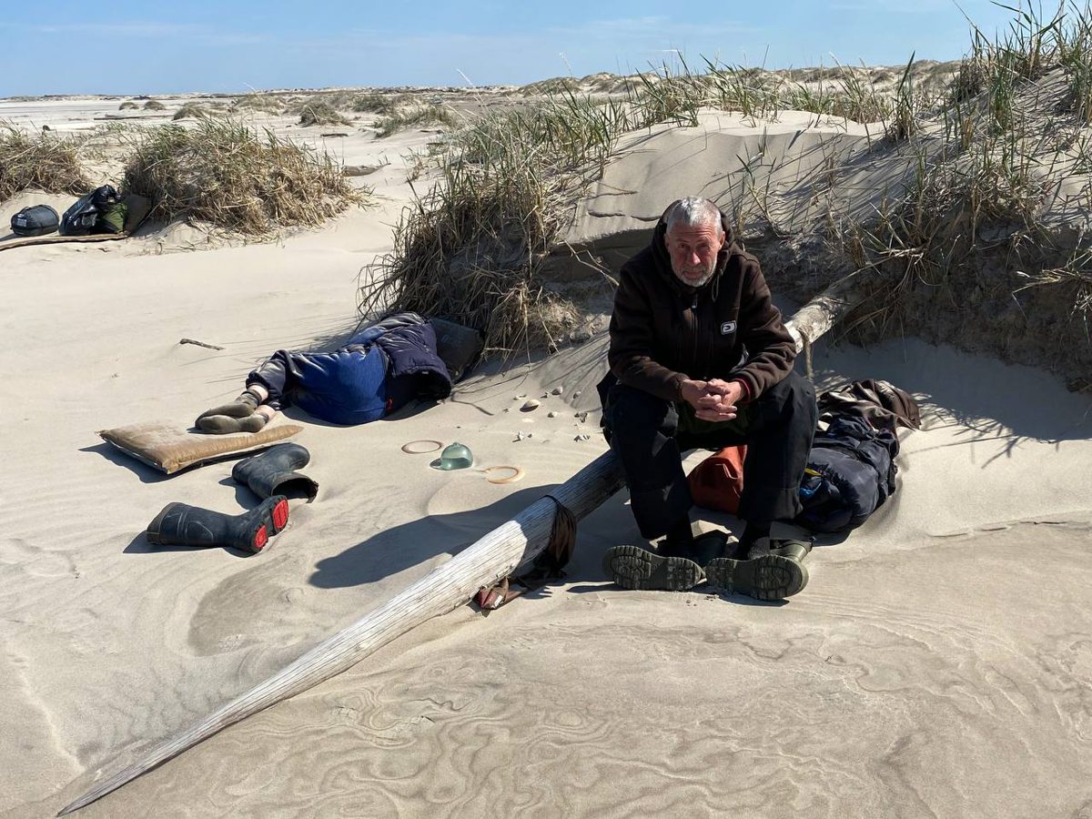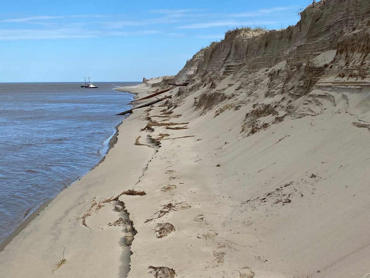 2000, ветер подворачивает, и мы можем лавироваться длинными галсами – продольными вдоль берега. Как только отодвигаемся от берега, начинается волна. Приходится возвращаться. Берег высокий, обрывистый, в снегу. Красивые оттенки песка.