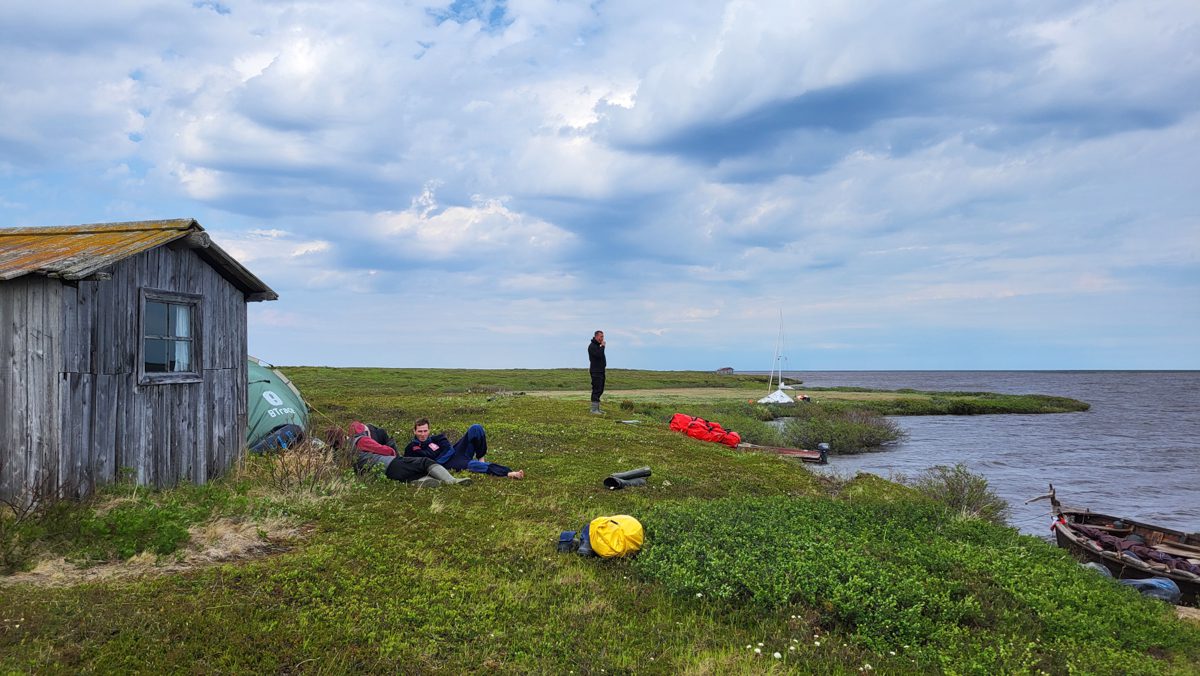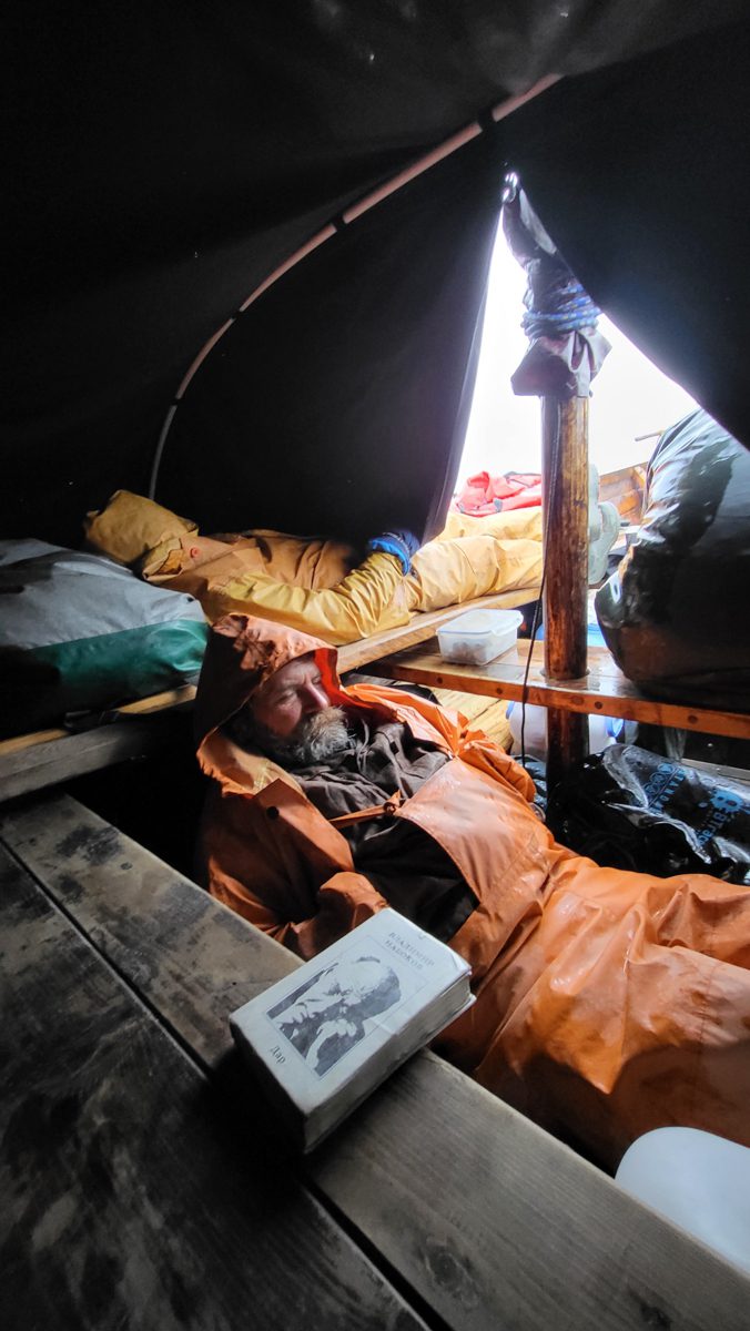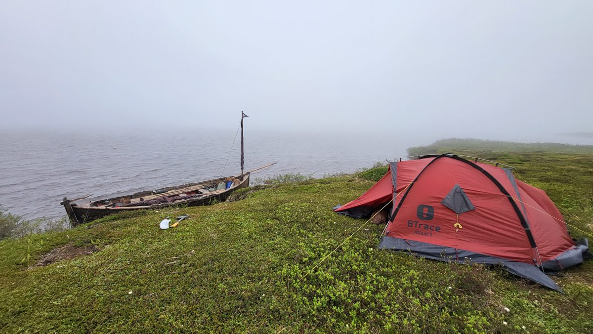 Когда карбас сорвало с двух якорей и потащило вверх по реке – дружно его спасали. Очень хорошо провели время, но близость встречного ветра у Поморского берега за Святым Носом заставляет нас скоро стартовать.
