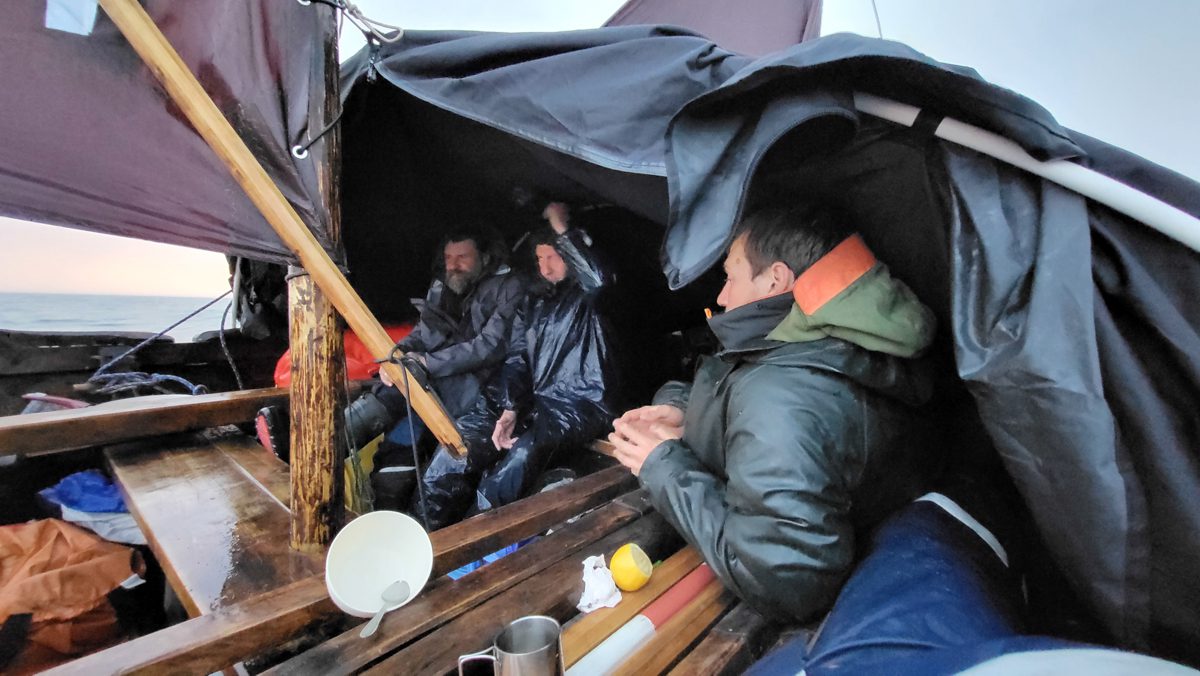 0740, стартовали на «Матере». Ветер зашел на восток, нам навстречу. Туман. Убрали мачты, идем на веслах.