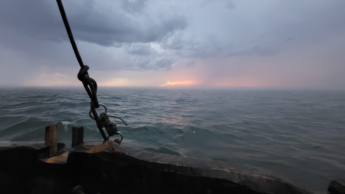 1600, ветер до 25 узлов на берег. Волна до метра и более. Положили второй якорь цугом. Держит. Дождь. Пробовали привязать к якорной веревке мешок с маслом для успокоения волны. Артем сказал, что помогло, стало меньше качать.