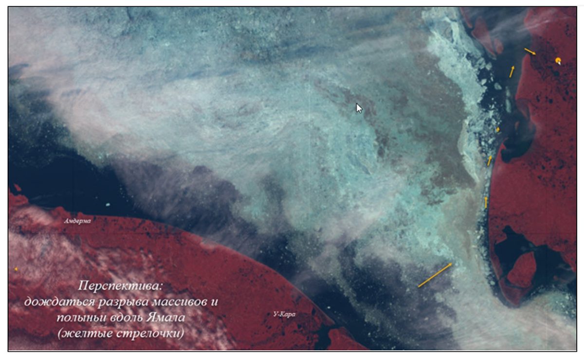 «Пересмотрела 2018 год, он один из всех последних для юго-запада Карского моря стал аналогом позднего очищения. Тогда при северном и северо-восточном ветре 7-12 м/с лед съехал к побережью, закрыв Амдерму и Усть-Кару, и полмесяца удерживался. Наша ситуация намного лучше, но 18-19.07 ожидается северный, северо-восточный ветер, слабее и короче, чем в 2018, лед до Усть-Кары может появиться полосами до 3 баллов. С 20.07 все улучшается и по ветру,   и по температуре, и в Обской губе на участке выхода у Сёяхи.