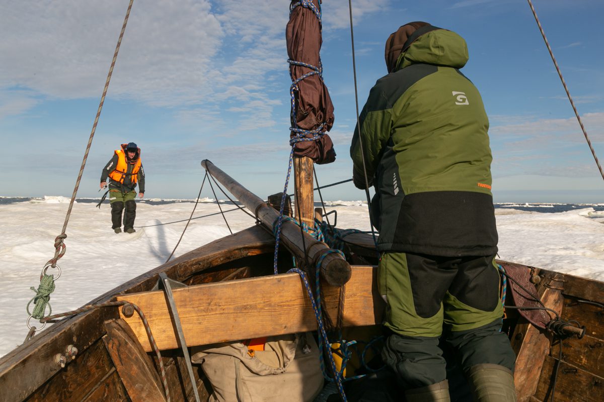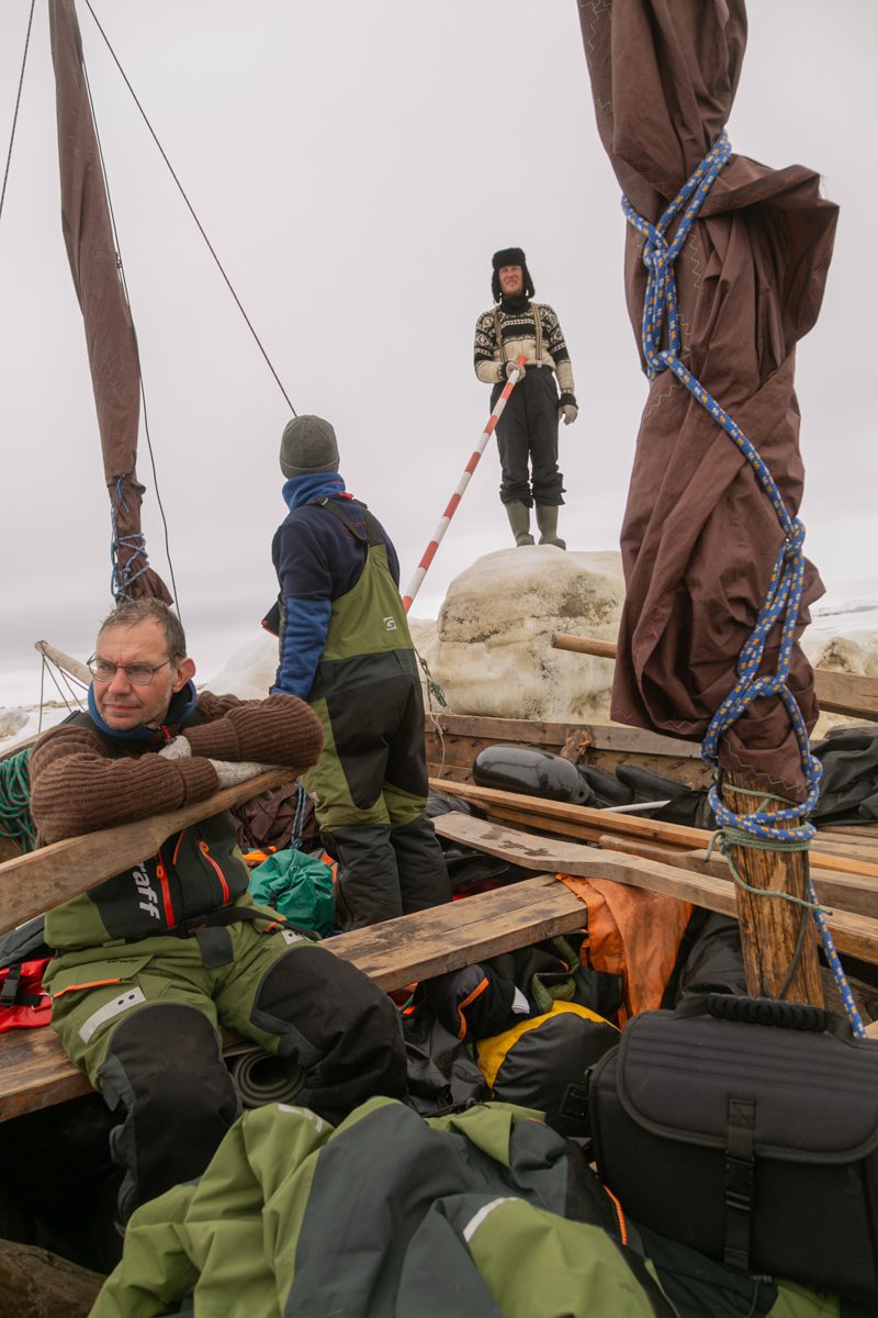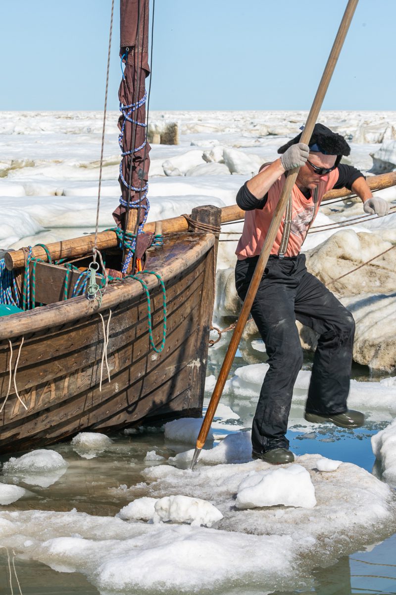 Нам снова пришлось взяться за шесты и пробиваться вперёд через заторы. Потом, когда мы пробились к берегу в длинную полынью, навстречу подул крепкий ветер с завыванием в вантах от норд-оста.