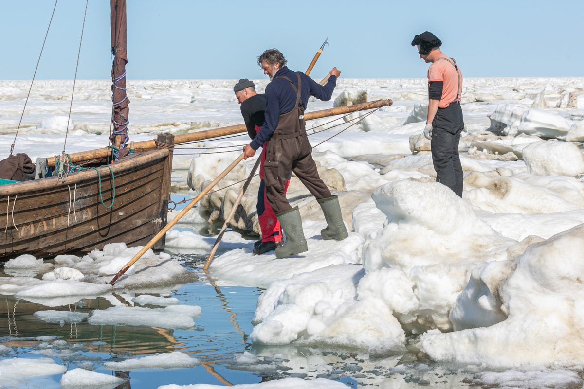 1415, карбас «Матера» пробивает дорогу катамарану «Товарищ». Растаскиваем, расталкиваем отпорными крюками, шестами льдины – куски льда величиной с дом.