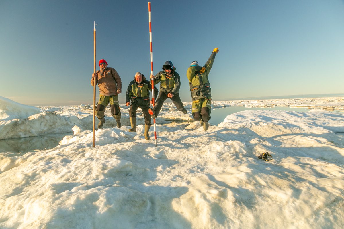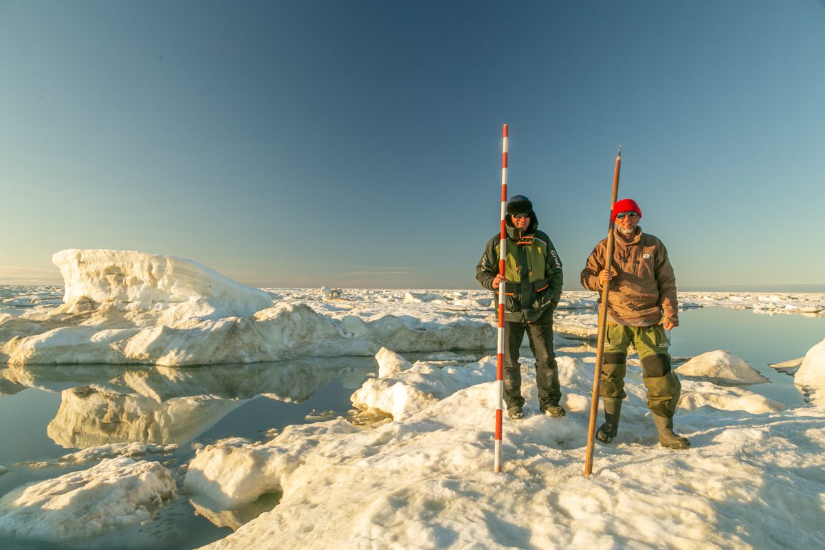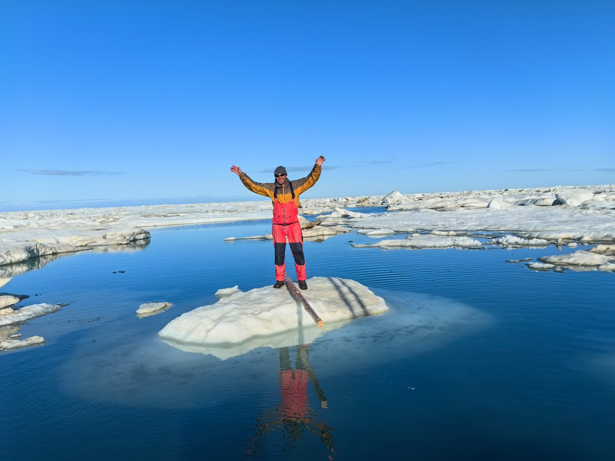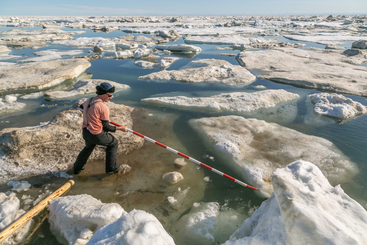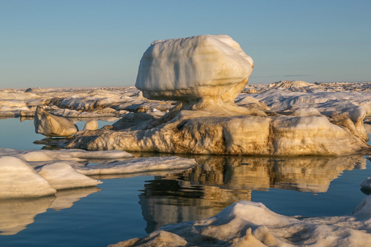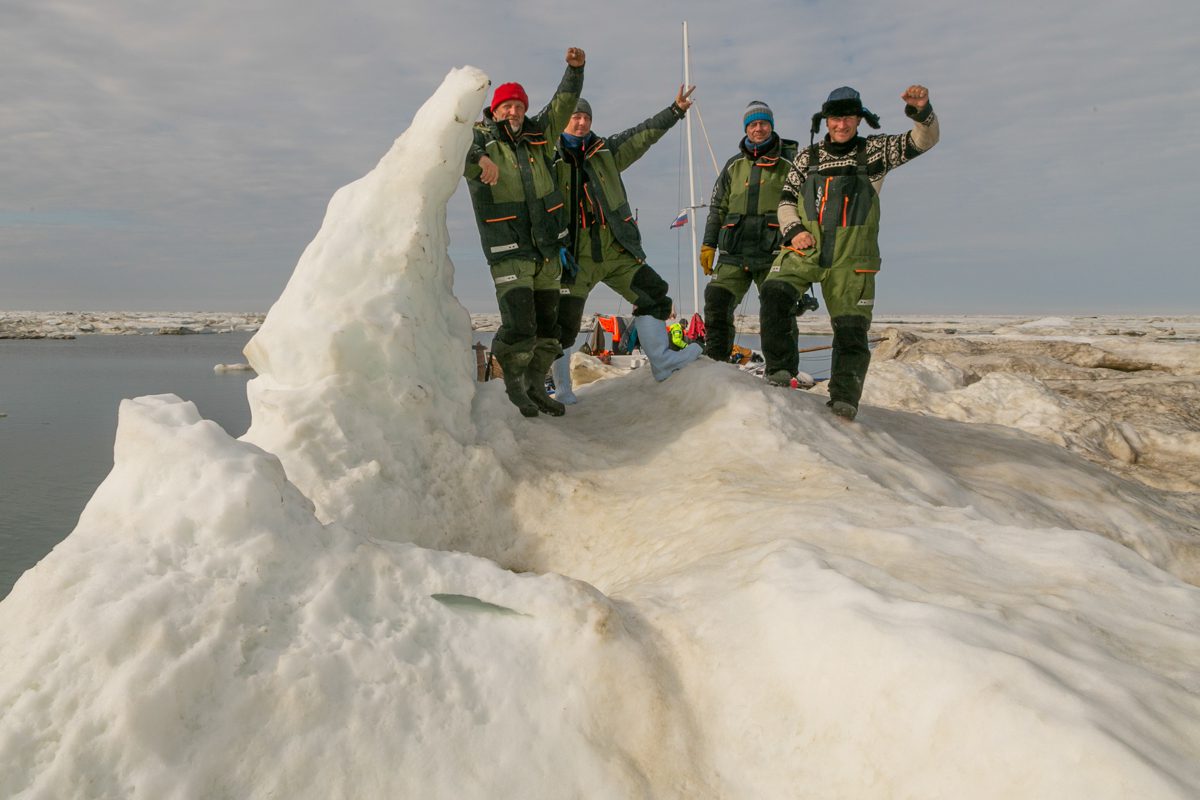 1345, сидим на льдине. Застряли между «Быком», «Лежащим Буддой» и «Пингвином». Солнце и ямальские комары с берега.