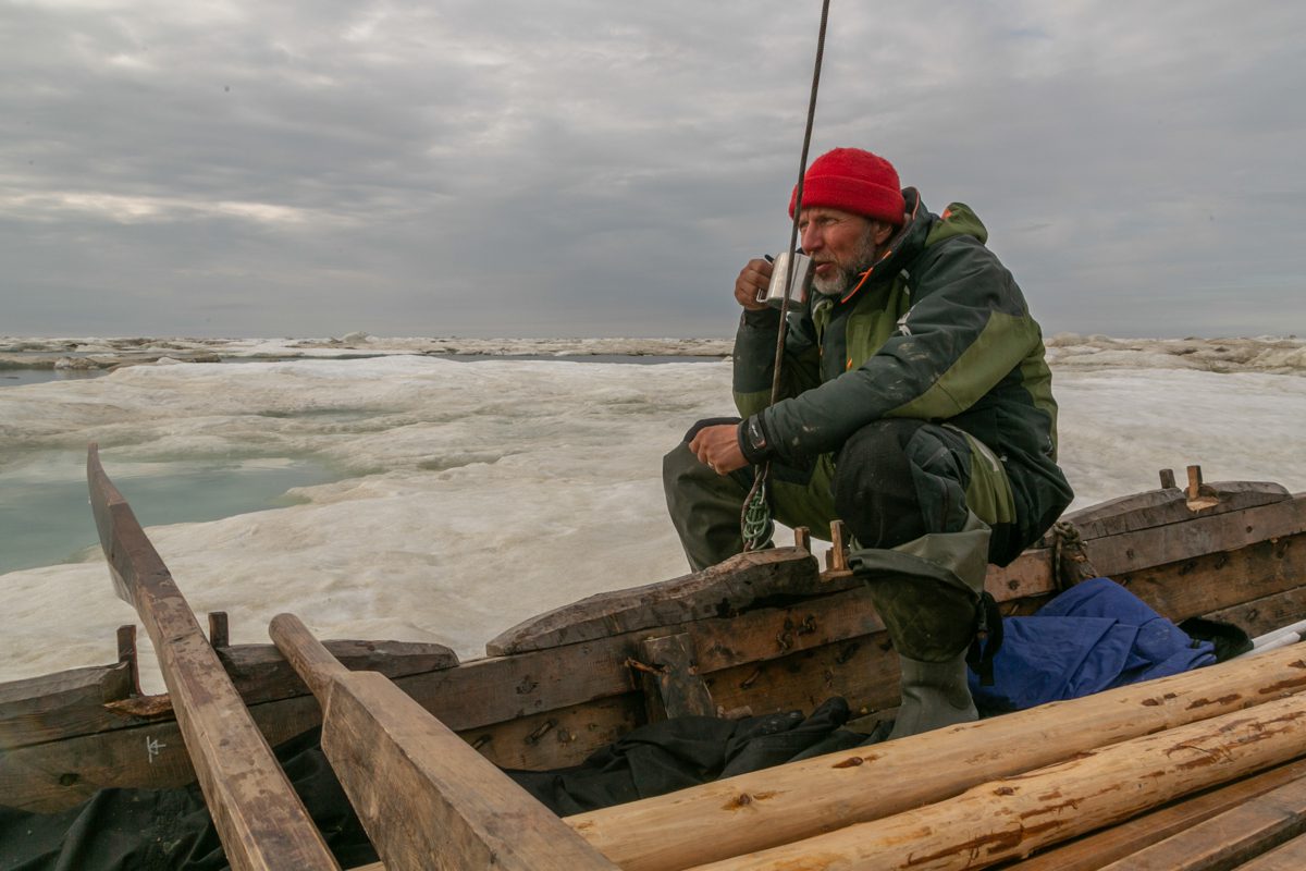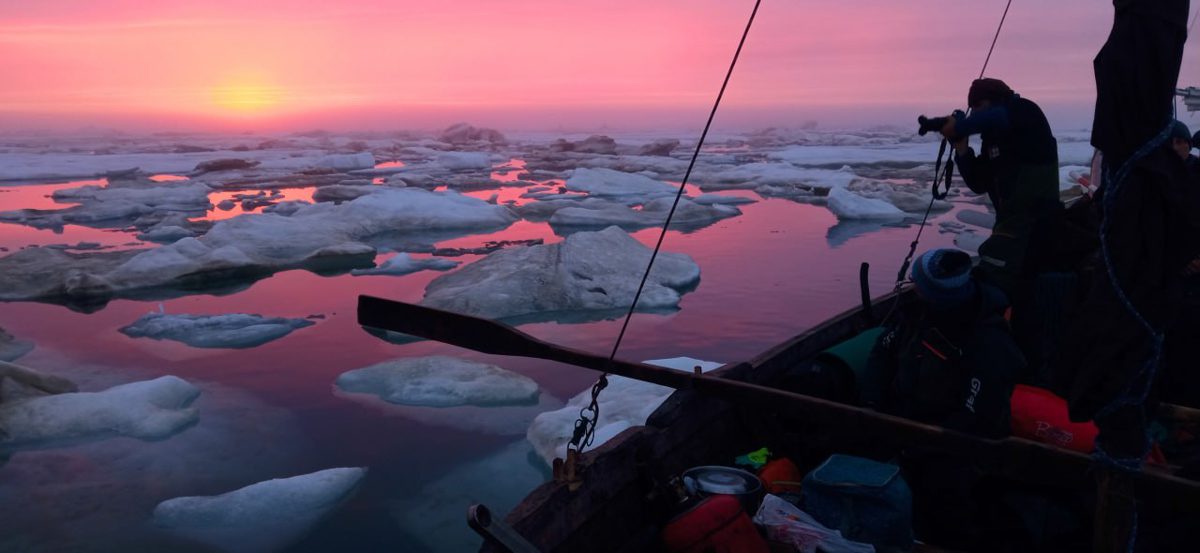 Тут же приплыла белуха, стала нырять под карбас. Мы ждали сразу увидеть белого медведя, но пока нет. Ощущение, что мы не одни. Всё – лёд, вода, небо и то, что прячется – всё за нами внимательно наблюдает и ждёт , что мы будем делать.