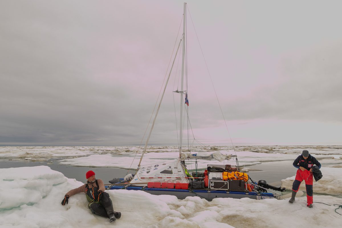 «Товарищ» ведет себя отлично. Иногда он слишком широк, но его можно перетаскивать по льдине на покатах и просто скользом по льду. Чаще всего мы перетаскиваем один поплавок по льду, а другой идет по воде. Корпусу катамарана порой приходится испытывать самые несвойственные нагрузки, когда мы тащим его через льды – но он держится, как и положено настоящему товарищу. Анатолий Кулик выпускает крепкие суда – подписываюсь.