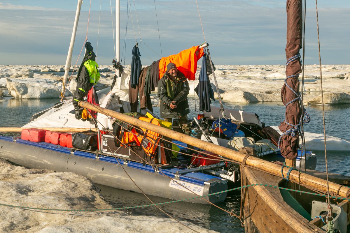 0700, к утру карбас частично оказался на льдине. Катамаран тоже. Еле заметная качка, или это в голове качает. Время от времени соседние льдины разрушаются, ломаются, рядом всплывают большие обломки. С непривычки не по себе.