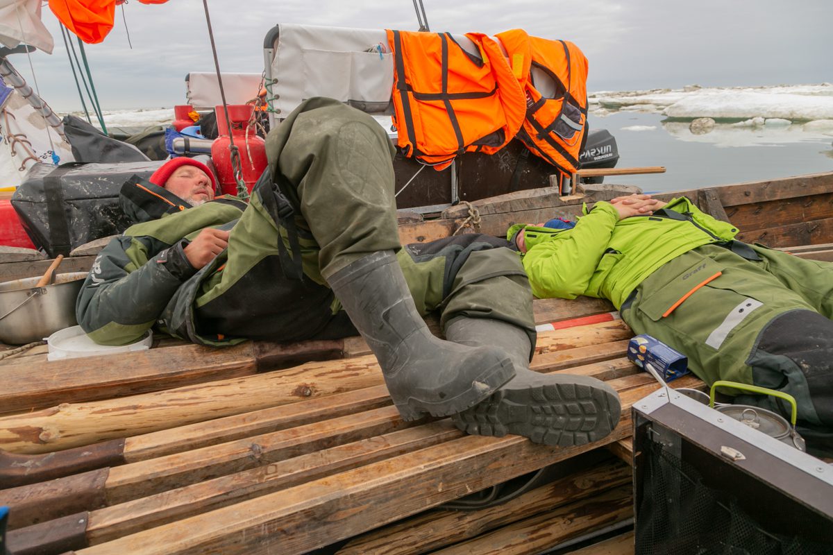 Ночью льды собрались плотнее. Чувствую, как карбас поскрипывает. Спим в зимних костюмах. Кто-то предпочитает достать спальник. Пропагандирую эту манеру – устроить ложе из сумок, надуть коврик, разложить спальник, раздеться, как полагается, и спать в тепле.