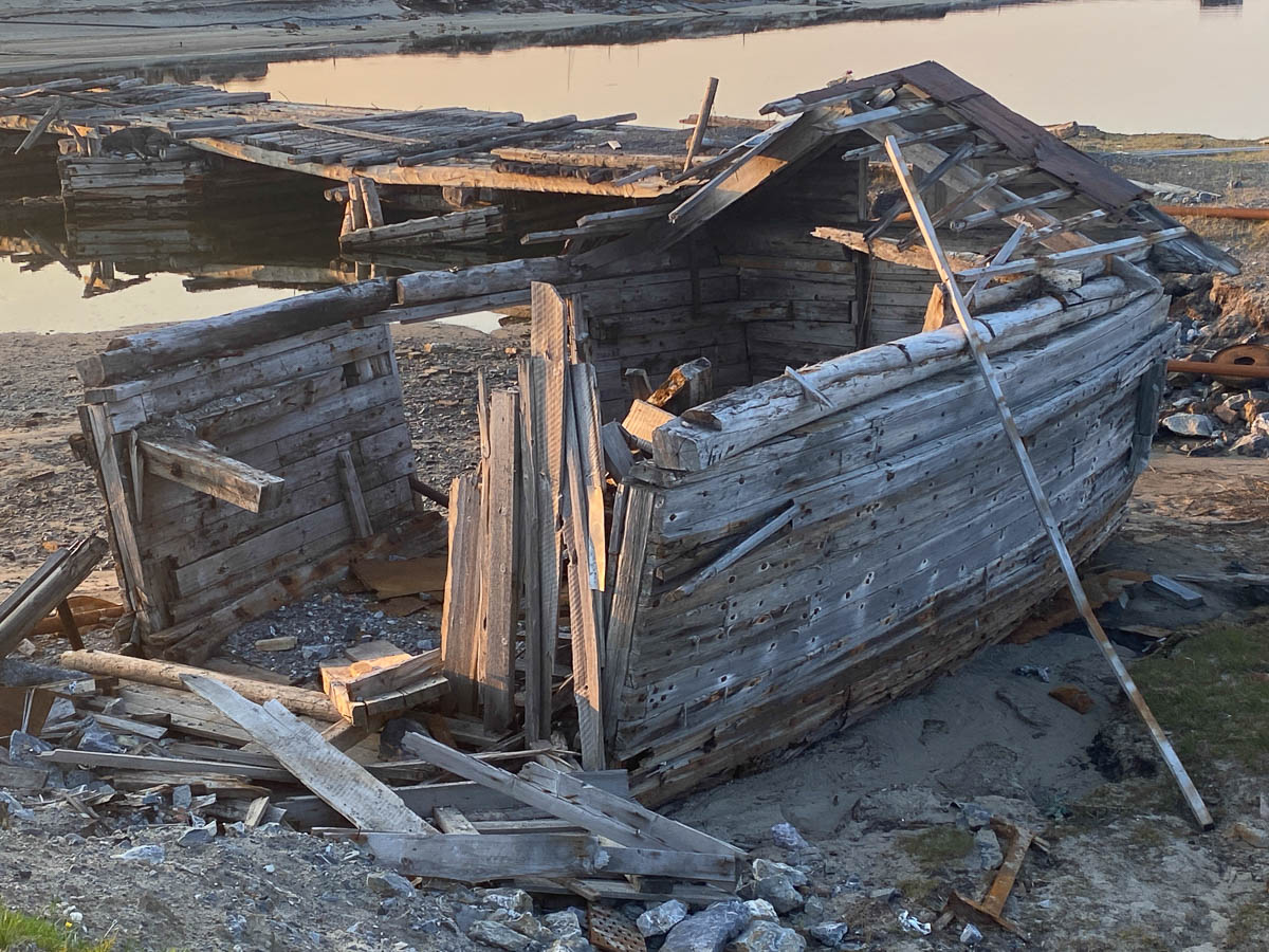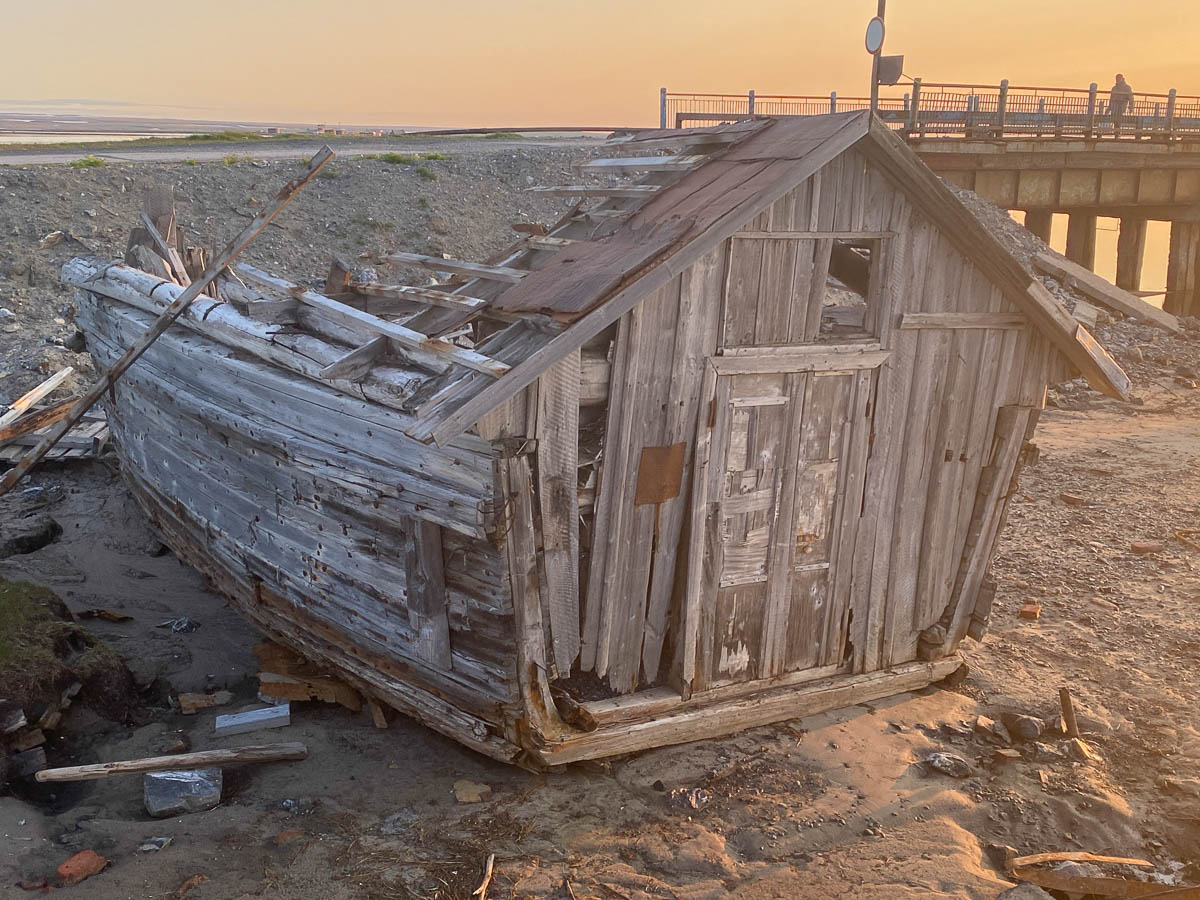 Ещё мы нашли там странную деревянную конструкцию, напоминающую избушку, переделанную из какой-то баржи. Потом я стал читать, и узнал, что до 60-го года в порту Амдермы использовали деревянные кунгасы – огромные плоскодонные баржи. Такие кунгасы делали на Соломбальской верфи, интересно – оно это или не оно?