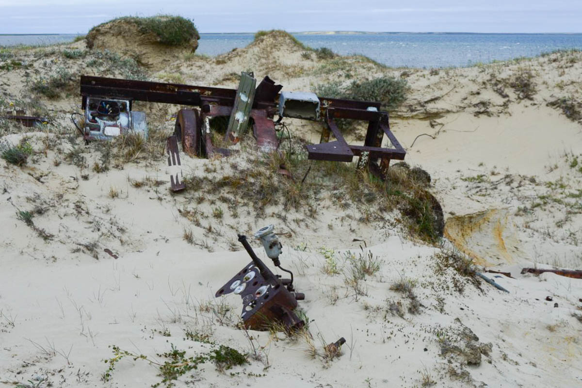 Спрашивается, для чего Омская экспедиция оставляла там тяговую судовую машину? Может быть, для того, чтобы как-то использовать этот волок дальше. Один из участков берега там укреплён сваями, то есть, он использовался либо как причал, либо ещё как-то. Там же на ровной площадке есть остатки как минимум трёх зданий с шиферной крышей. Видно, что там жили люди, потому что на этом месте остались элементы быта: чайники, оцинкованная спинка кровати…