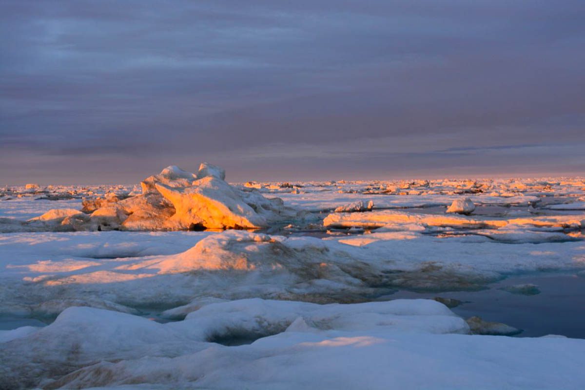 Одним из первых я пошёл на вахту. Солнце там опускается очень низко и даёт замечательную подсветку, так что часа на два вокруг становится просто феерически красиво: лёд залит либо розовым, либо золотистым цветом. Я взял на вахту фотоаппарат, сидел на борту и просто фотографировал.