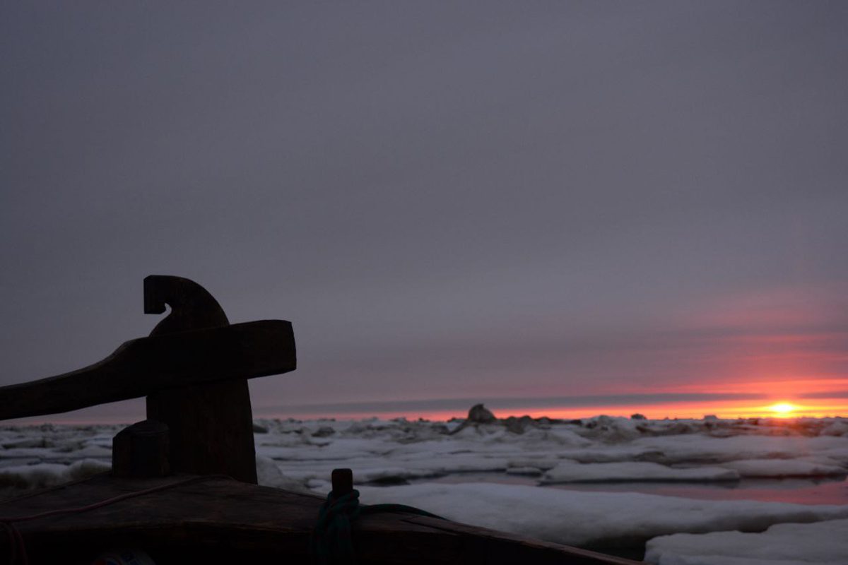 В предпоследний день мы остановились минут на тридцать, и за это время нас так поджало льдами, что было уже просто никуда не ткнуться. В этот момент я подумал, что нужно, наверное, достать из гермосумки документы и держать их где-то поблизости, потому что, не дай Бог, но нам всё-таки придётся остаться на льду. Опять же, тогда не было страшно. Это не как на волоке, когда у тебя за спиной кто-то ходит. Ты просто держишь в голове самый плохой вариант и думаешь, как в этом случае нужно будет поступить. Мы аккуратно, по самому краешку льдины немного перетащили карбас, а дальше вода поднялась, льдины подразошлись… Ещё чуть позже ситуация сильно поменялась в положительную сторону – настолько, что мы даже надеялись выйти в тот же день – но всё-таки не вышли и легли спать. Через полтора часа Евгений разбудил нас со словами, что сегодня изменится ветер, и будет шторм, так что надо срочно брать ноги в руки и валить отсюда. Мы прицепили карбас к катамарану, дали полный ход – и окончательно вылетели из льдов.