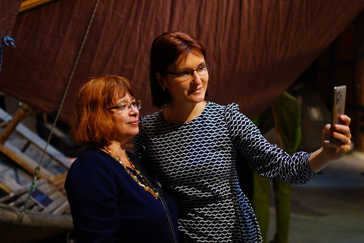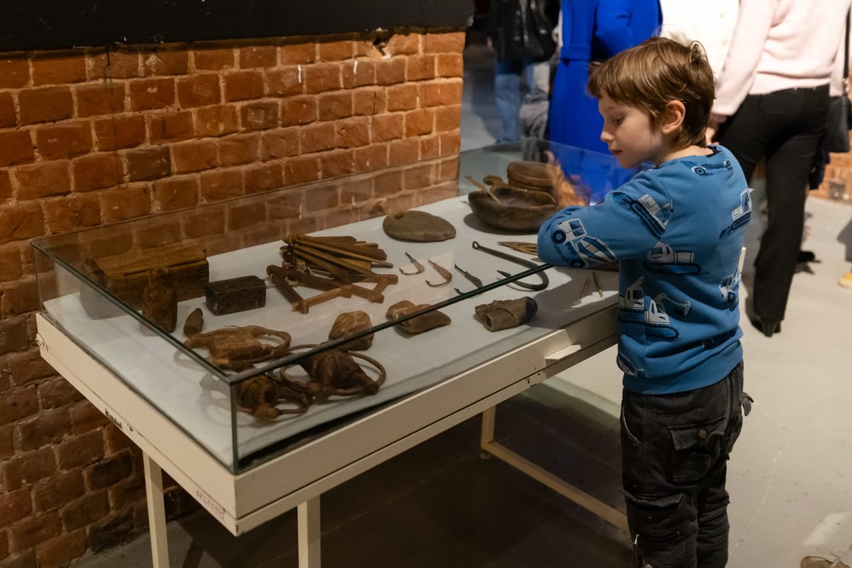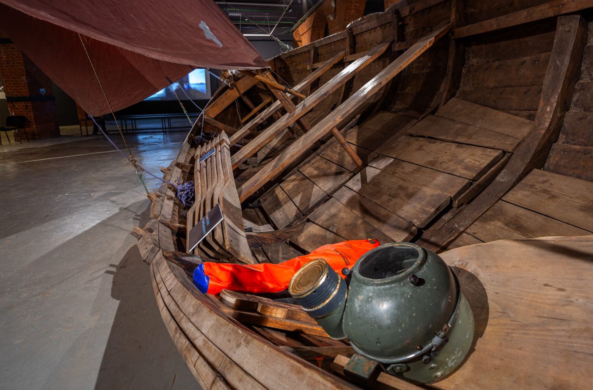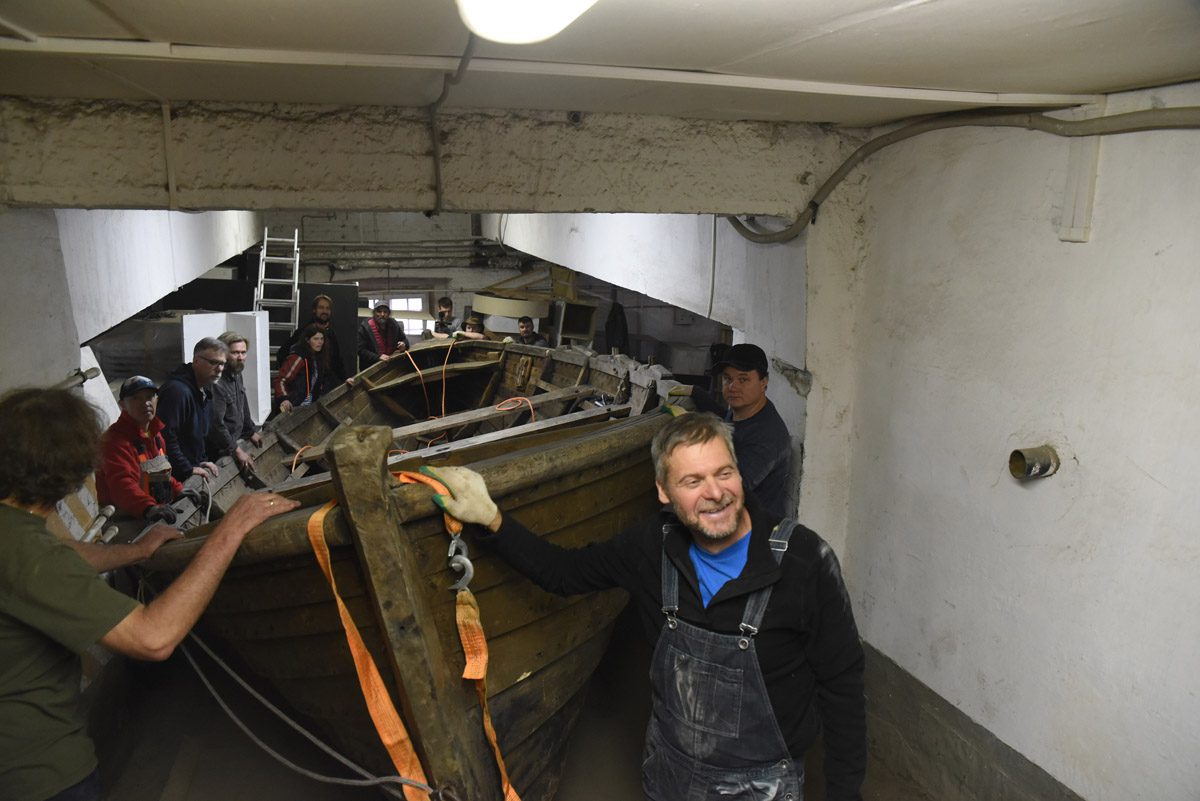 Карбас на выставке можно потрогать, понюхать (он пахнет смолой), сфотографировать и даже забраться под него (некоторые, к нашему восторгу, так и делали — надеемся, что таким образом гостям выставки удалось получить исчерпывающую информацию о лодке и в полной удовлетворить свой живой исследовательский интерес).