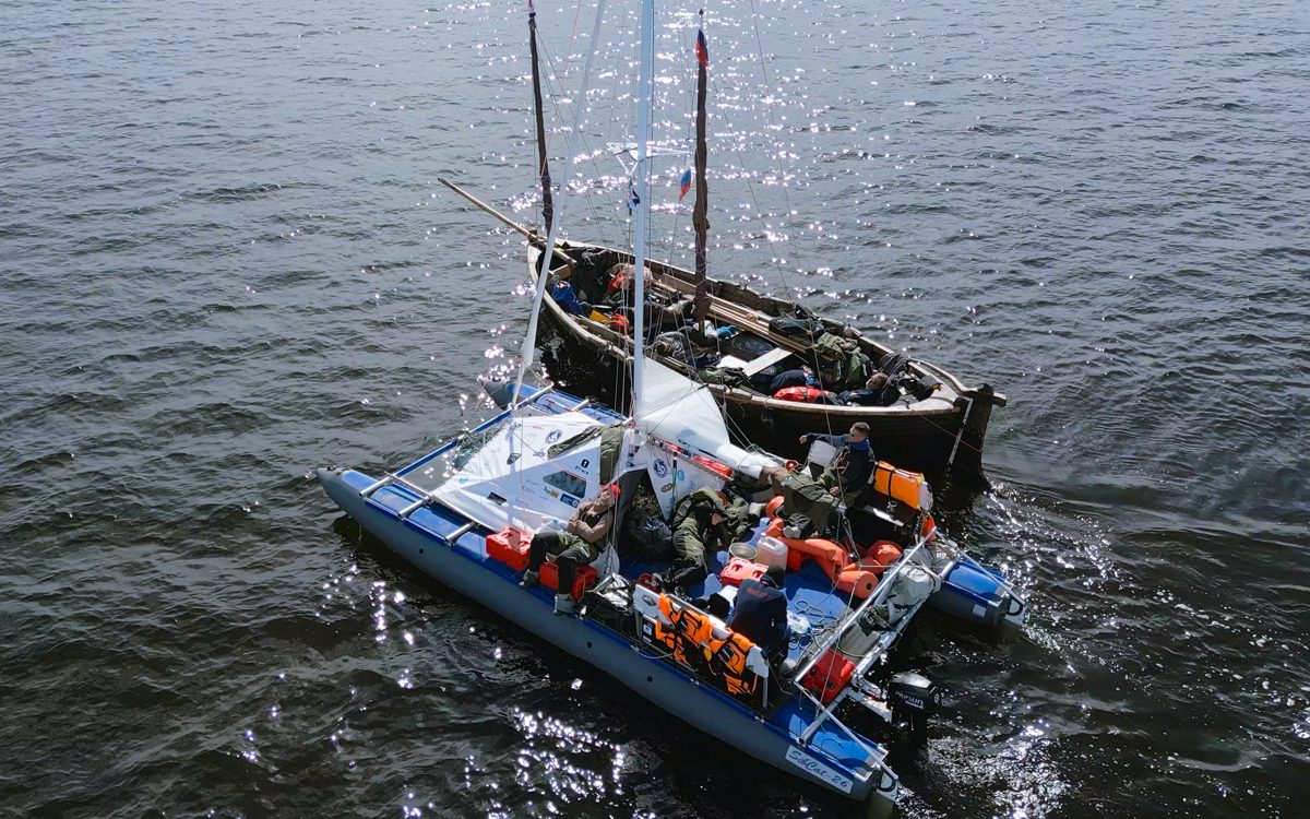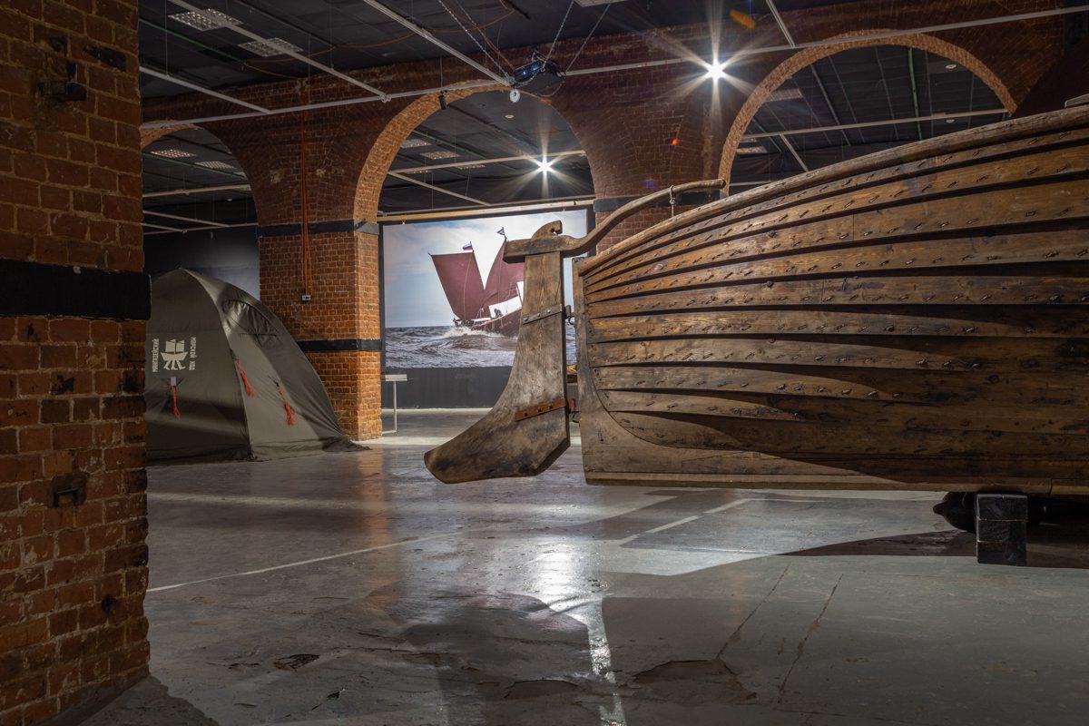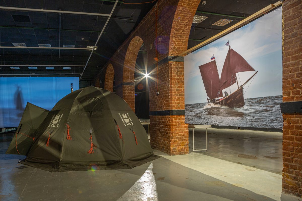 Говоря о выставке, мы не можем не упомянуть и катамаран «Товарищ», построенный известным судостроителем Анатолием Куликом (https://kulik.ru). Несмотря на самые сложные условия, три тысячи километров приключений, ледовую эпопею, катамаран не дрогнул, не сломался и был настоящим товарищем карбасу «Матере». Судна сопровождения нет на выставке, а вот в сердцах всех участников похода он — есть.