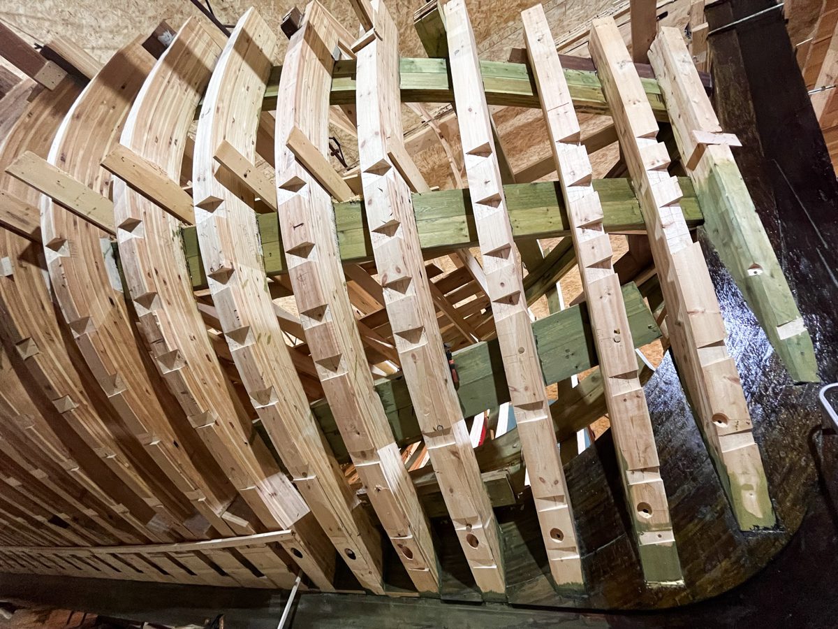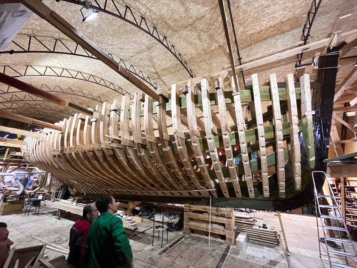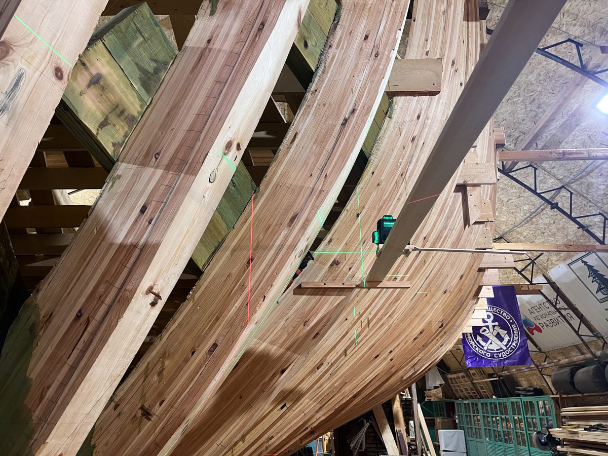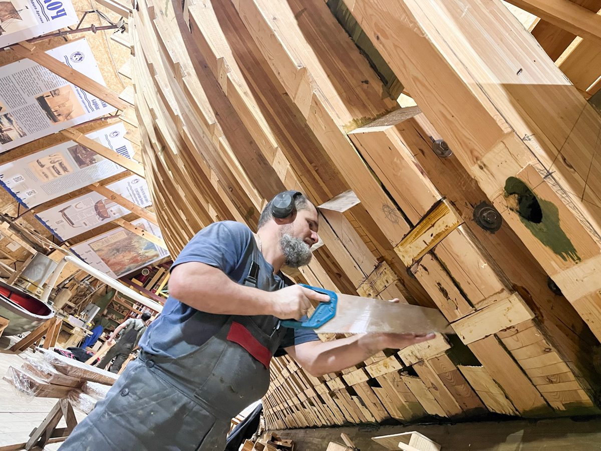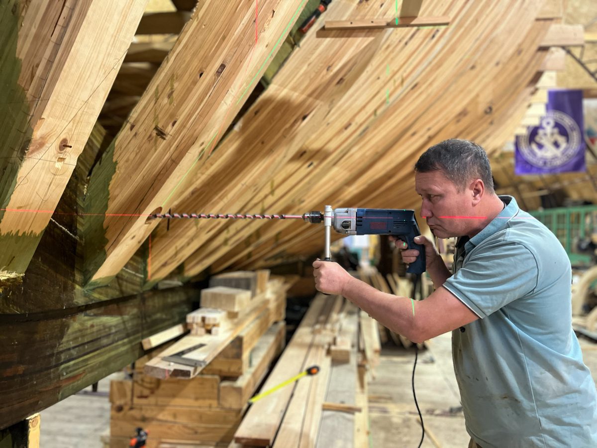 Ставили деревянные нагеля-кноксы, соединяющие стрингера со шпангоутами. Последний нагель пока не дают засверлить леса.