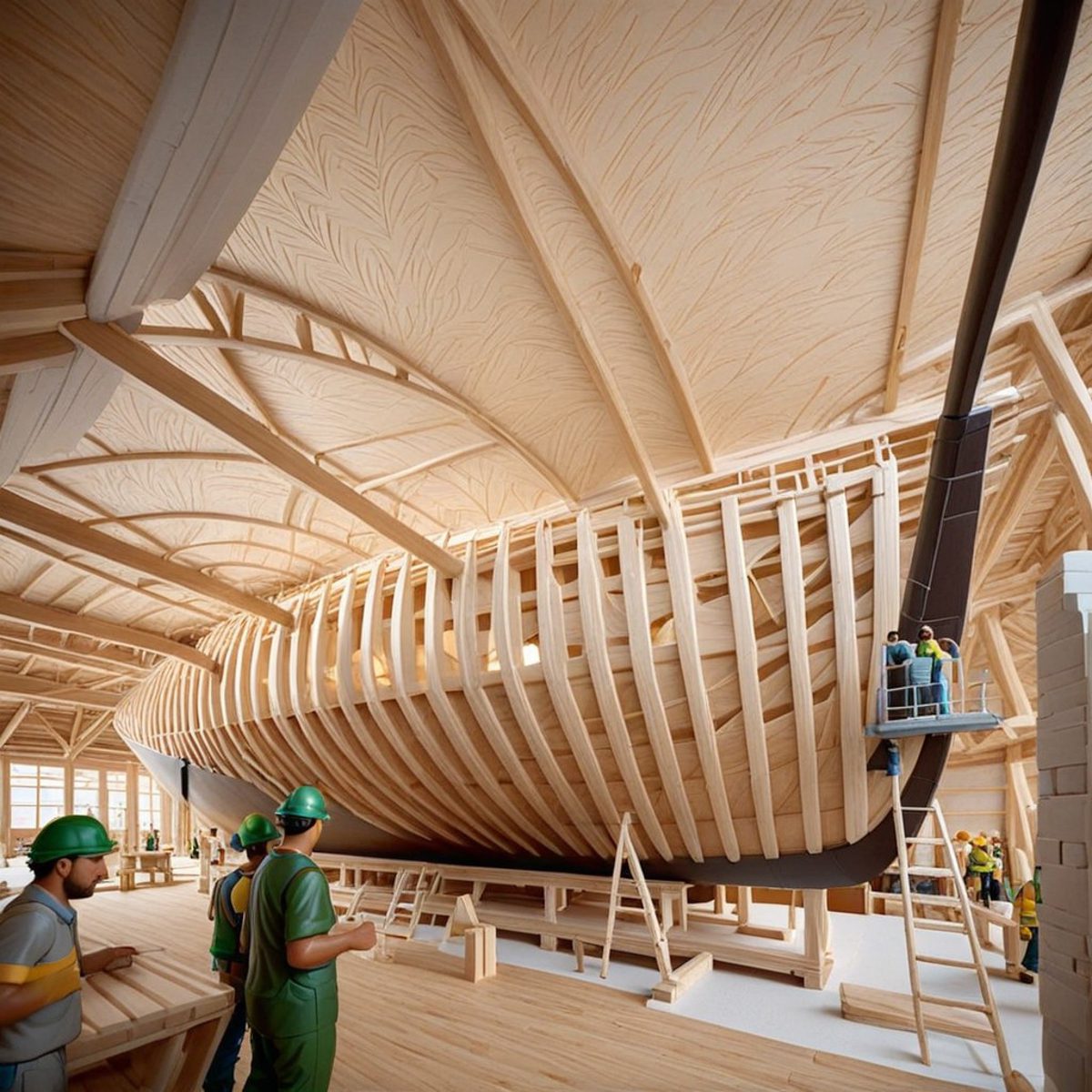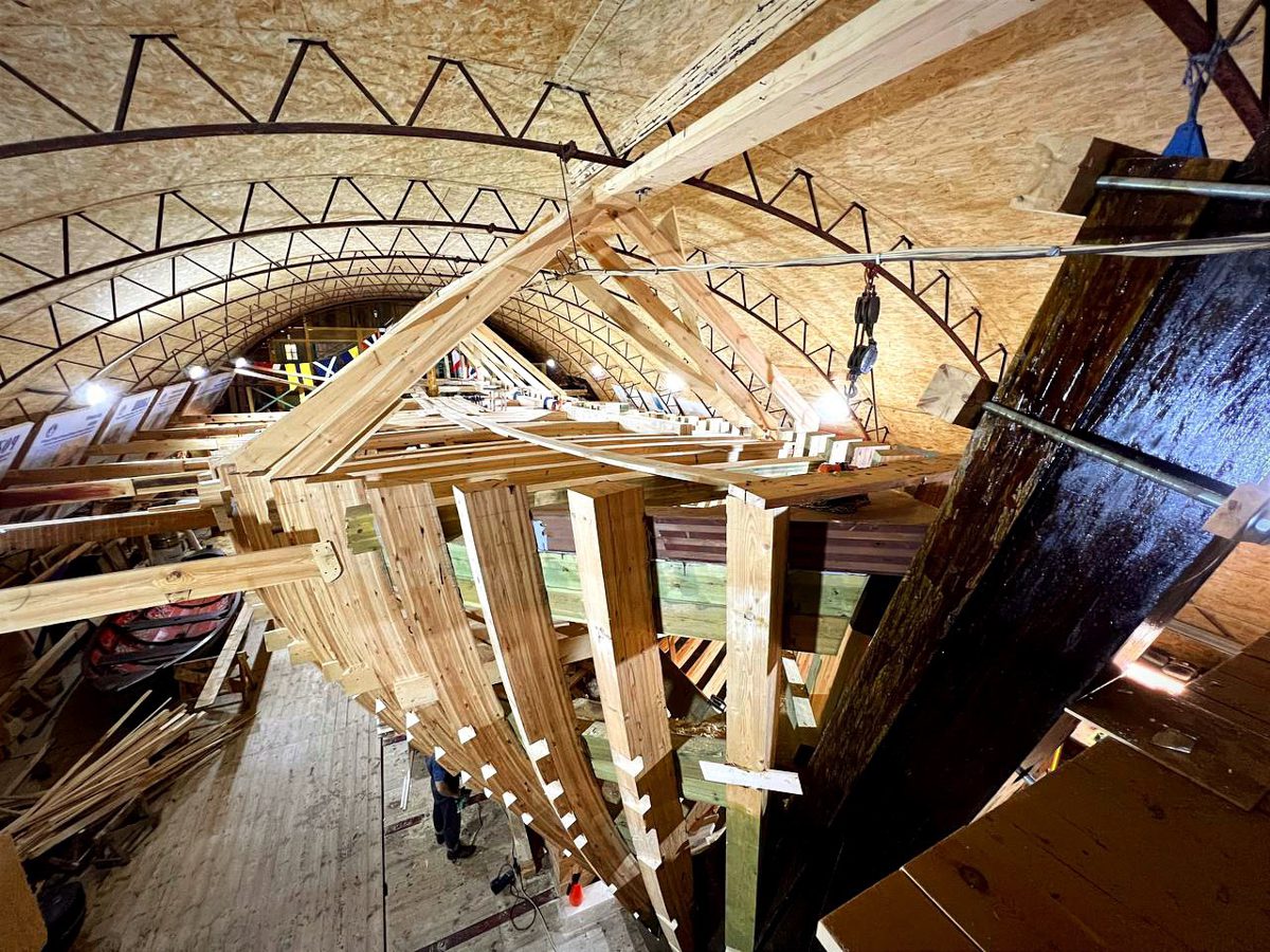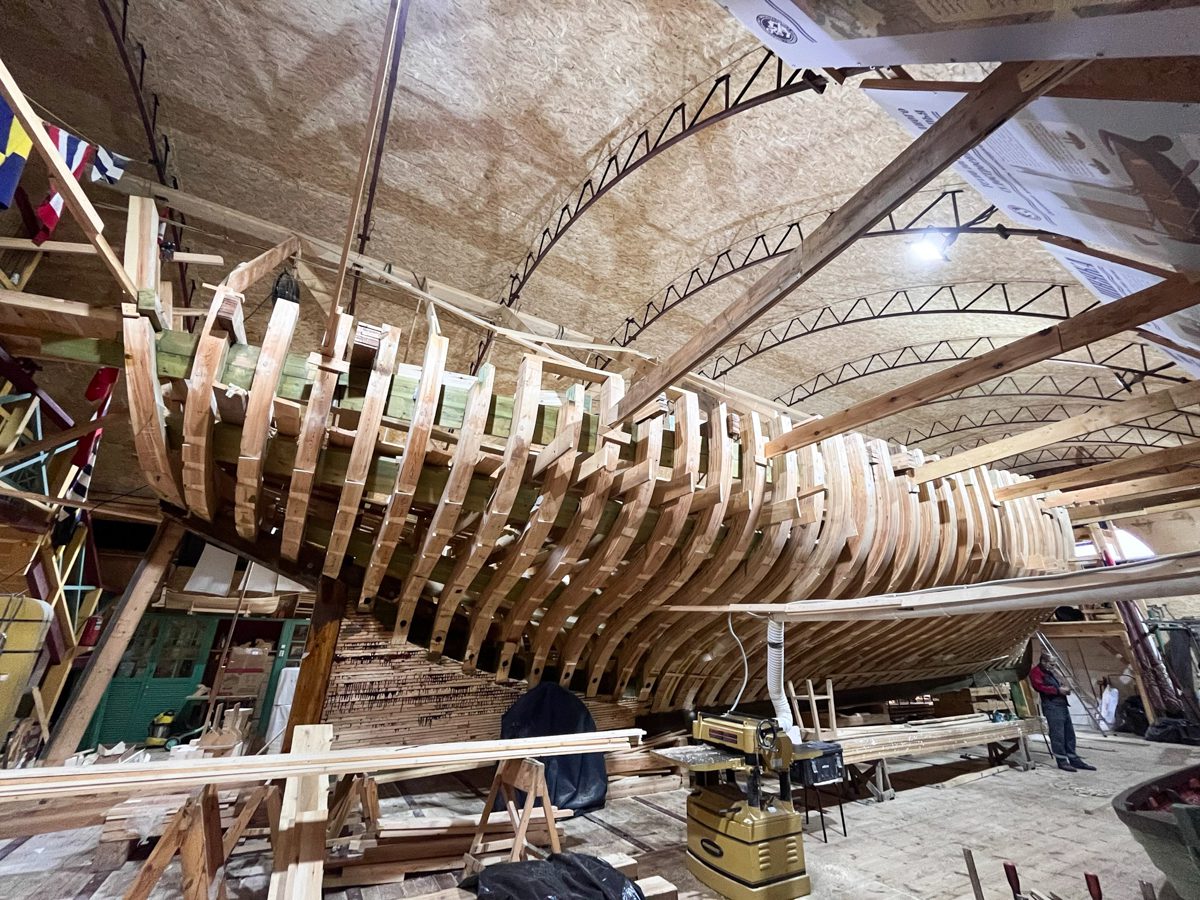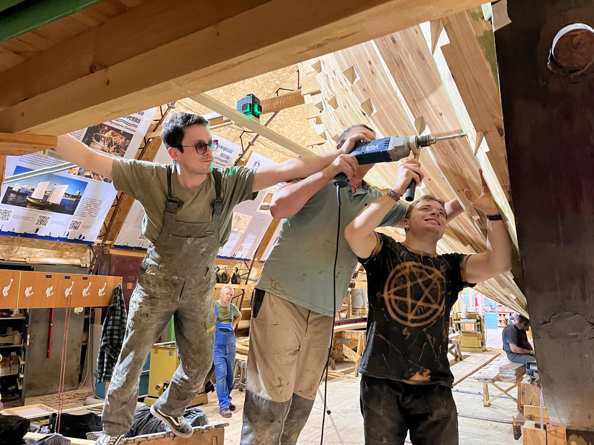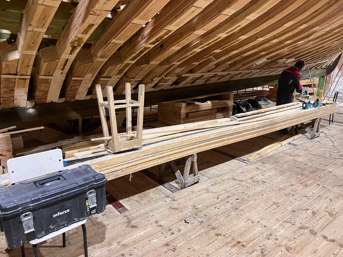 Ставили деревянные нагеля-кноксы, соединяющие стрингера со шпангоутами. Последний нагель пока не дают засверлить леса.