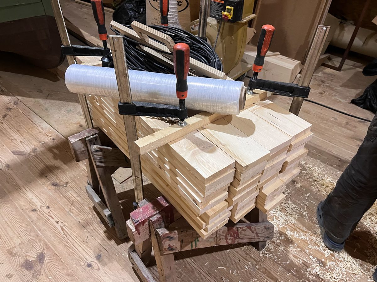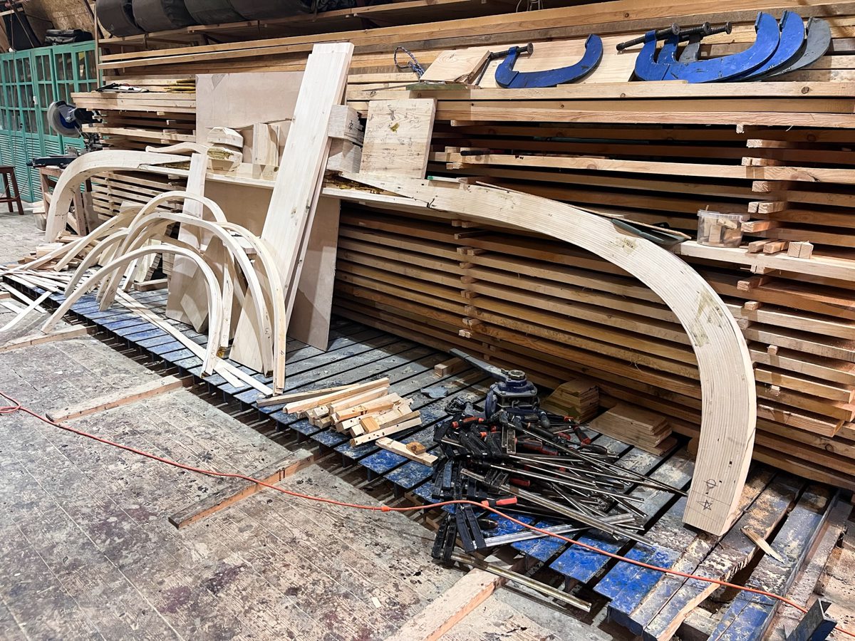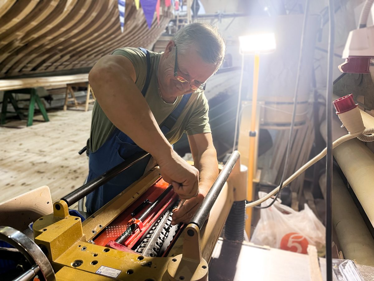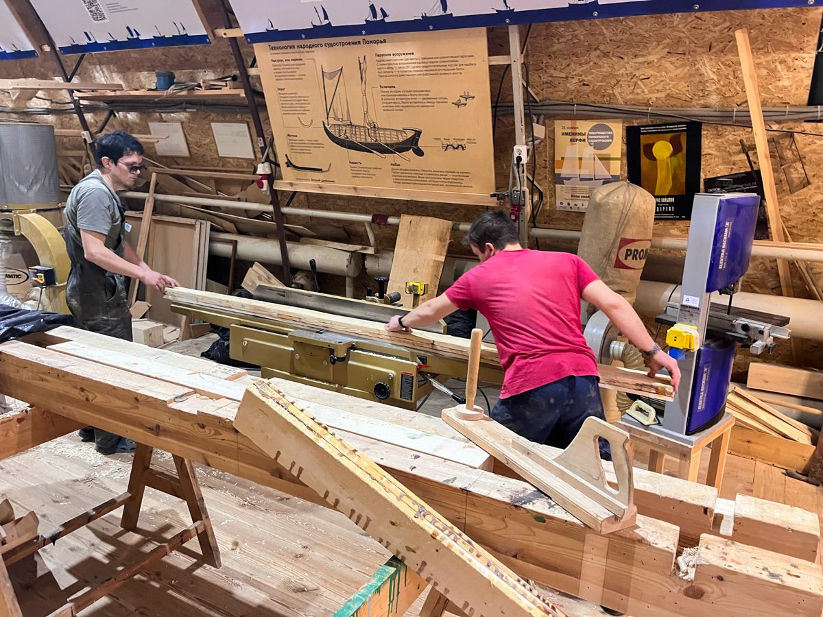 Артём Калинин доделывает детали конструктора «Сделай карбас сам». Готовы: заготовка закладки лодки (киль, форштевень, ахтерштевень), доски для набоев обшивки, черновые заготовки семи шпангоутов, банок, брештуков, мачт, вёсел, привальников, планширей, сланей и даже уток. Готовность набора: около 90%. Доделывать заготовки начисто и собирать карбас вместе со школьниками в Тотьме будет уже Артём Бывальцев.