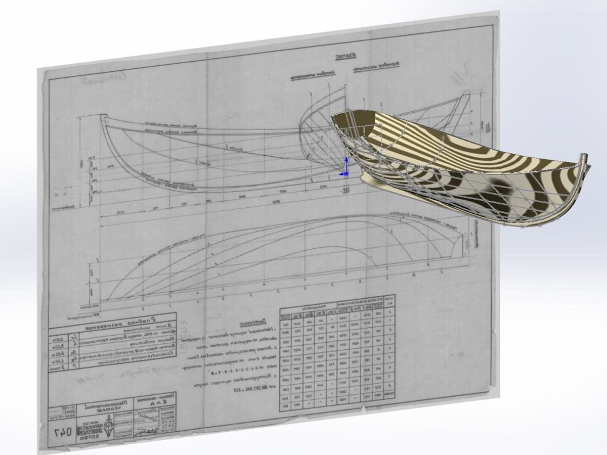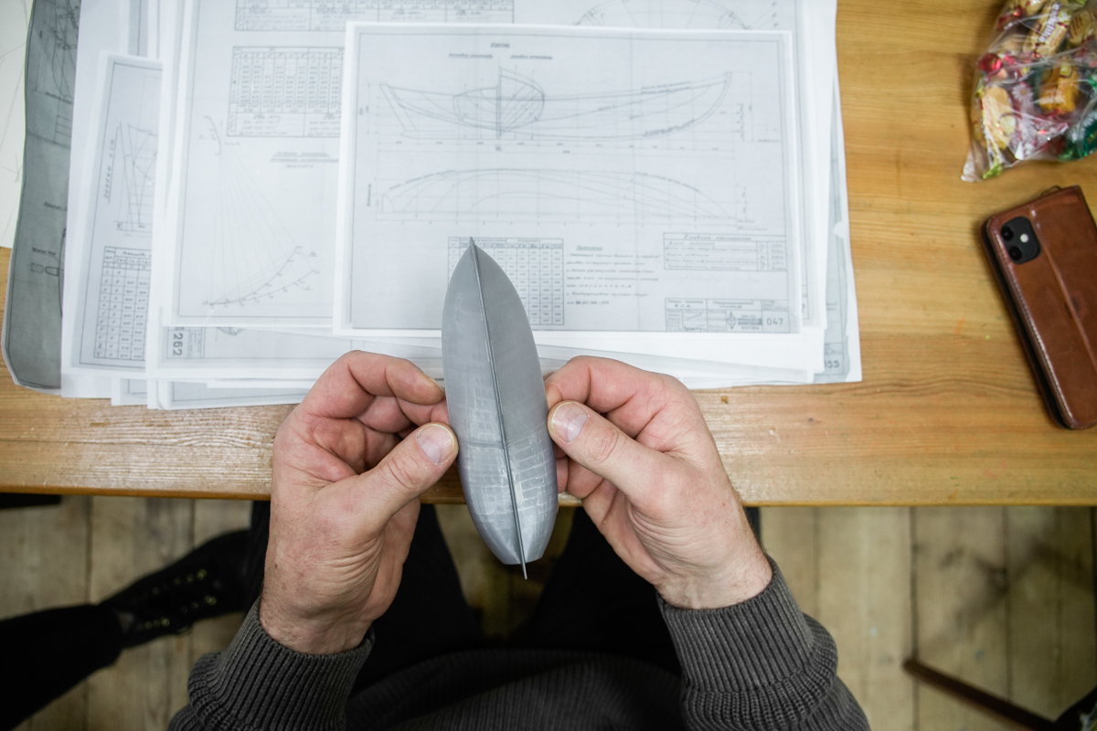 В общем, мы напечатали 3D-модель соломбальской ёлы — чтобы убедиться, что в чертежах не заложено каких-то ошибок (на фото — эта самая модель). Чтобы определиться с формой корпуса и привести в порядок теоретический чертёж лодки, нам пришлось поработать над моделью, поискать фотографии готовых ёл и провести с ними некоторую аналитическую работу.