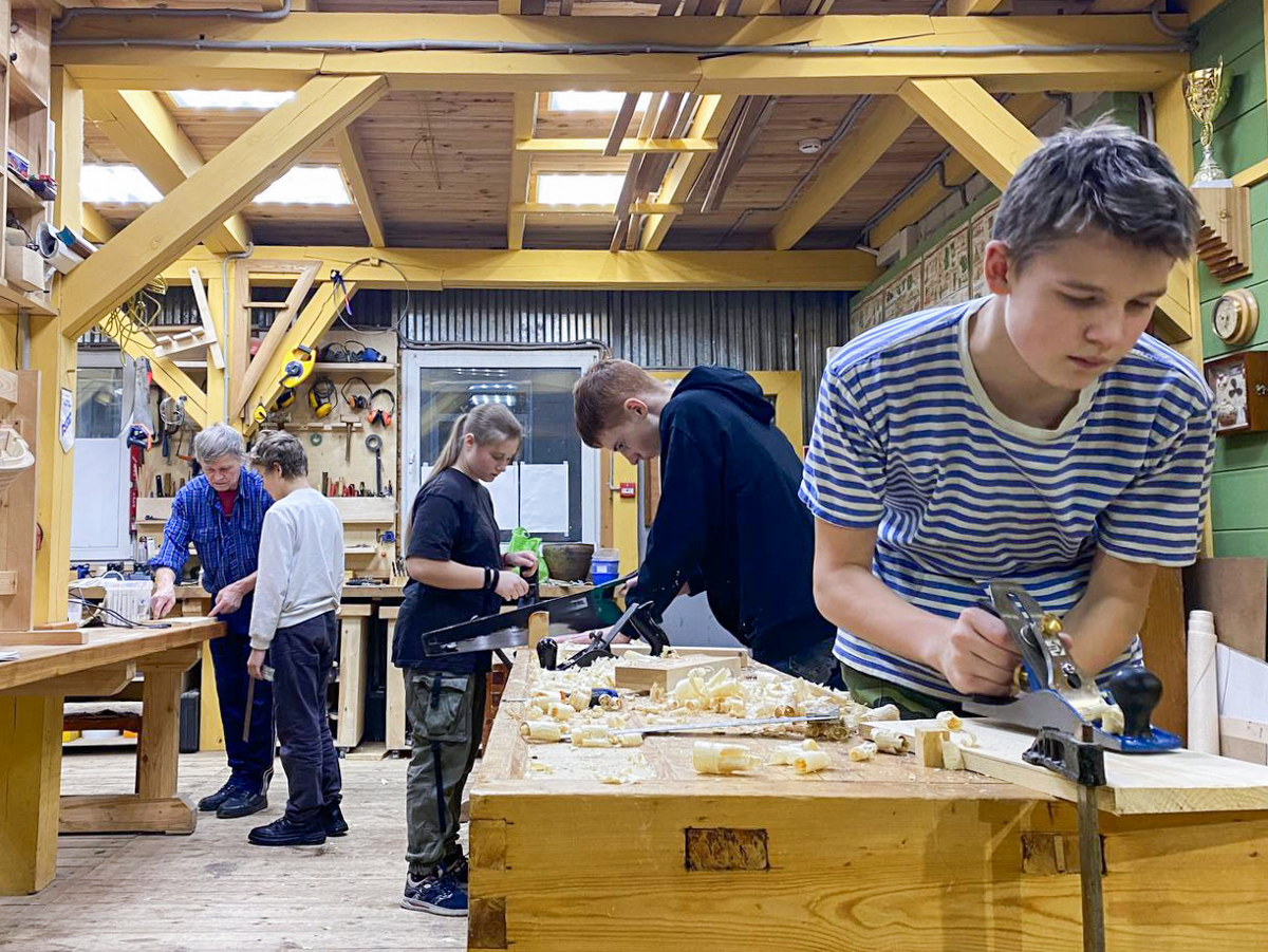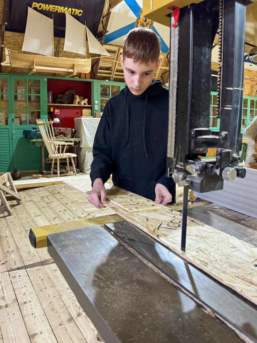 Теперь их пятеро. Вместе ребята: делали шаблоны на плазе, строгали доски на рейсмусе, клеили заготовки на киль и бакс, ставили стапель, учились строгать вручную и сделали себе по разделочной доске.