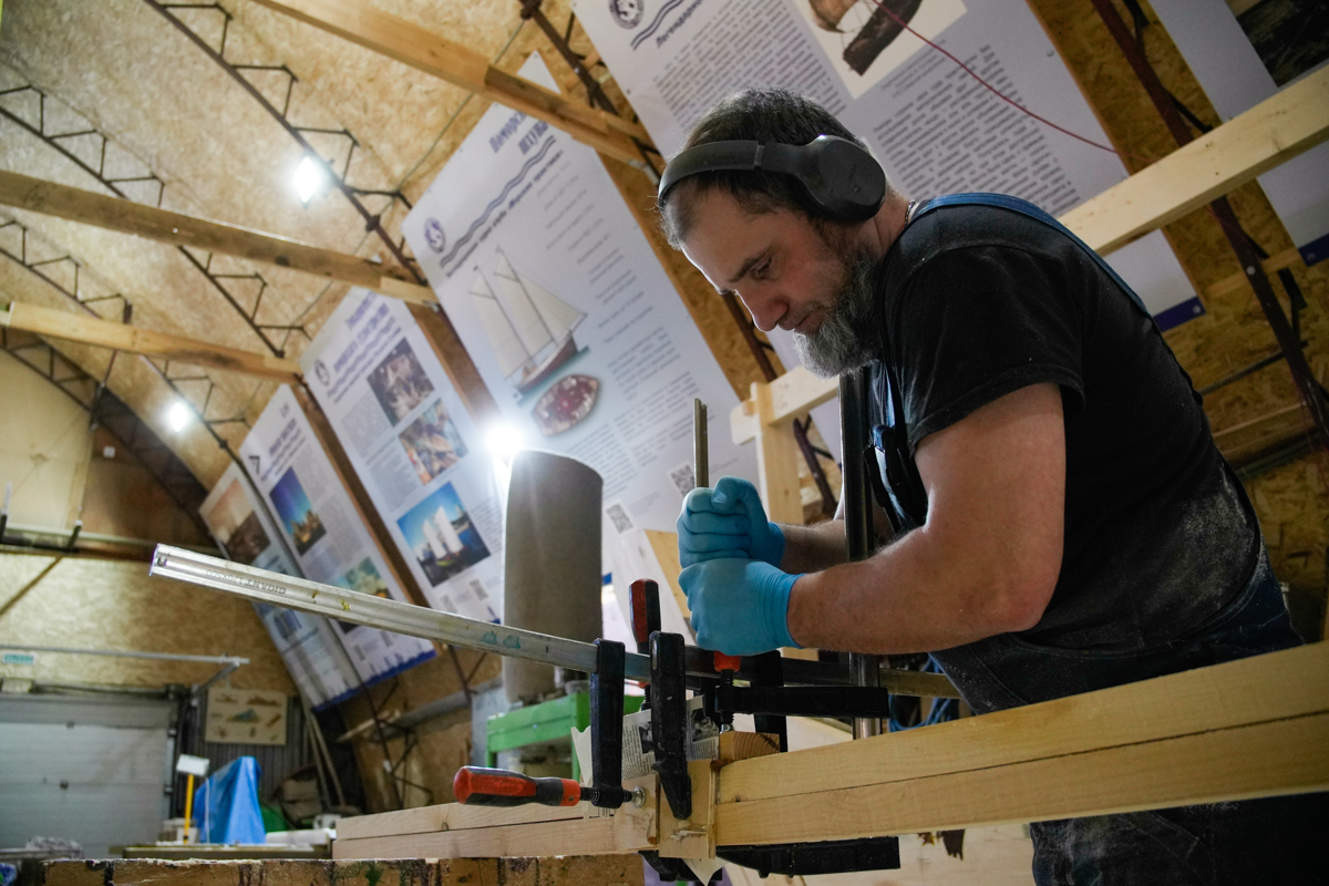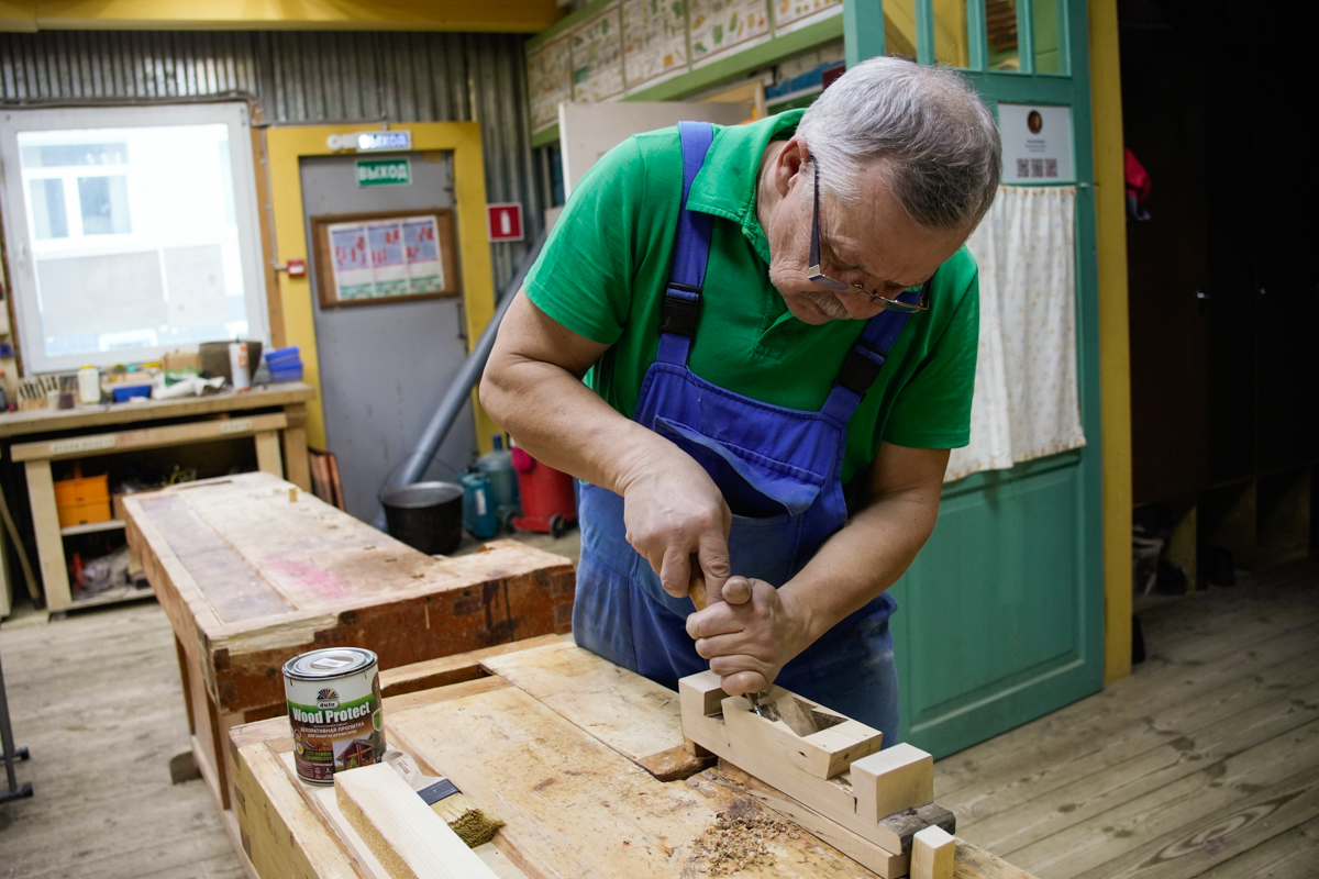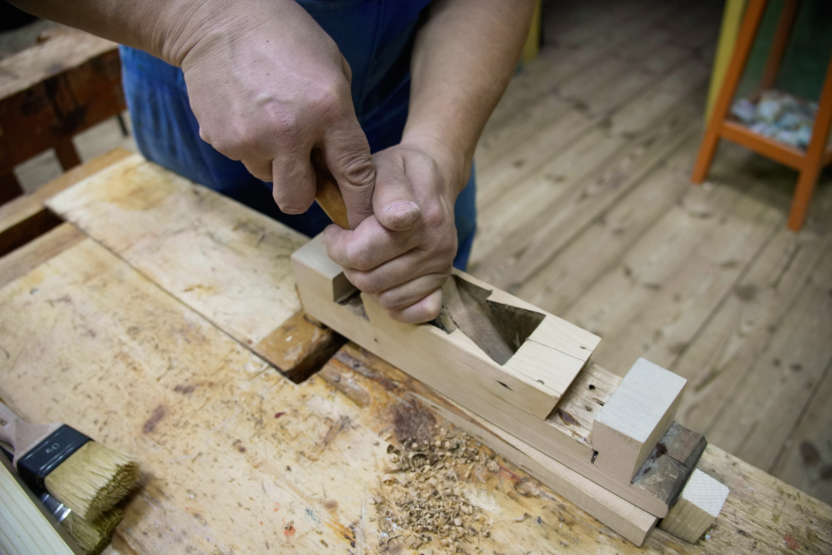 Саша-механик, который починяет всё на верфи, починяет теперь рубанок. Красивый традиционный рубанок нужен нам для съёмки фильма для «Карбас-музея».