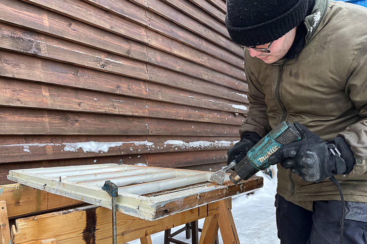 Максим снимает краску с рам для «Карбас-музея». Краски снимать ещё до хохота. До весны работы хватит.
