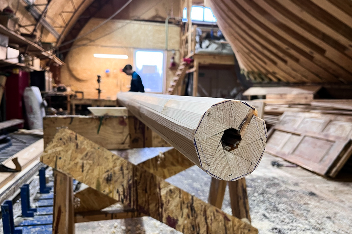 Делаем невиданную верфью прежде вещь — полую мачту. Для всех своих карбасов мы делали только цельные, но вообще-то, полая мачта — это стандартное решение. Во-первых, она легче и крепче цельной, а во-вторых, через внутреннюю полость можно проводить такелаж.