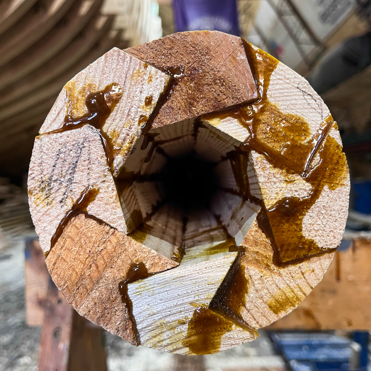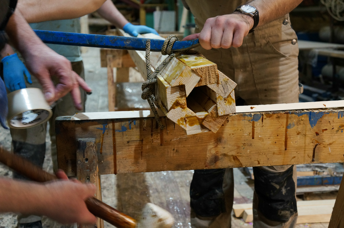 Никто из нас не знал, как называется такая калейдоскопическая система склейки. Мы даже придумали назвать её голландской шестерёнкой, но потом спросили Михаила Плеханова и узнали, что это называется «bird mouth hollow spar construction» — полая мачта с соединением «ласточкин хвост».