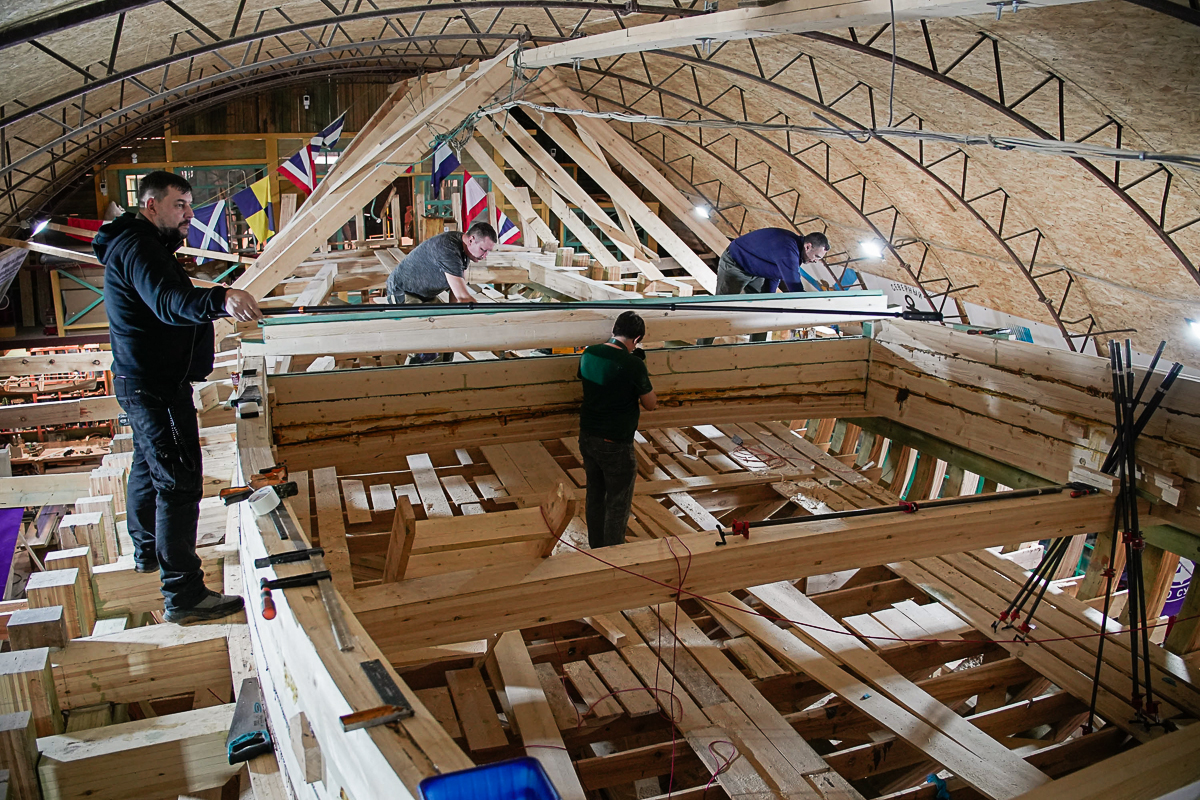 А ещё на этой неделе к нам приезжала съёмочная группа телеканала НТВ. Сняли про нас хороший репортаж, попробовали клеить стены рубки, в которых так преуспевает наш плотник-судоводитель Алексей.