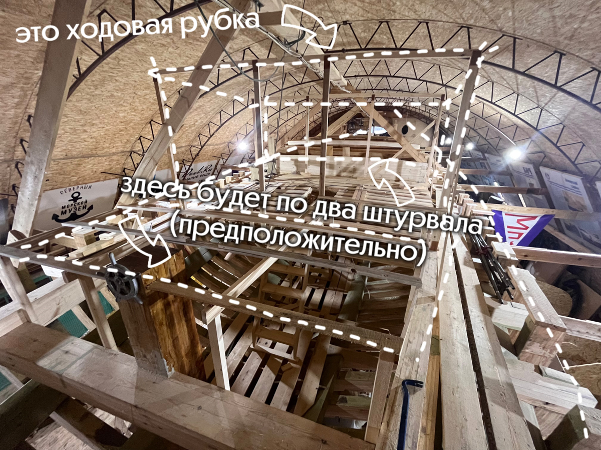 Между тем, набирает ход планирование помещений и строительство временных перегородок, дублирующих все будущие стены, лестницы, палубы, помещения и пространства шхуны.