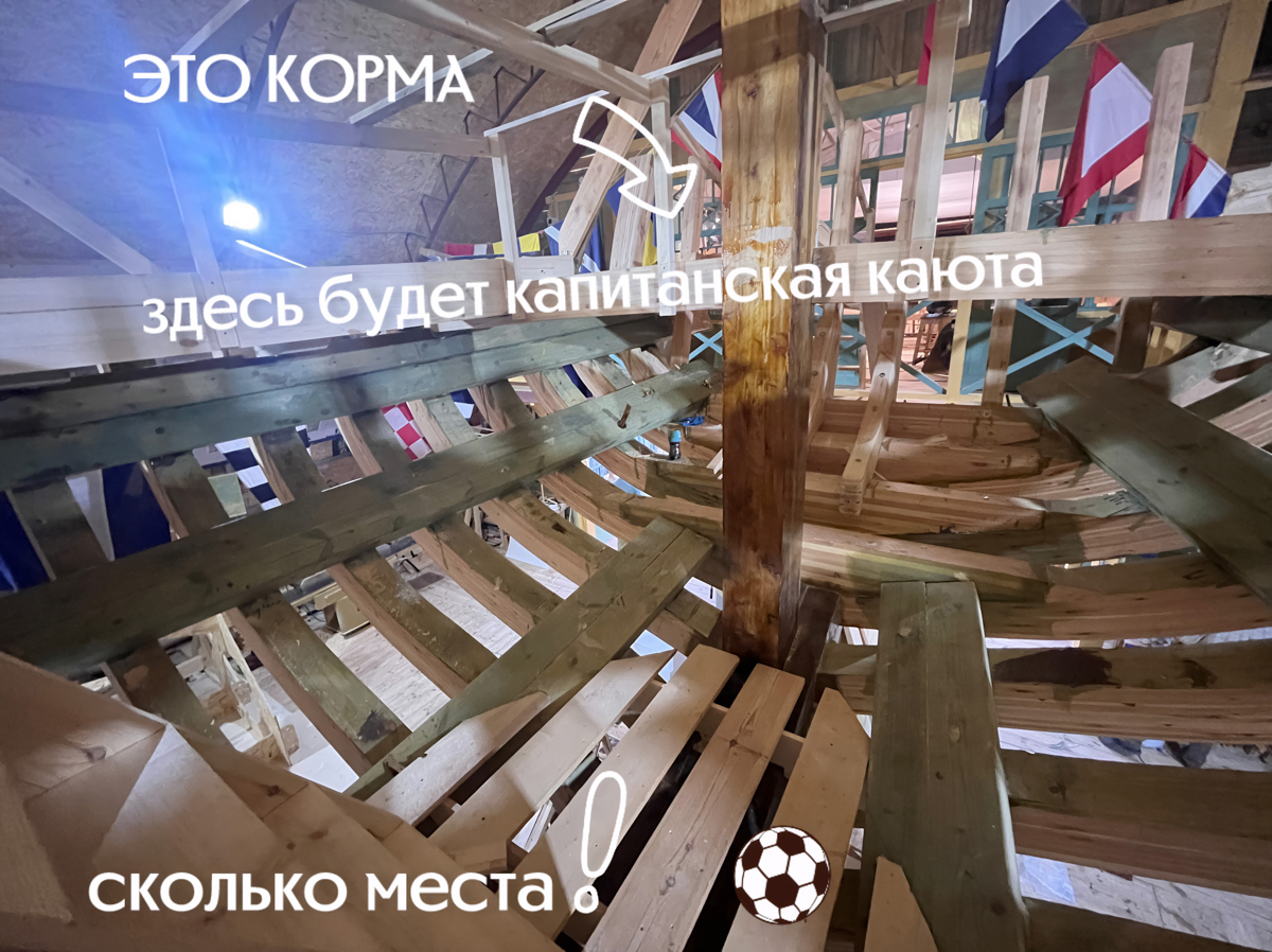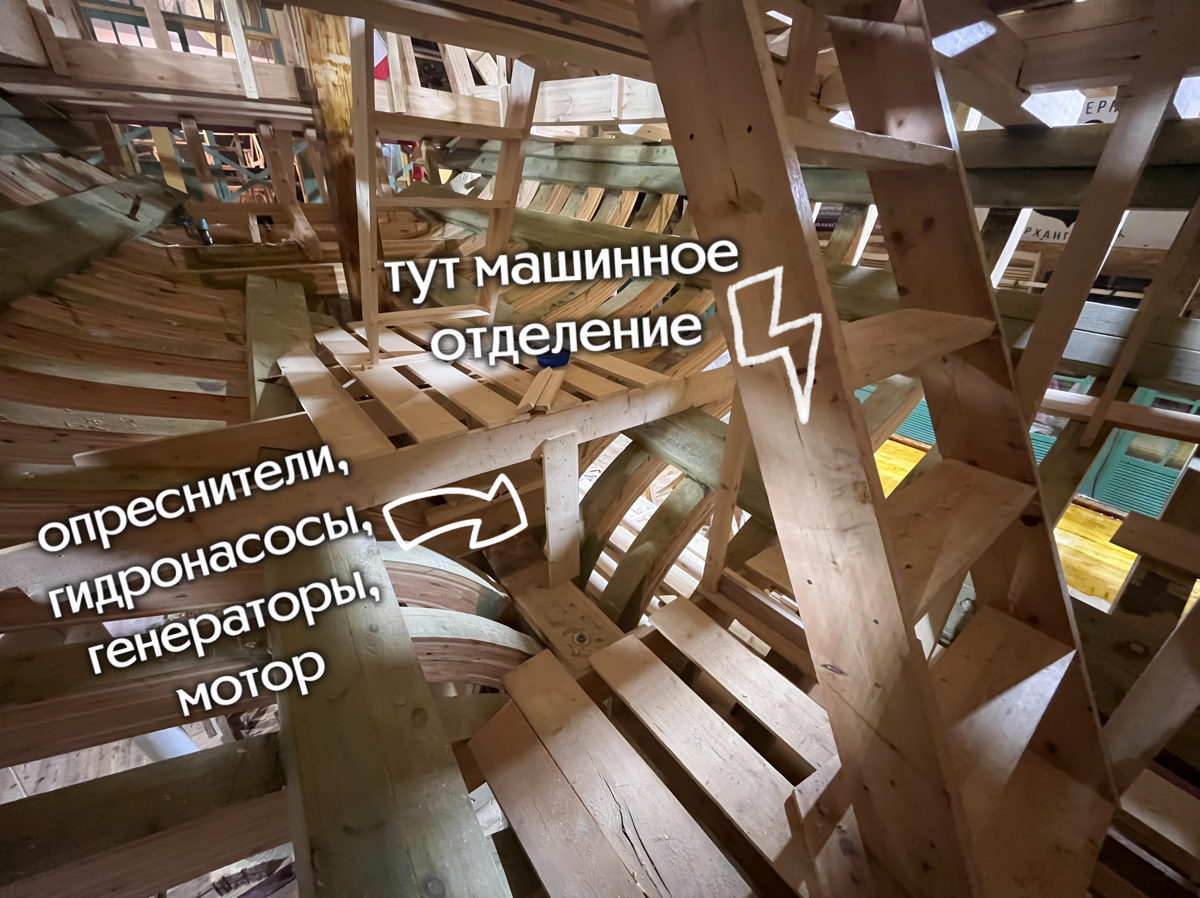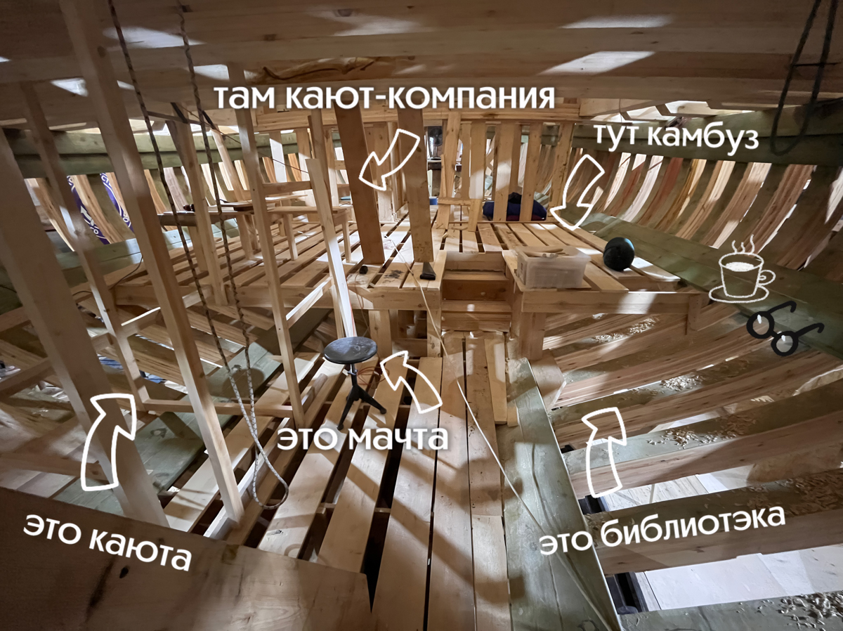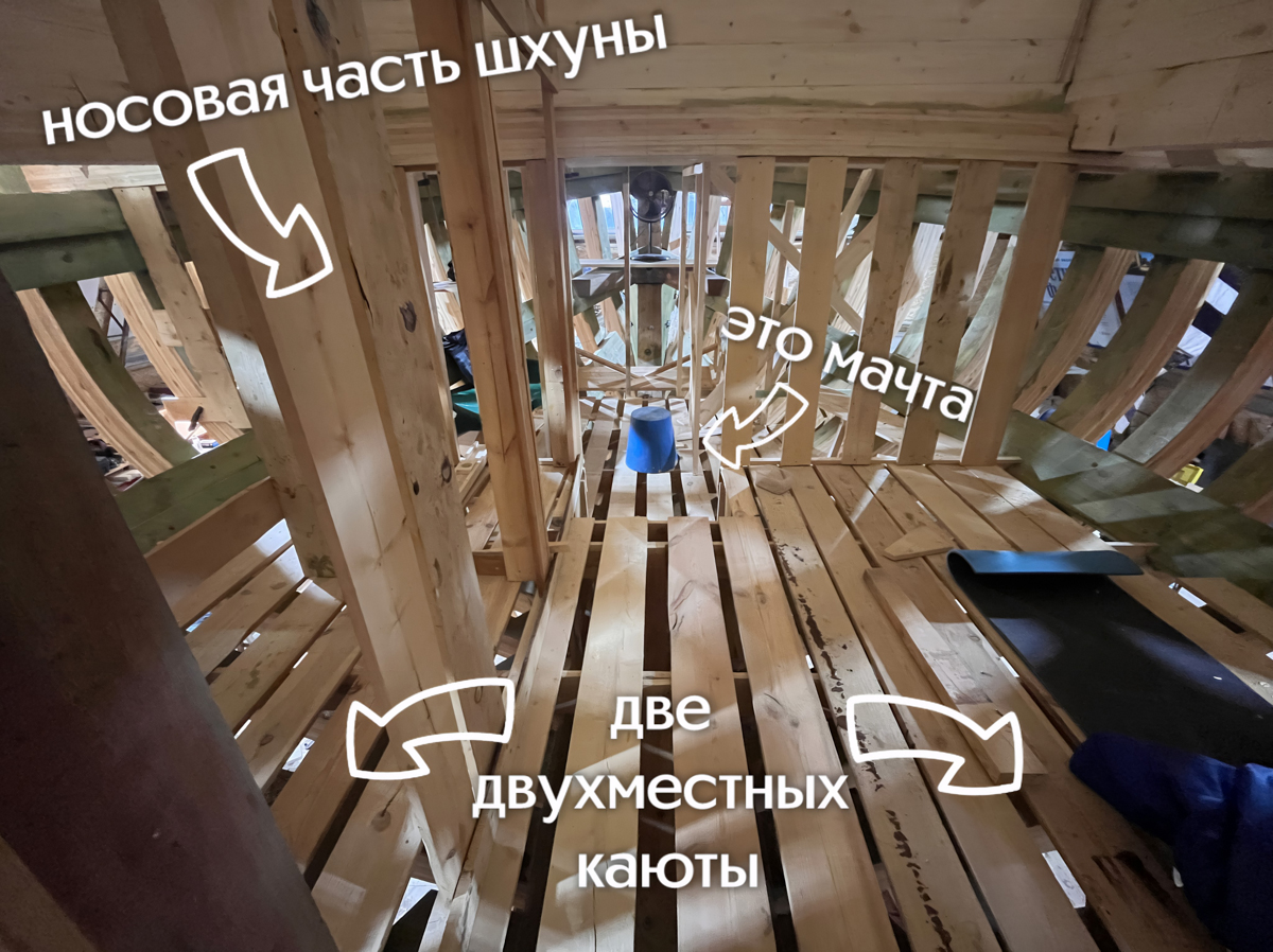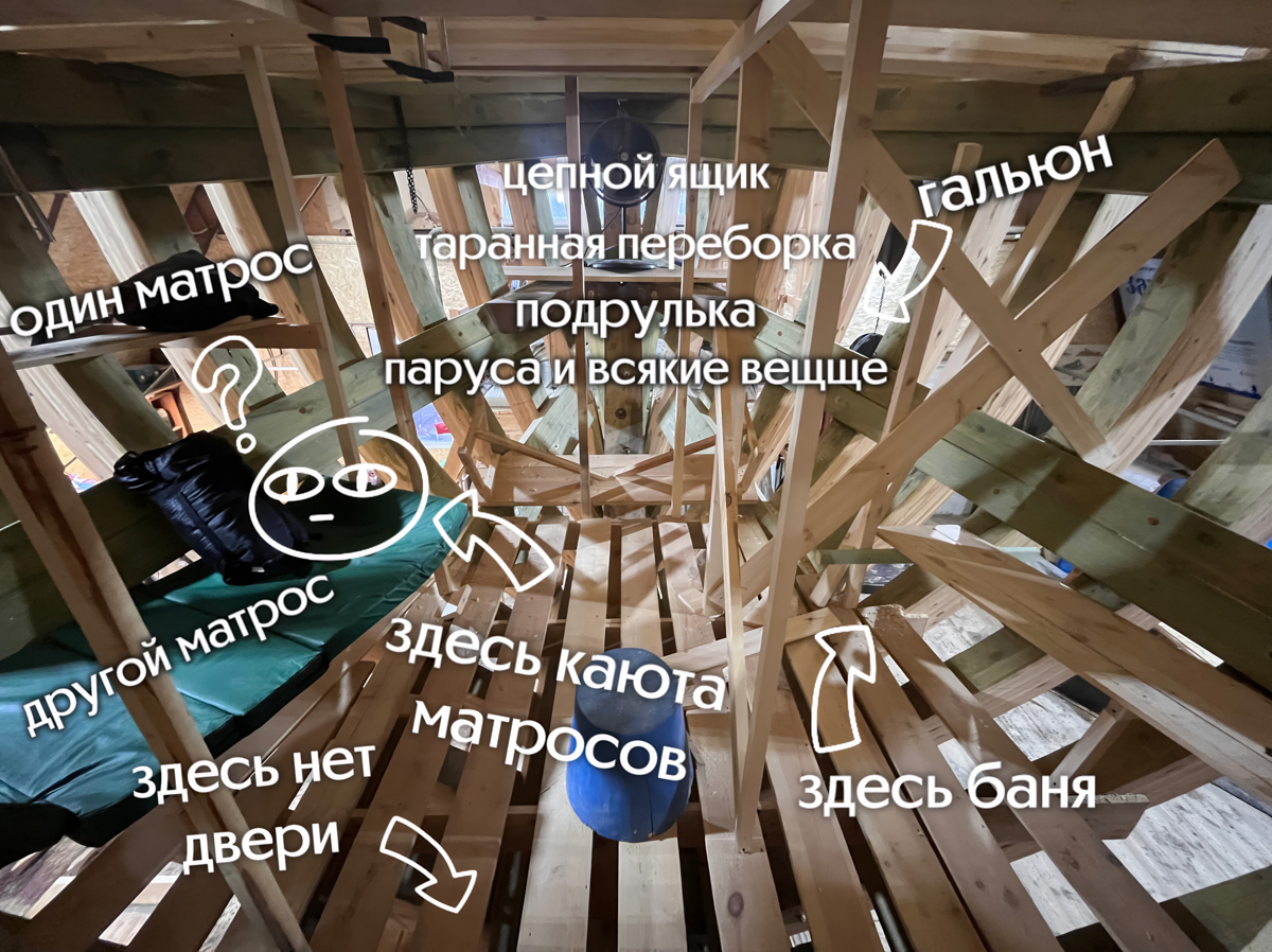 Завершая нашу экскурсию, мы, наконец, оказываемся, в носу шхуны, где находится (цитата!) «каюта матросни». Артём говорит: «Так и было сказано. Так и было сказано, на минуточку!» И ещё говорит: «Здесь будут сложены паруса, верёвки, матросы и всякая хрень».