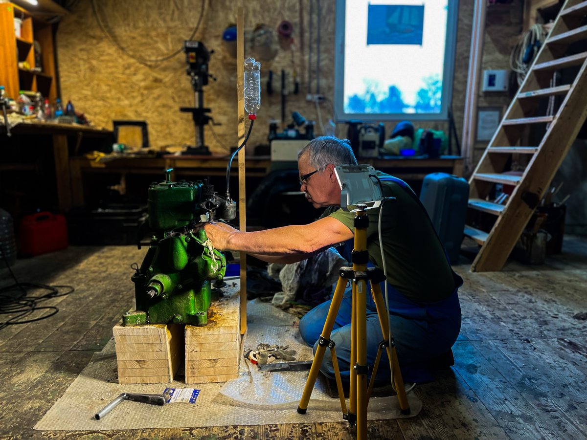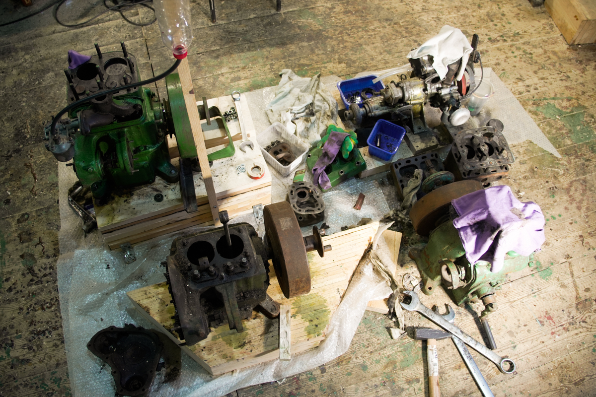 Точнее, собирает один рабочий мотор из трёх нерабочих. Сначала из трёх (двух Л6 и одной «топ-ноги»), потом из четырёх (Тёмин Л3), потом к ним добавляется пятый — Вольво Пента шестидесятых годов (им все восхищаются и трогают его шильдики).