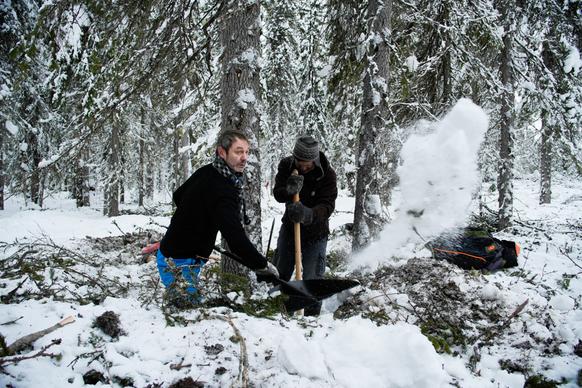 Миша, в свою очередь, привез туристов из Russia Discovery. С ними мы: строили фанерный карбас, копали кокоры, рубили деревья в заснеженном лесу, ездили в Малые Корелы, обедали ухой на лесной делянке, ужинали поморскими ужинами и прочее.