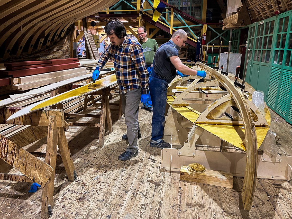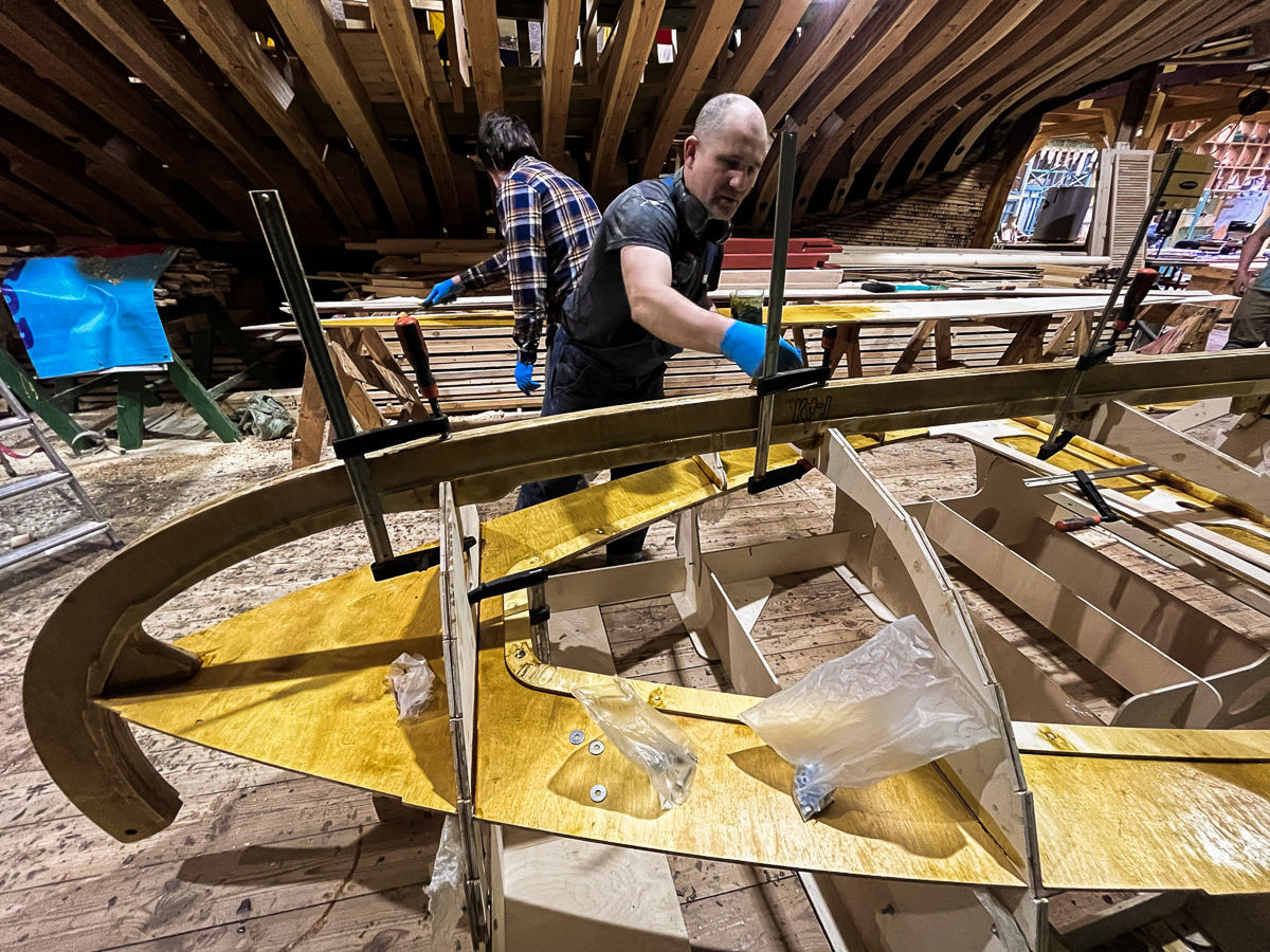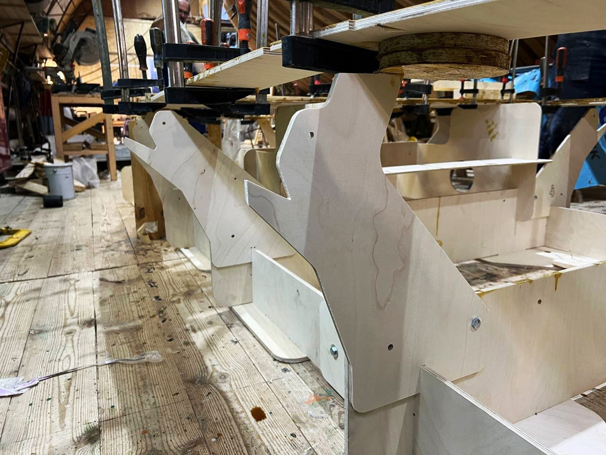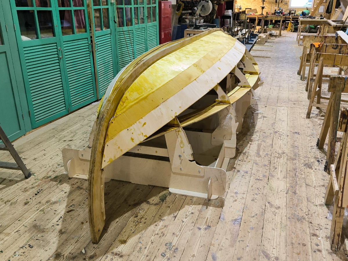 В условиях судоверфи, под руководством мастера фанерного судостроения, при наличии опытных судовых плотников, а также группы волонтёров и студентов-практикантов мы справились с постройкой за 5 неполных рабочих дней, не особенно напрягаясь и не спеша (за это время мы собрали весь корпус, для окончательной готовности лодку нужно только очистить от смолы, немного пошпатлевать и покрасить).