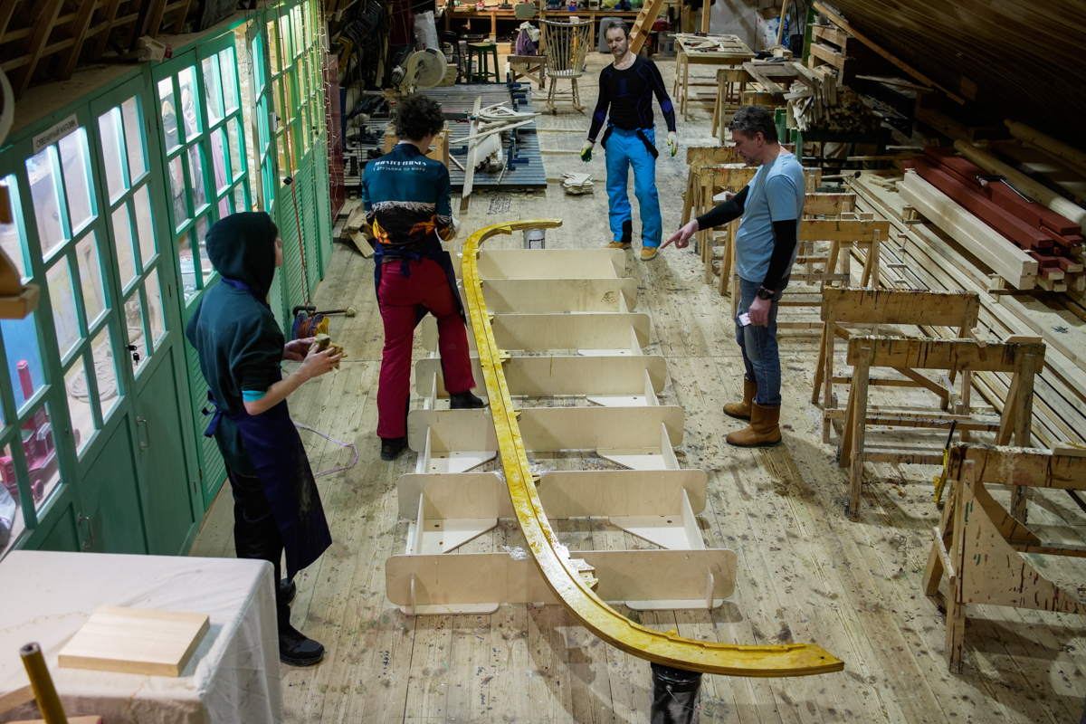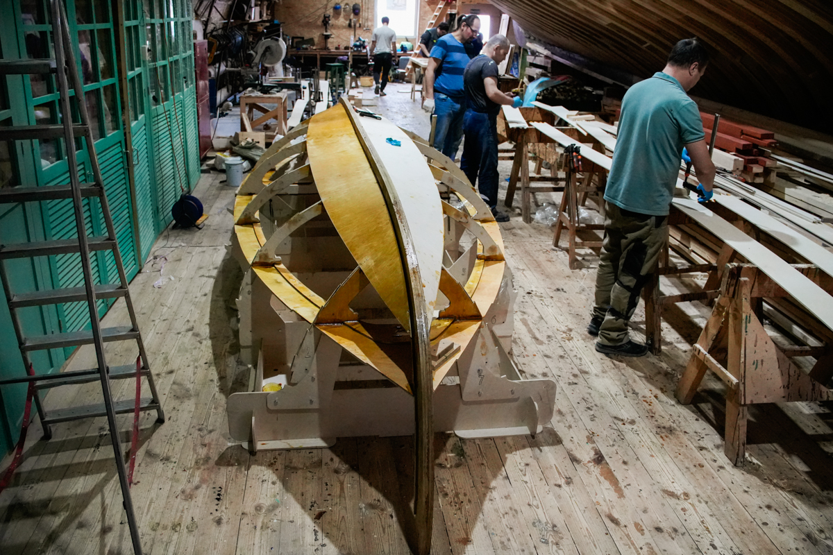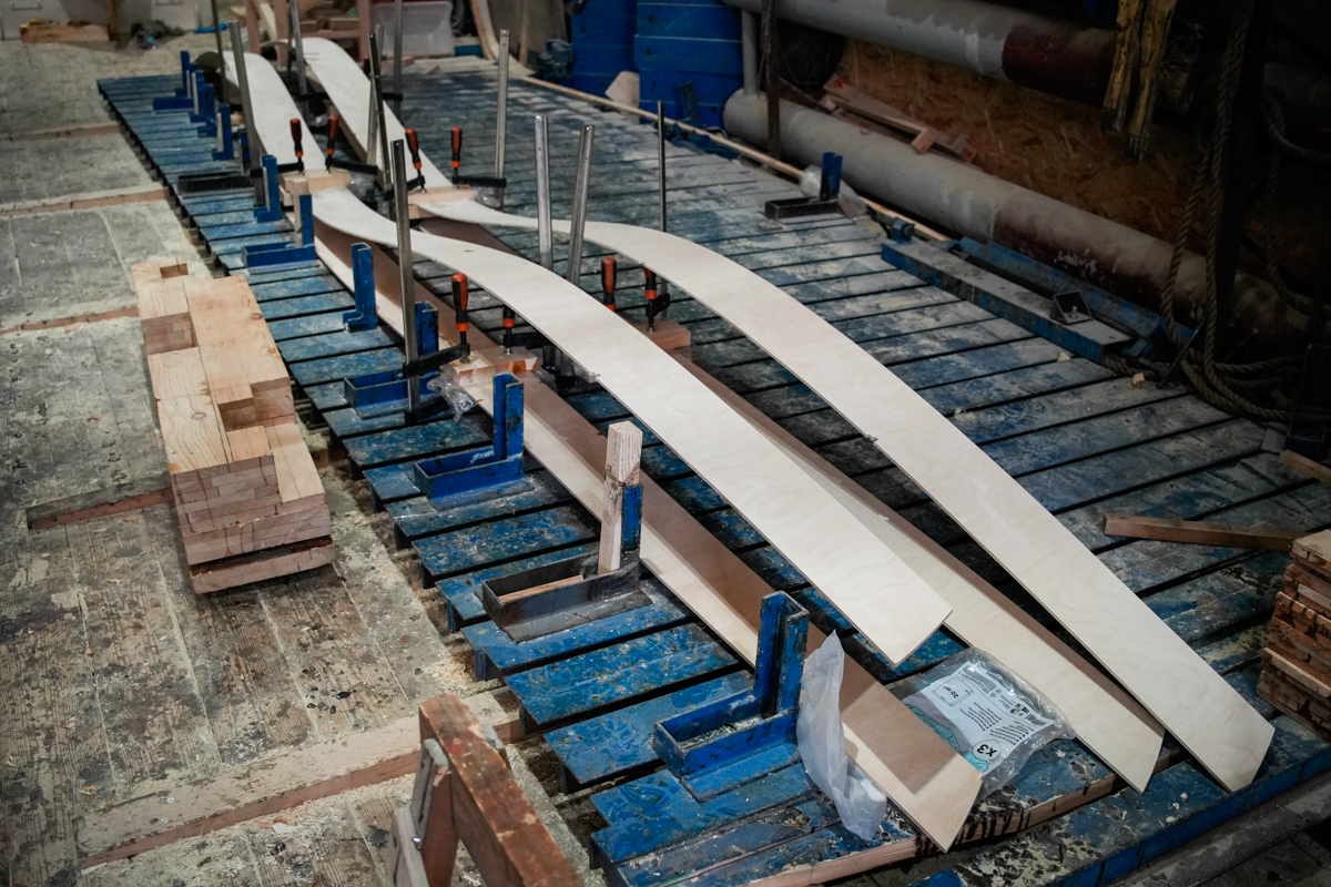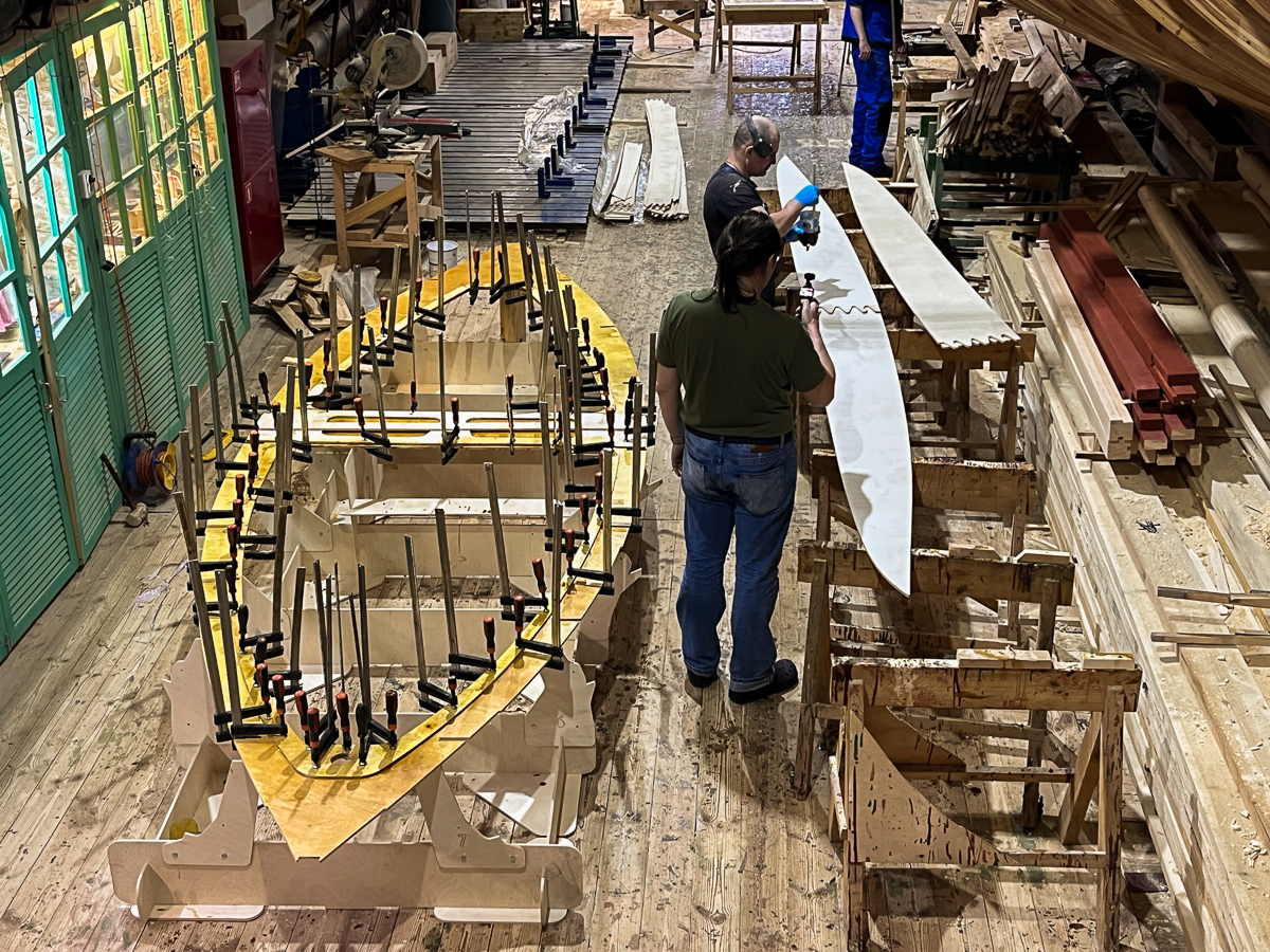 В условиях судоверфи, под руководством мастера фанерного судостроения, при наличии опытных судовых плотников, а также группы волонтёров и студентов-практикантов мы справились с постройкой за 5 неполных рабочих дней, не особенно напрягаясь и не спеша (за это время мы собрали весь корпус, для окончательной готовности лодку нужно только очистить от смолы, немного пошпатлевать и покрасить).