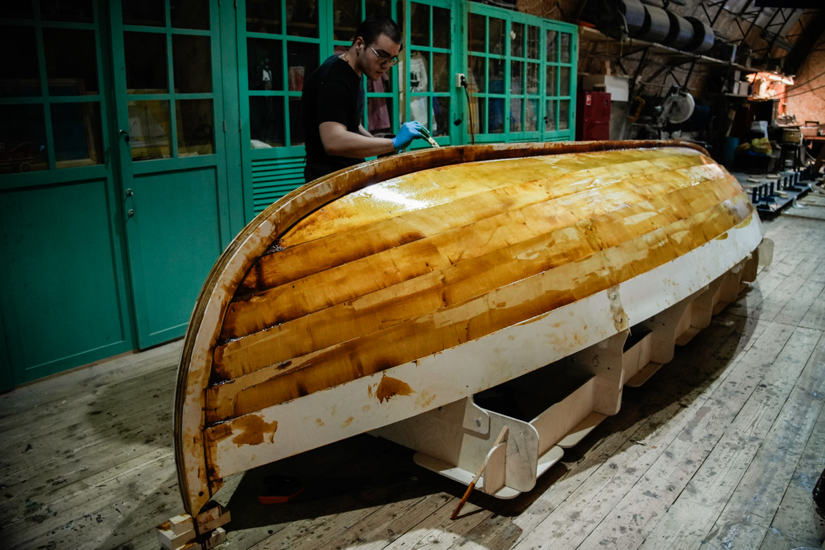 Когда-то Игорь был учеником нашей цифровой Лаборатории деревянного судостроения: вместе с другими участниками проекта (и под руководством нашего инженера Михаила Крупенина) они делали 3D-модели традиционных поморских лодок. Игорь оказался талантливым учеником и придумал, как сделать традиционный деревянный сельдяной карбас из фанеры, вырезая детали лодки на ЧПУ. Потом всё это спроектировал — и построил. И спустил на воду.