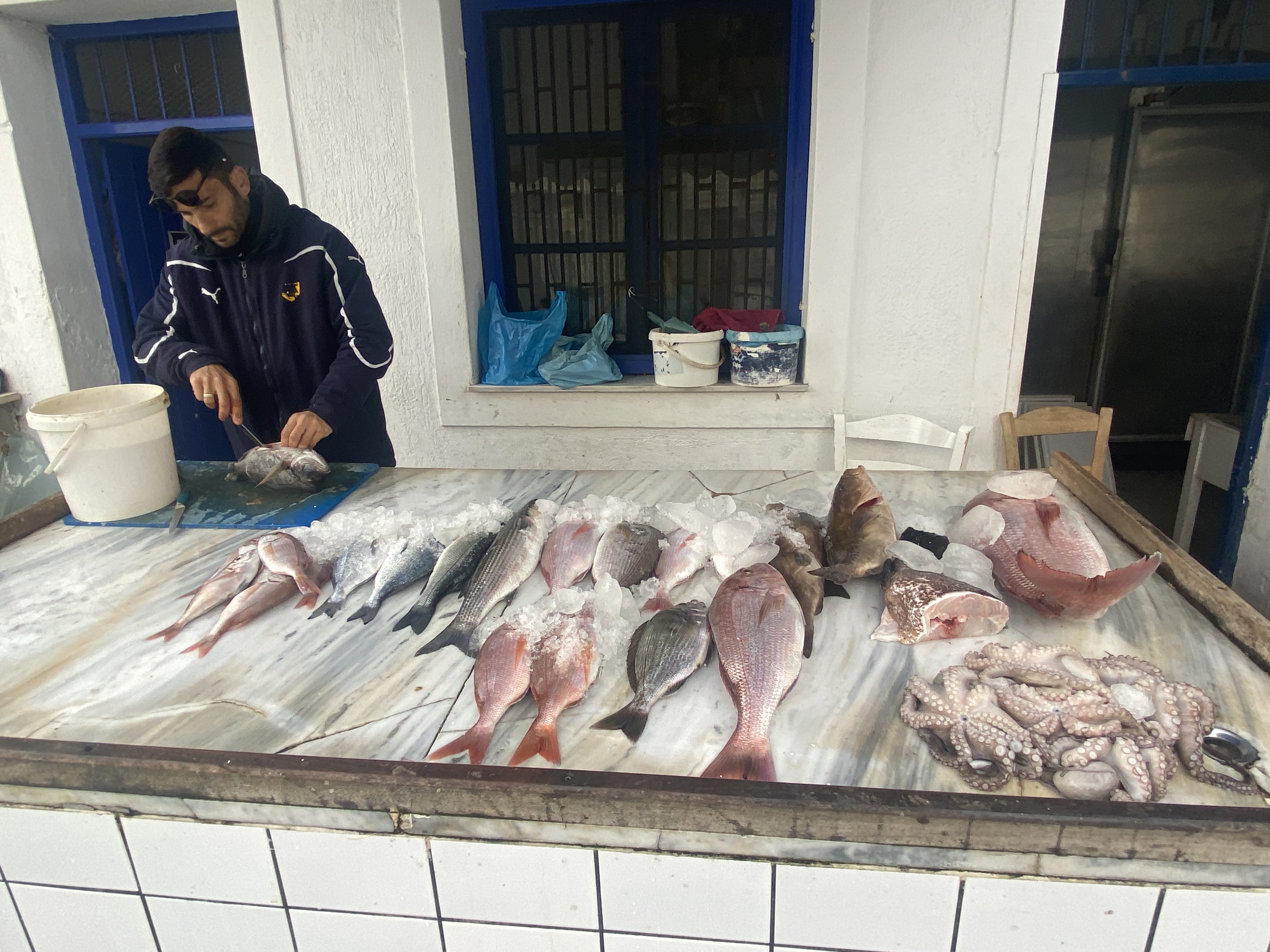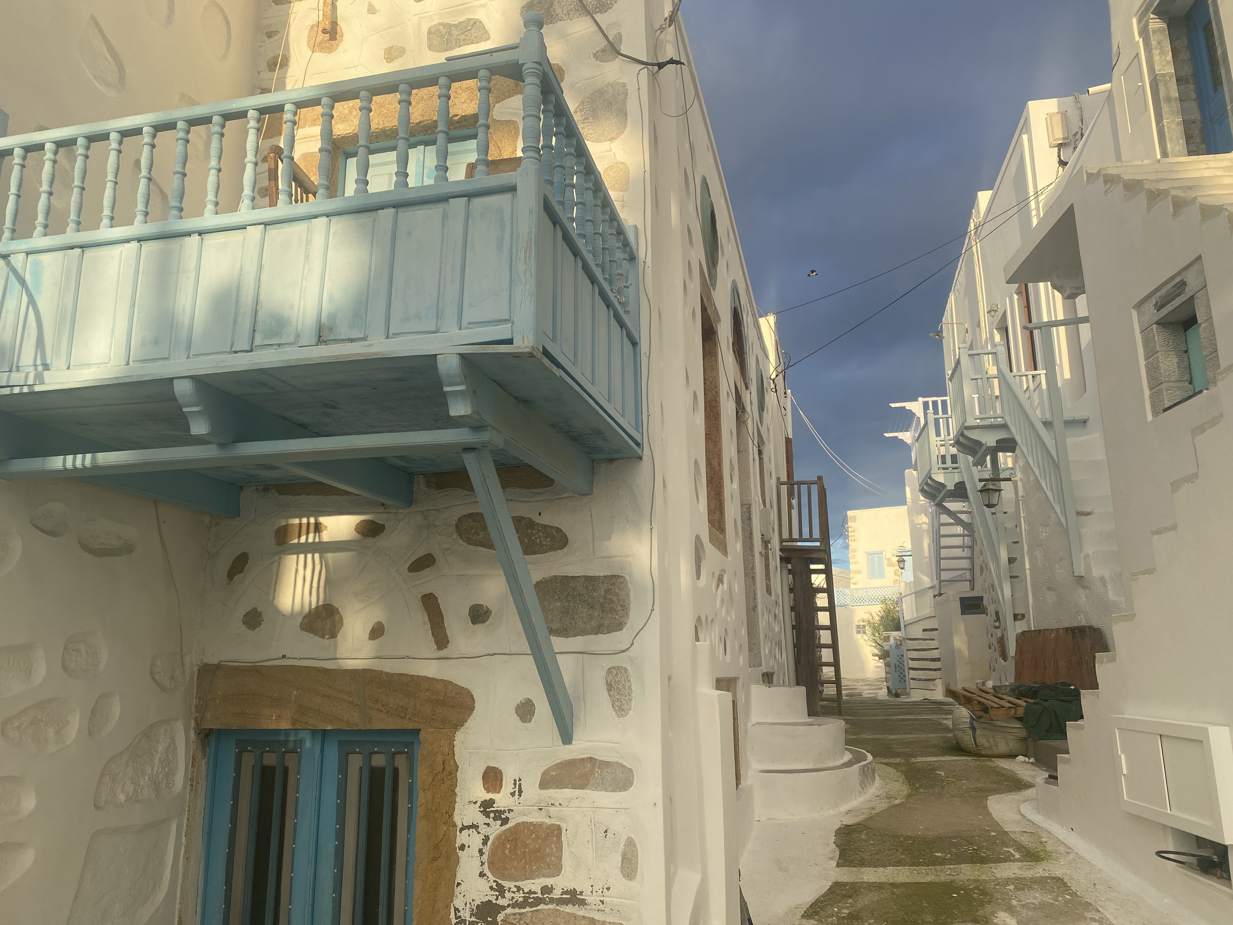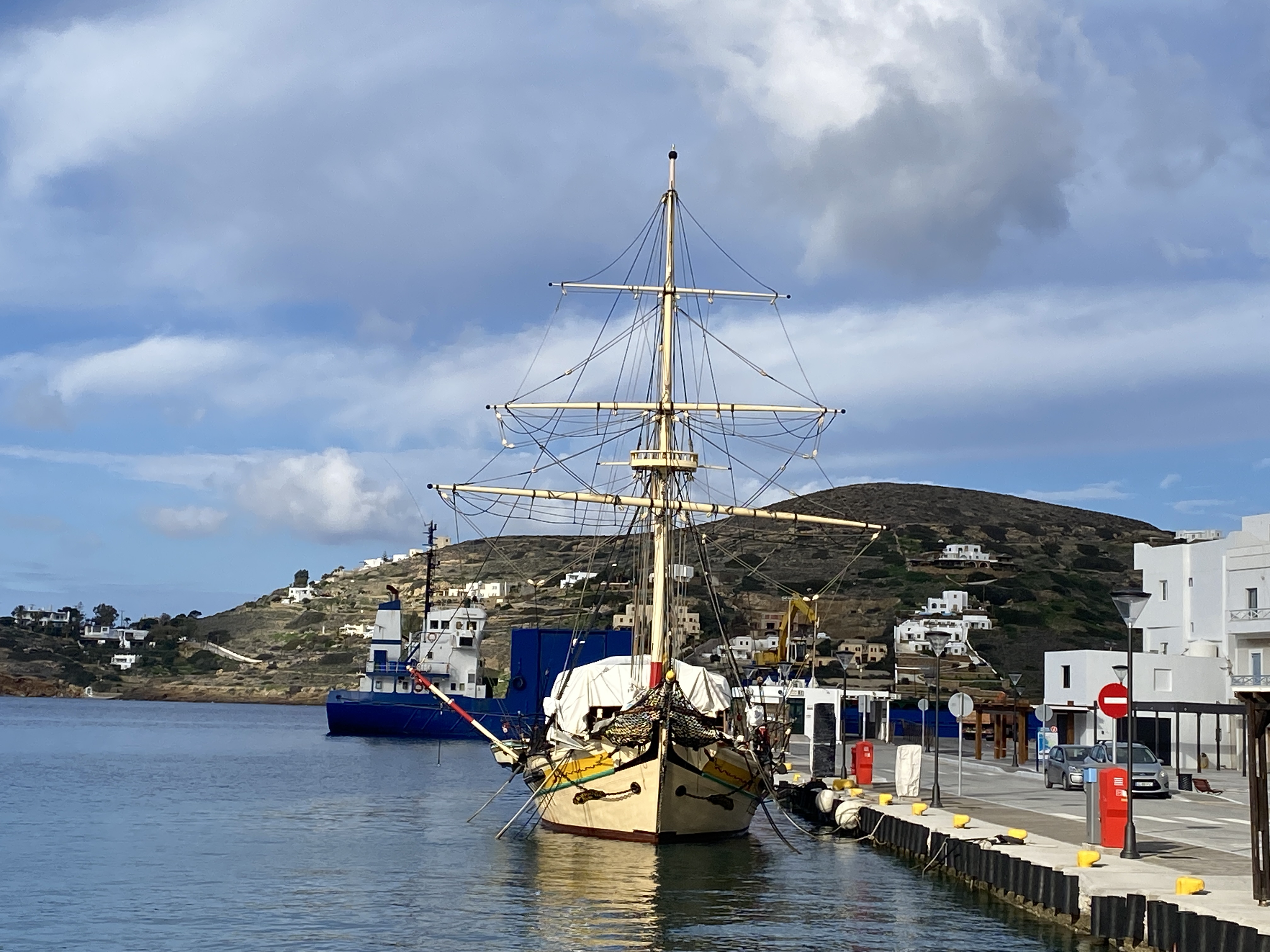 0255, встали у пустынной стенки на острове Иос. Видно, что стенку недавно реконструировали. Стоят современные колонки с электричеством и водой. Чтобы их подключить, нужно заплатить. Казалась бы, чего проще? Но для этого все равно нужен человек. А он зимой не хочет работать. Поэтому нам приходиться проверять все колонки в округе, чтобы найти на какой-нибудь из них остатки депозита предыдущего экипажа, зарядить аккумуляторы и, главное, налить воду в бак.