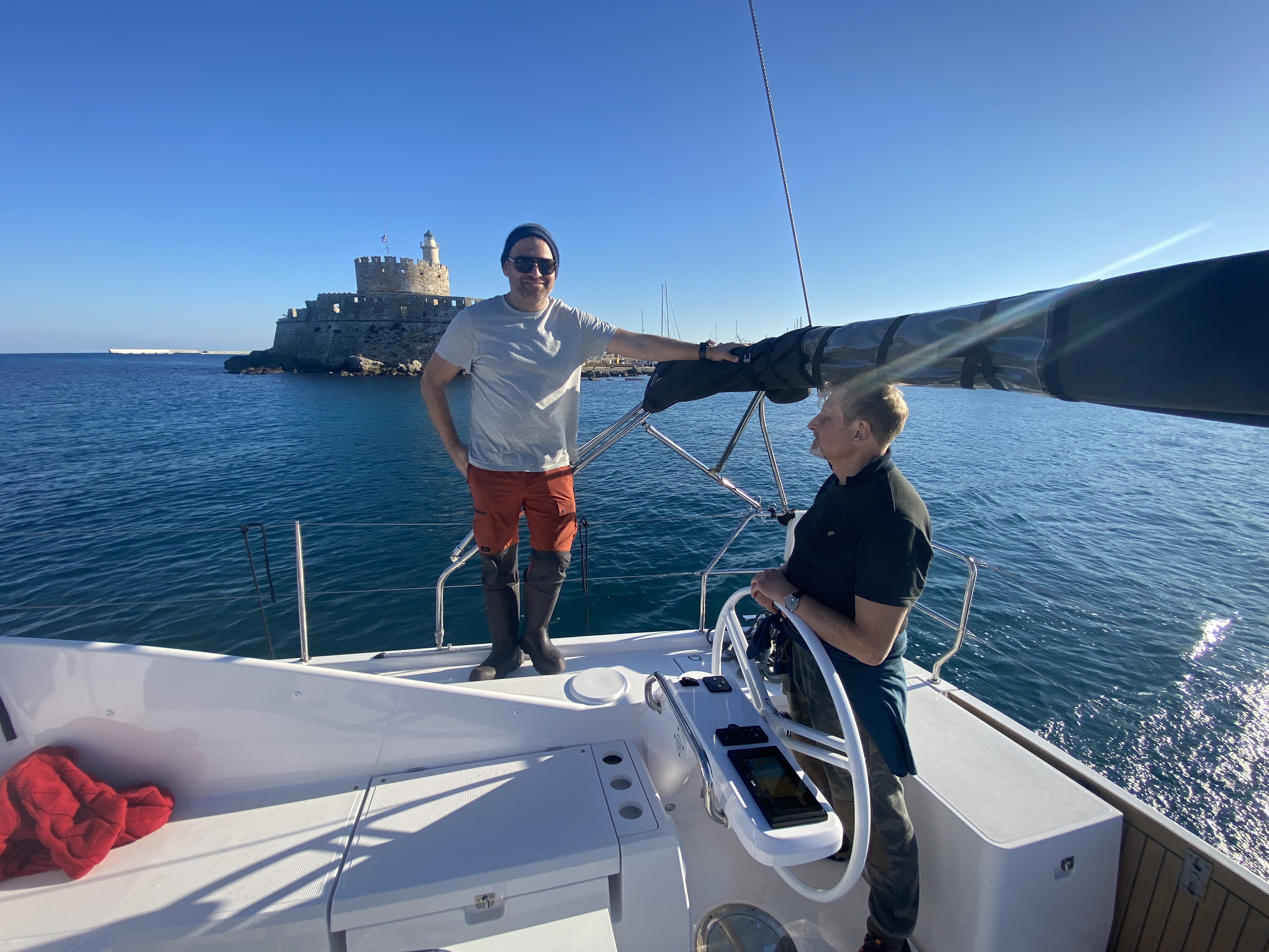 1215, пришли на север Родоса. Напоследок решили поиграть и пришвартоваться под парусом, без мотора. Неожиданно попутный ветер усилился. Но мы справились. Прямо в бухте, стремительно развернулись на 360 градусов, сбросили этим маневром скорость и скинули грот. Дальше, подгоняемые ветерком, проходя мимо заправочного пирса, накинули на кнехт швартов и так встали. Плавание закончилось. Прибрались и пошли гулять. Посмотреть старый город и крепость Тамплиеров под руководством Сергея, который здесь отдыхал и жил несколько лет.