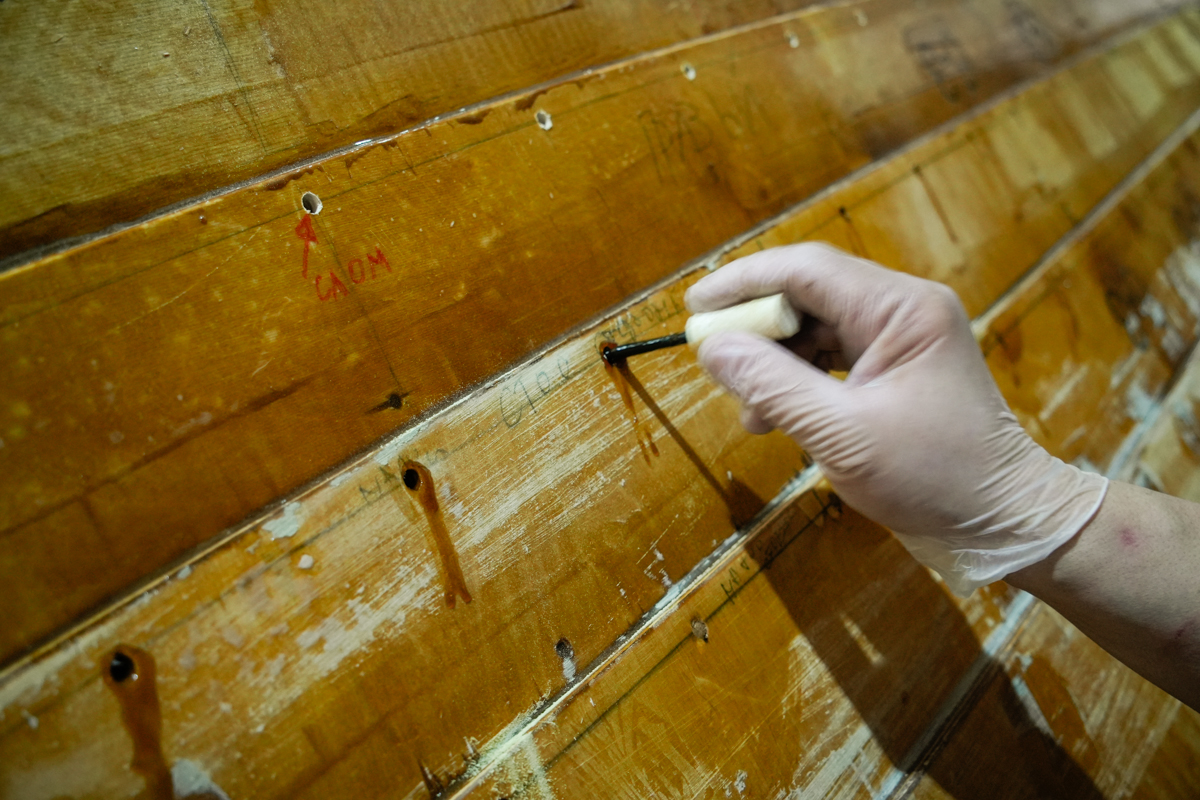 При установке обшивки набои, во-первых, склеивались между собой на смолу с аэросилом, а во-вторых, крепились друг ко другу саморезами. Теперь мы меняем саморезы на чопики. Почему? Потому что это были временные, рабочие, так сказать, саморезы. Они, конечно, крепят пояса обшивки, но никак не смогут защитить её от воды и гниения. По резьбе в обшивку будет заходить вода, сам саморез станет ржаветь… И даже если взять нержавеющие саморезы, то вкрутить 1400 таких штуковин в лодку — далеко не лучшая идея.