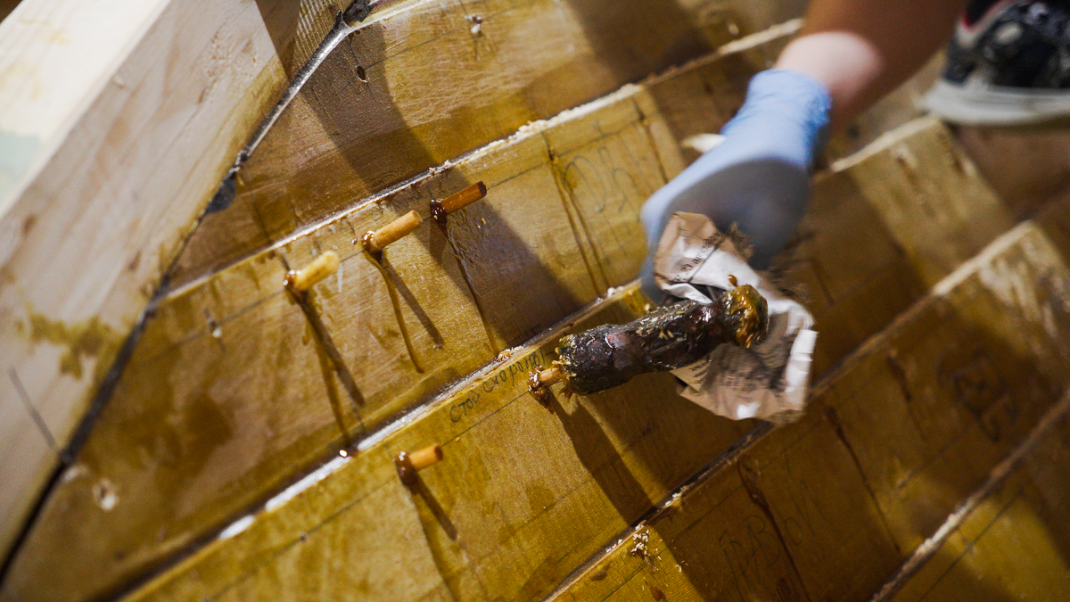 За бортом апрель, дети на верфи продолжают строить ёлу. Обшивка лодки собрана, теперь, чтобы защитить её от воды, гниения и прочих неприятных вещей, нужно а) заменить саморезы на чопики со смолой, б) зашпаклевать лодку. Но обо всём по порядку.
