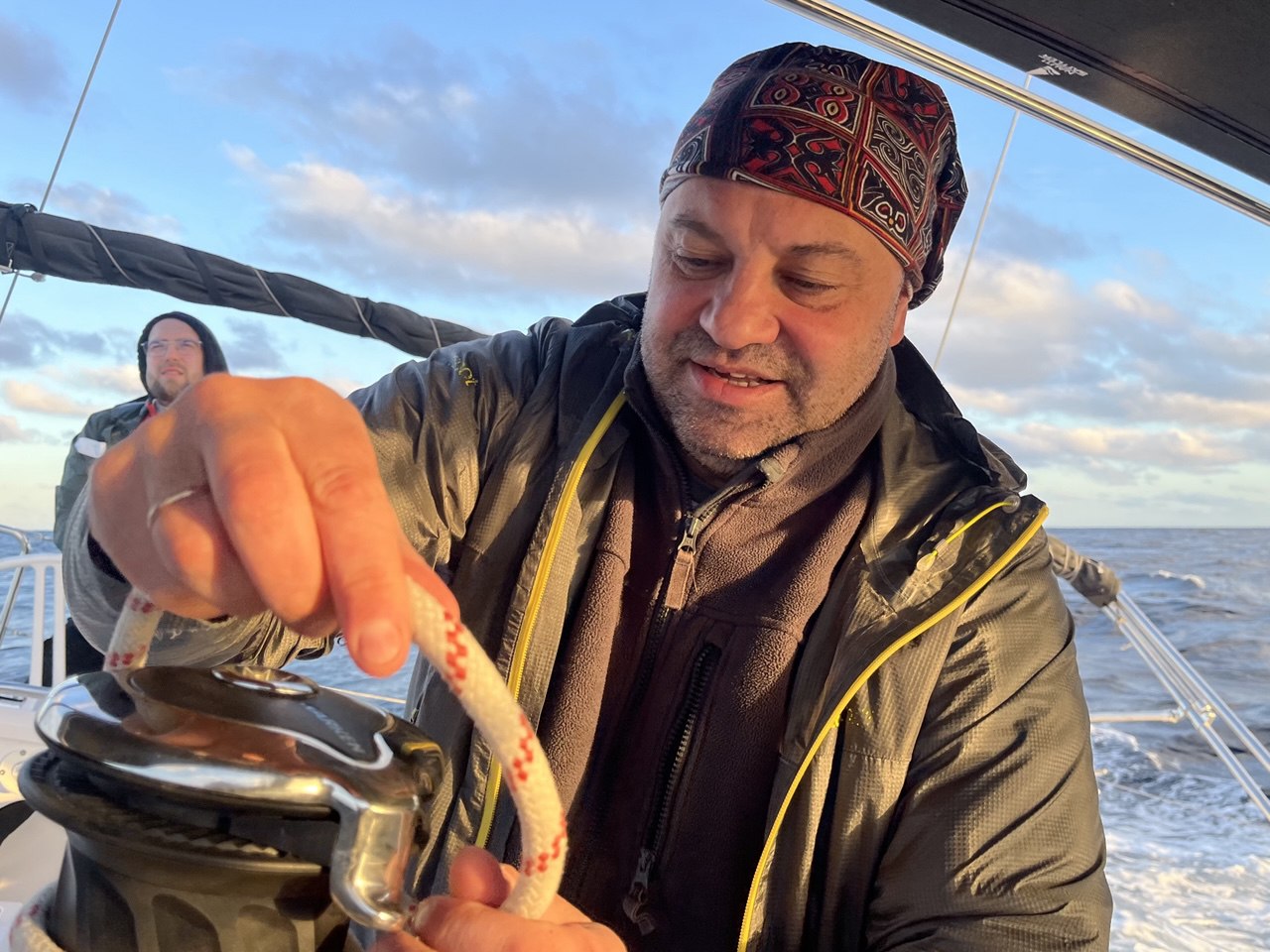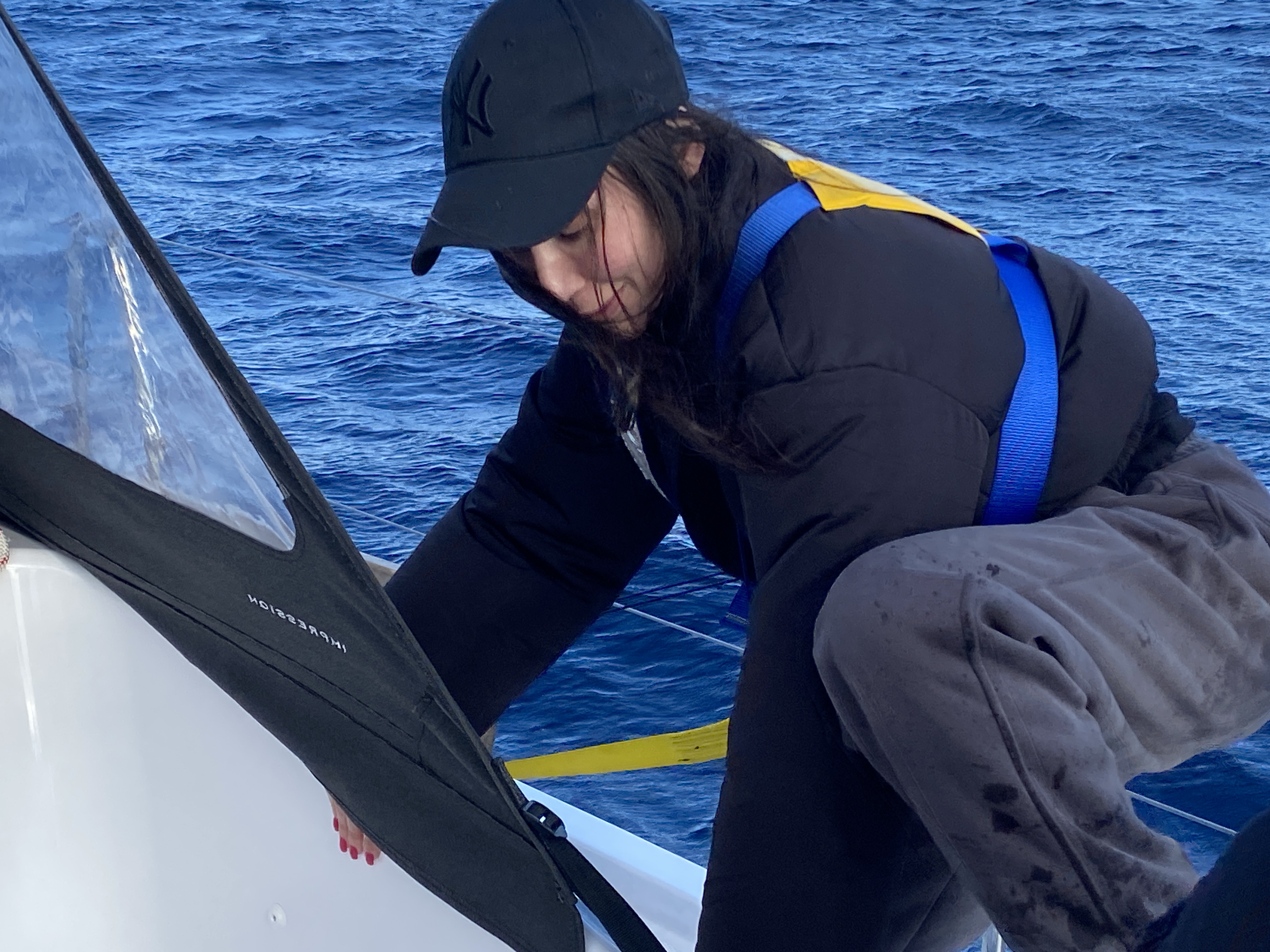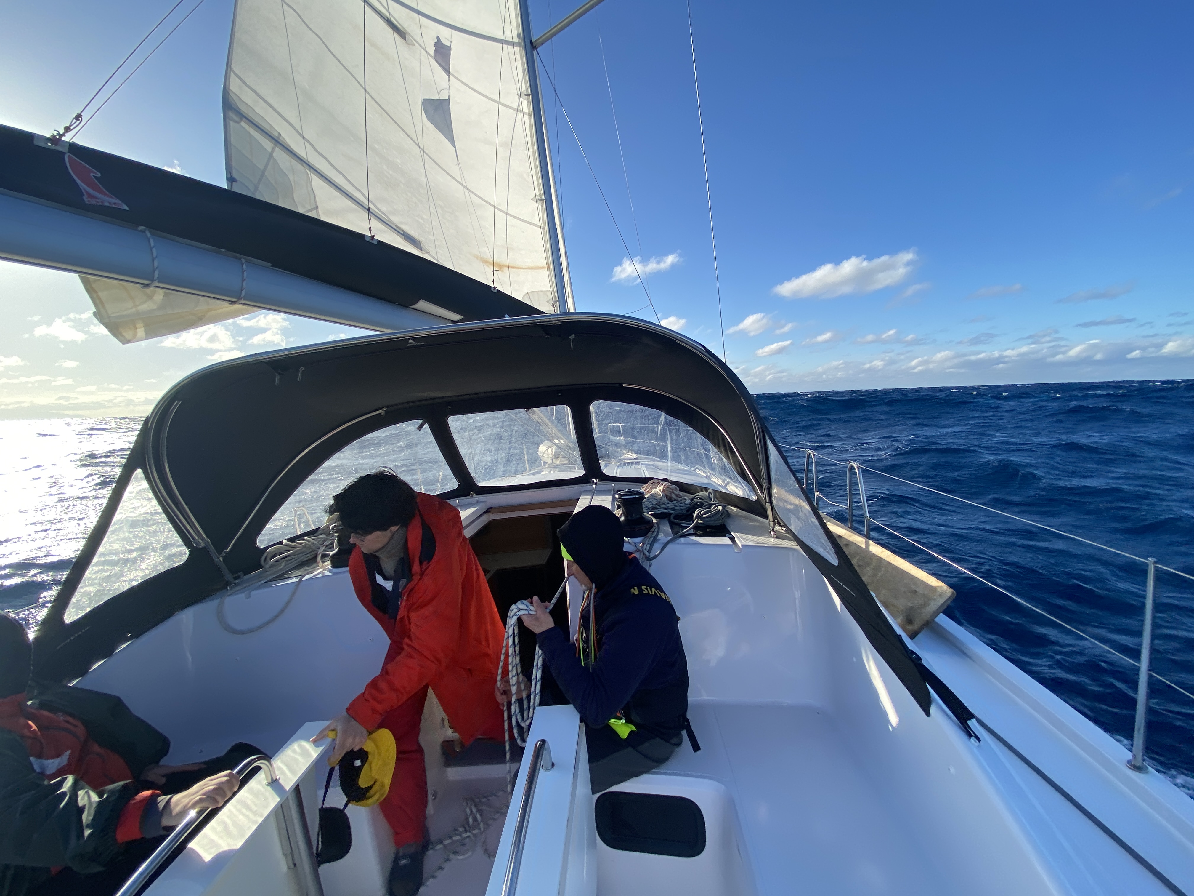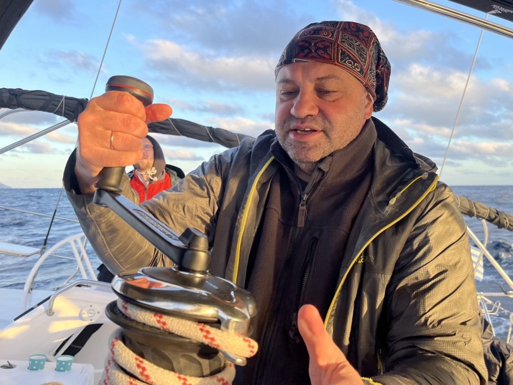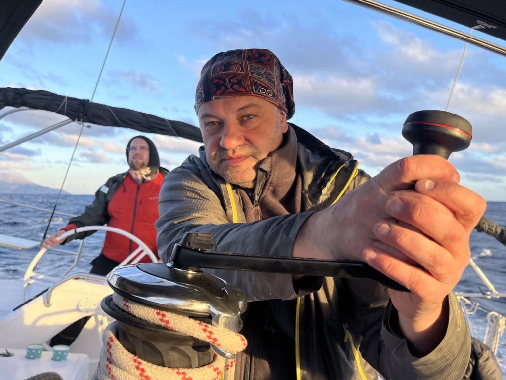 12:08 — закончили набирать высоту, уваливаемся на правый галс, взяли на гроте на первый риф и заглушили двигатель.
