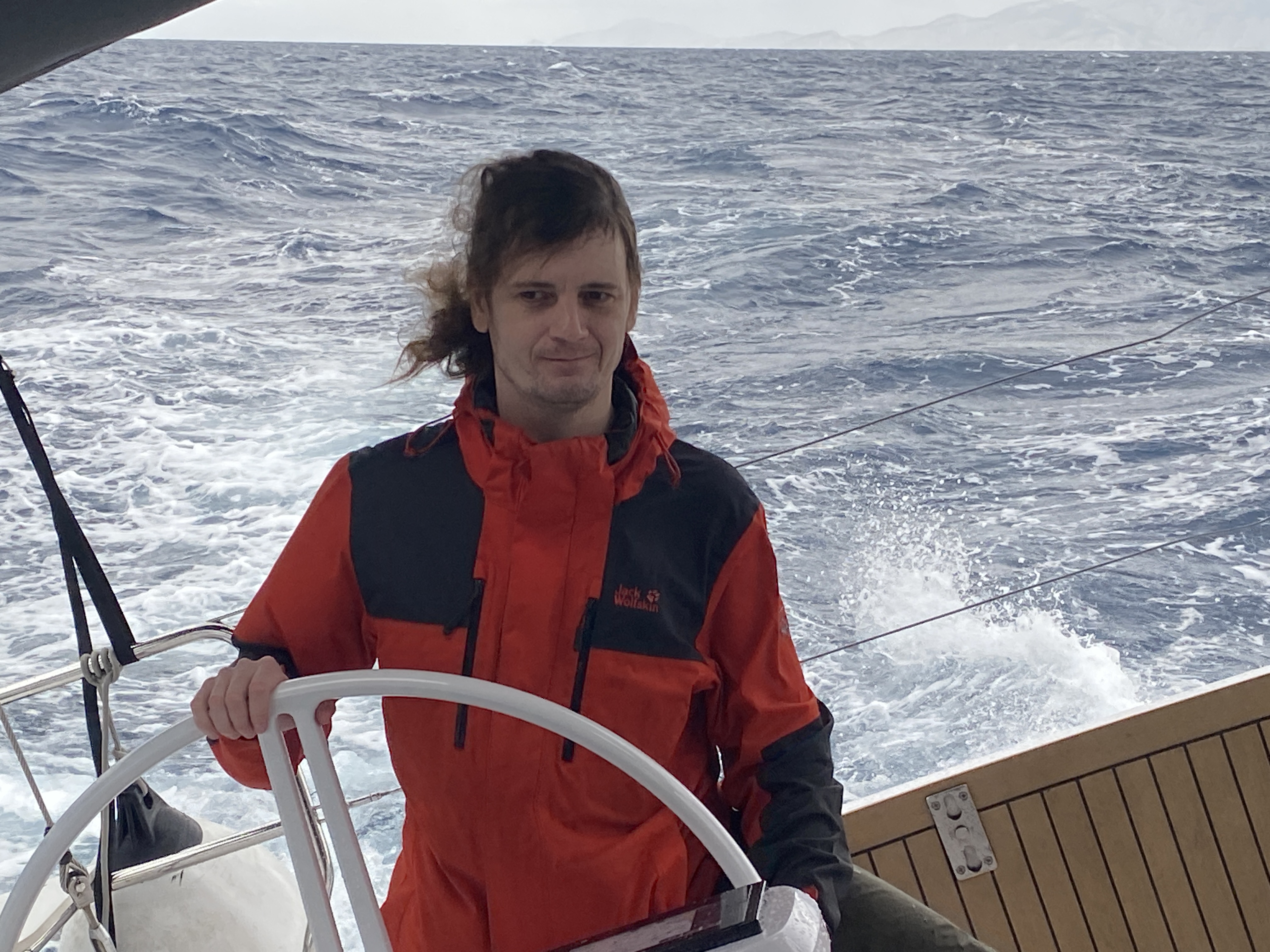 08:40, под половиной стакселя идем до 9,5 узлов. Полный галфвинд. Яхта скачет. Кокпит и всех нас регулярно омывает волна. Восторг!
