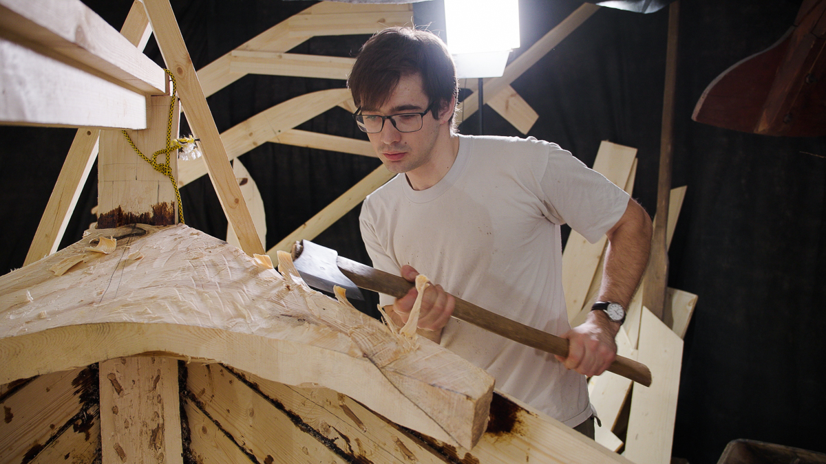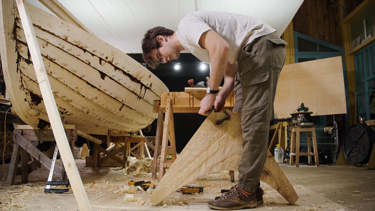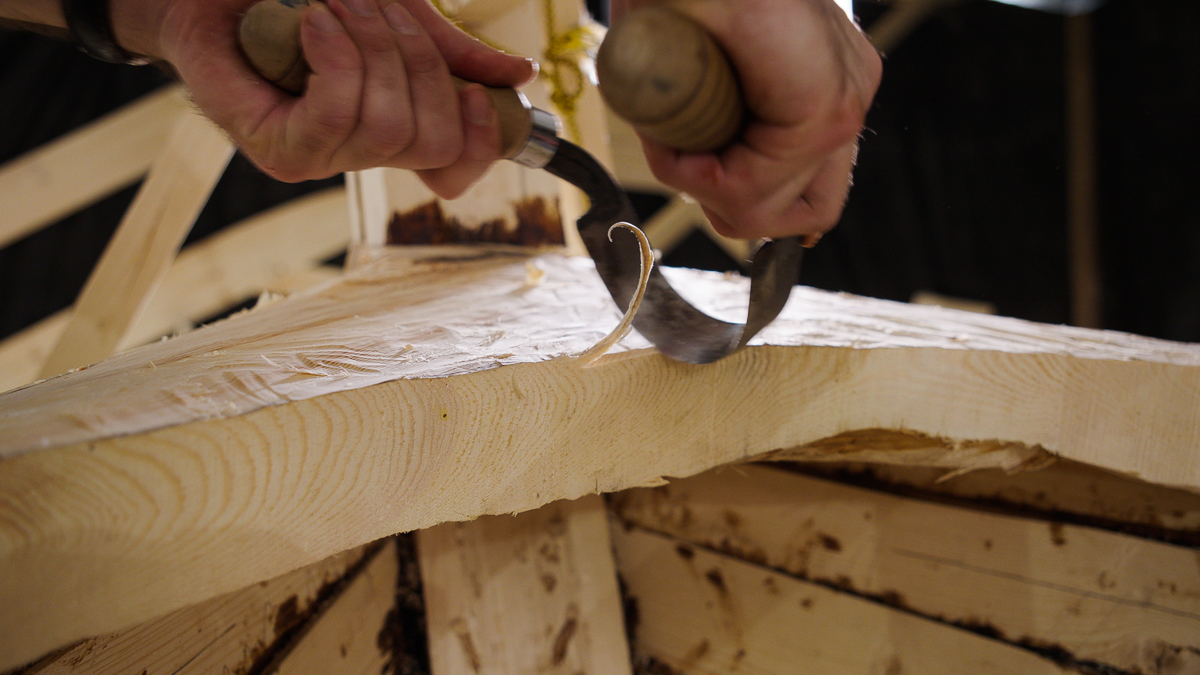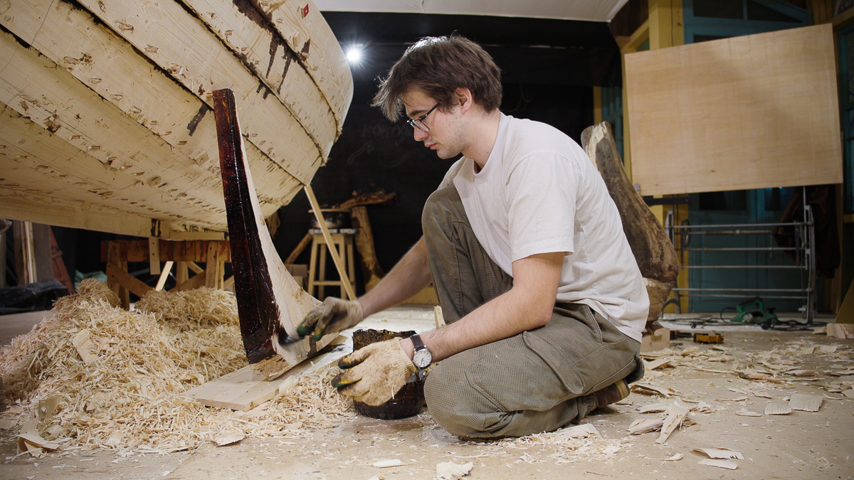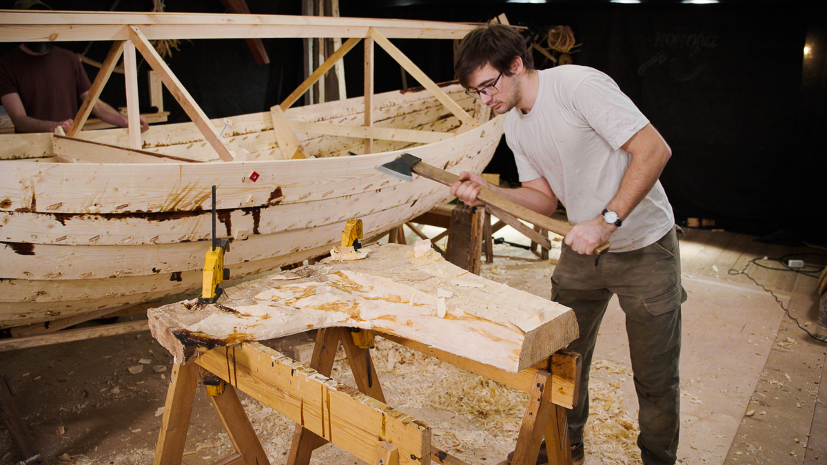 Иван выбирает две подходящих по форме кокоры и вытёсывает заготовки носового и кормового брештуков топором, скобелем, стругом и рубанком.