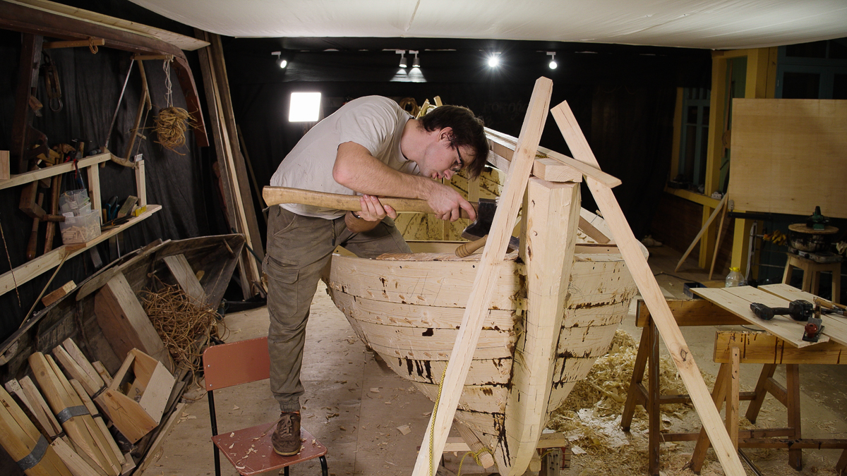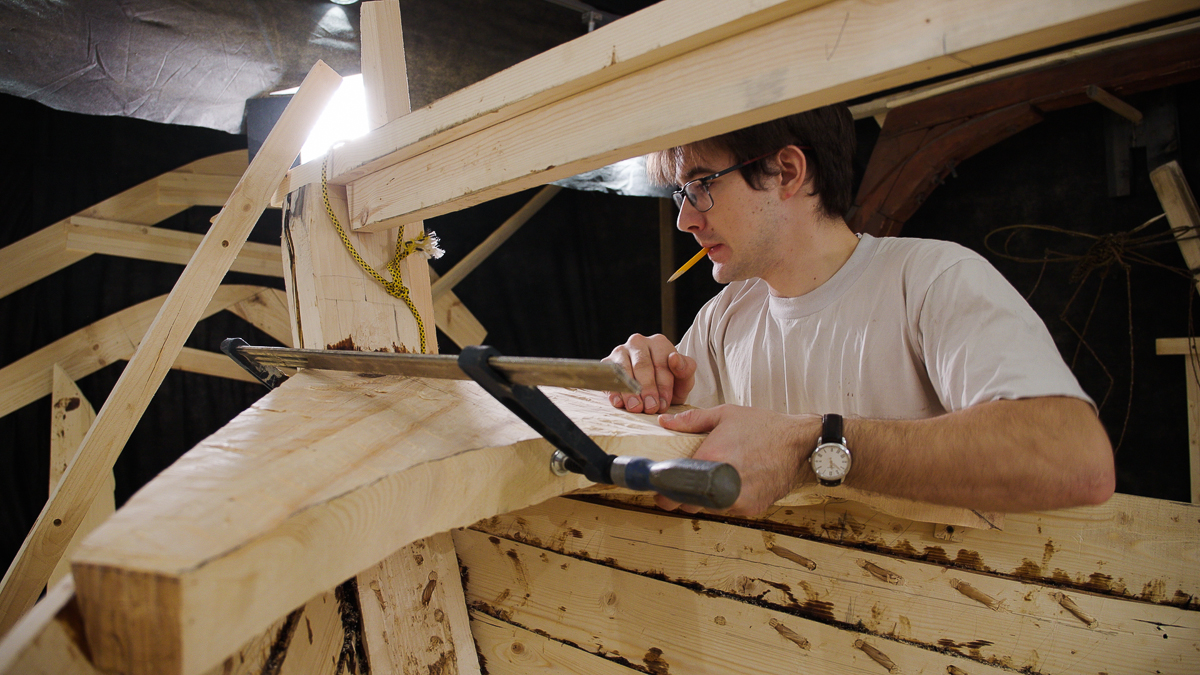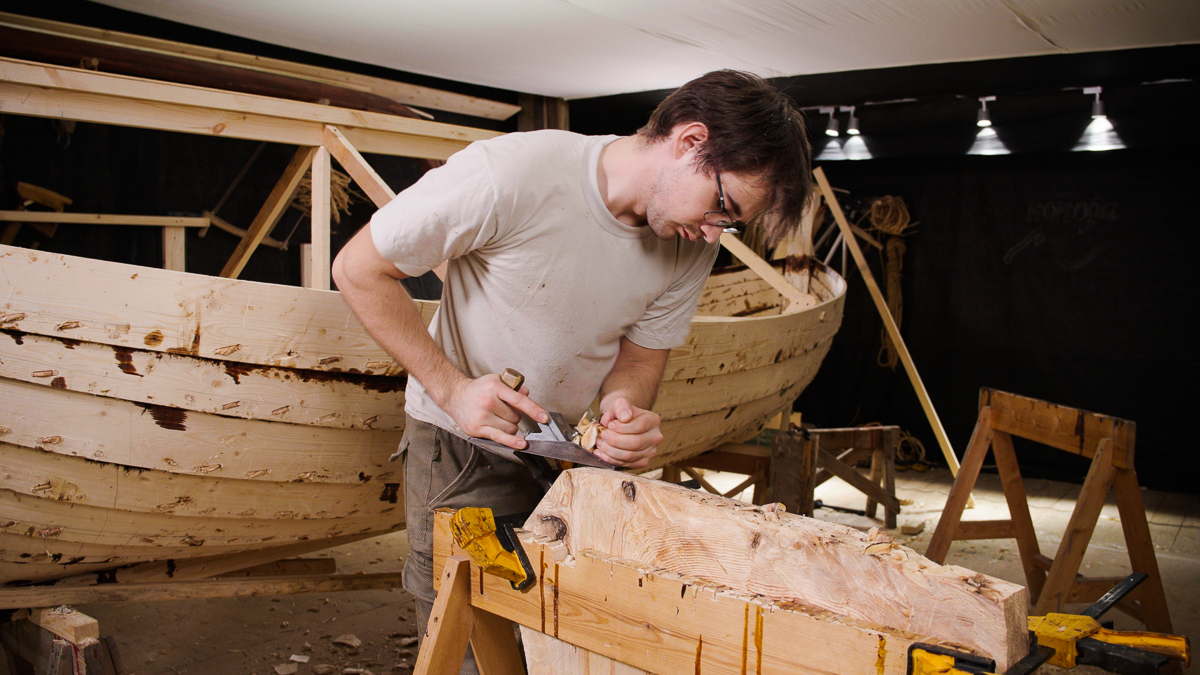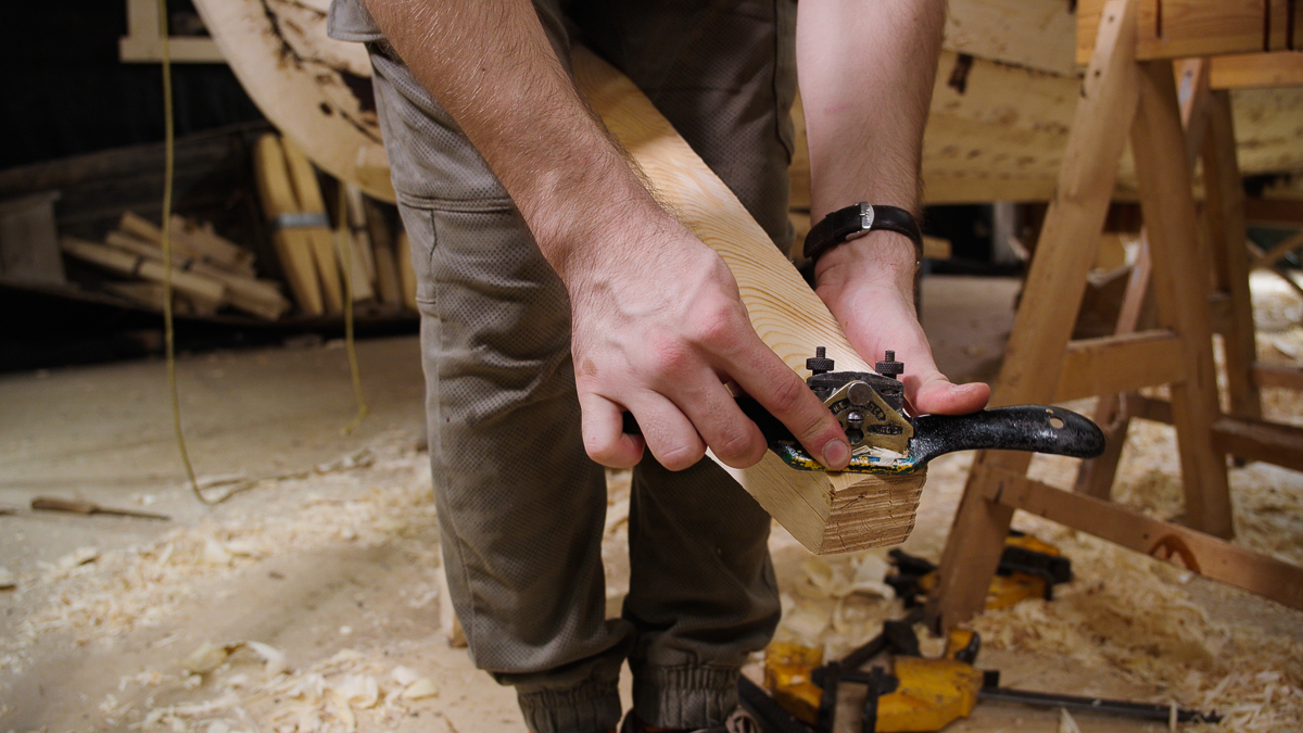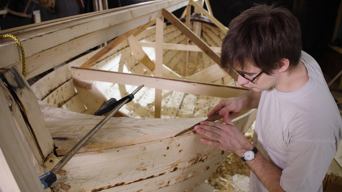 Иван выбирает две подходящих по форме кокоры и вытёсывает заготовки носового и кормового брештуков топором, скобелем, стругом и рубанком.