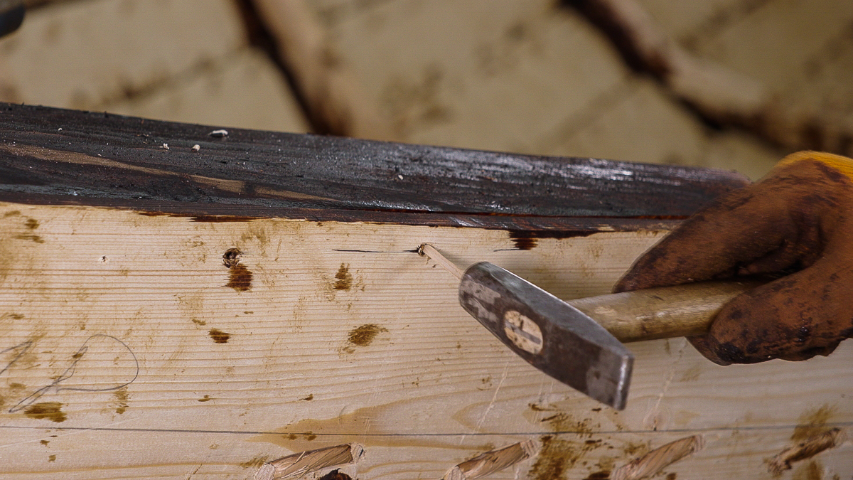 Далее брештук крепится к штевню при помощи нагеля с клинышками по торцам (также обработанного смолой).